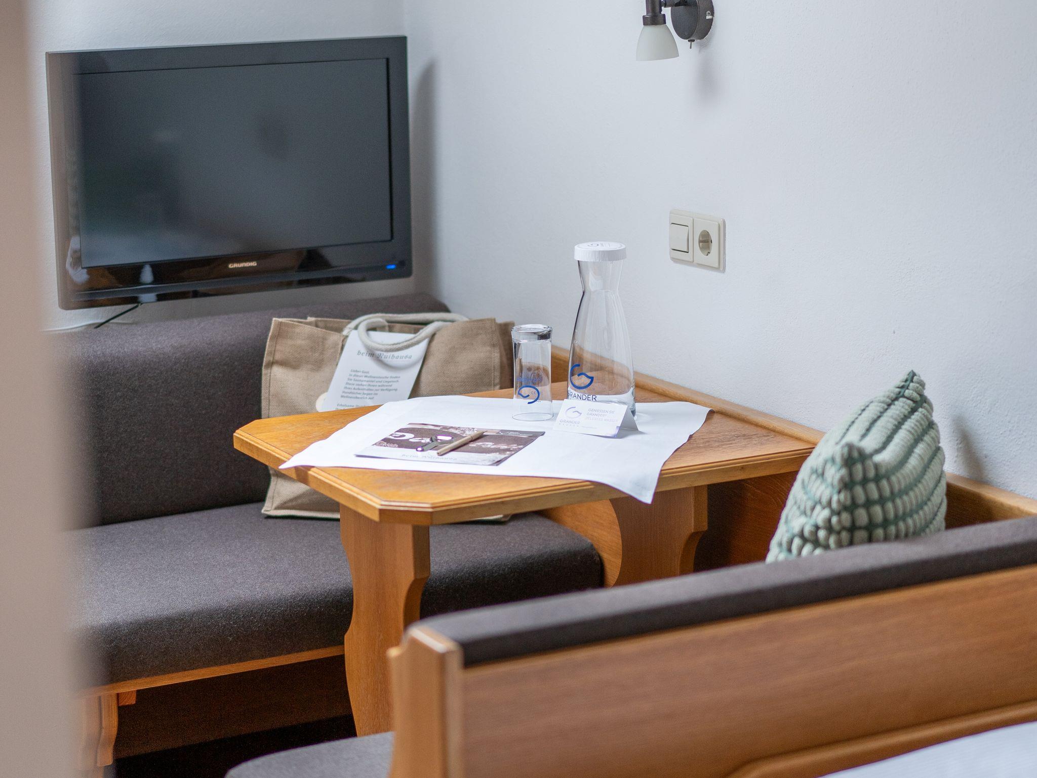 Gemütlich eingerichtet mit Dusche/WC, Kabel-TV, Sitzecke, Bademantel mit Liegetuch.