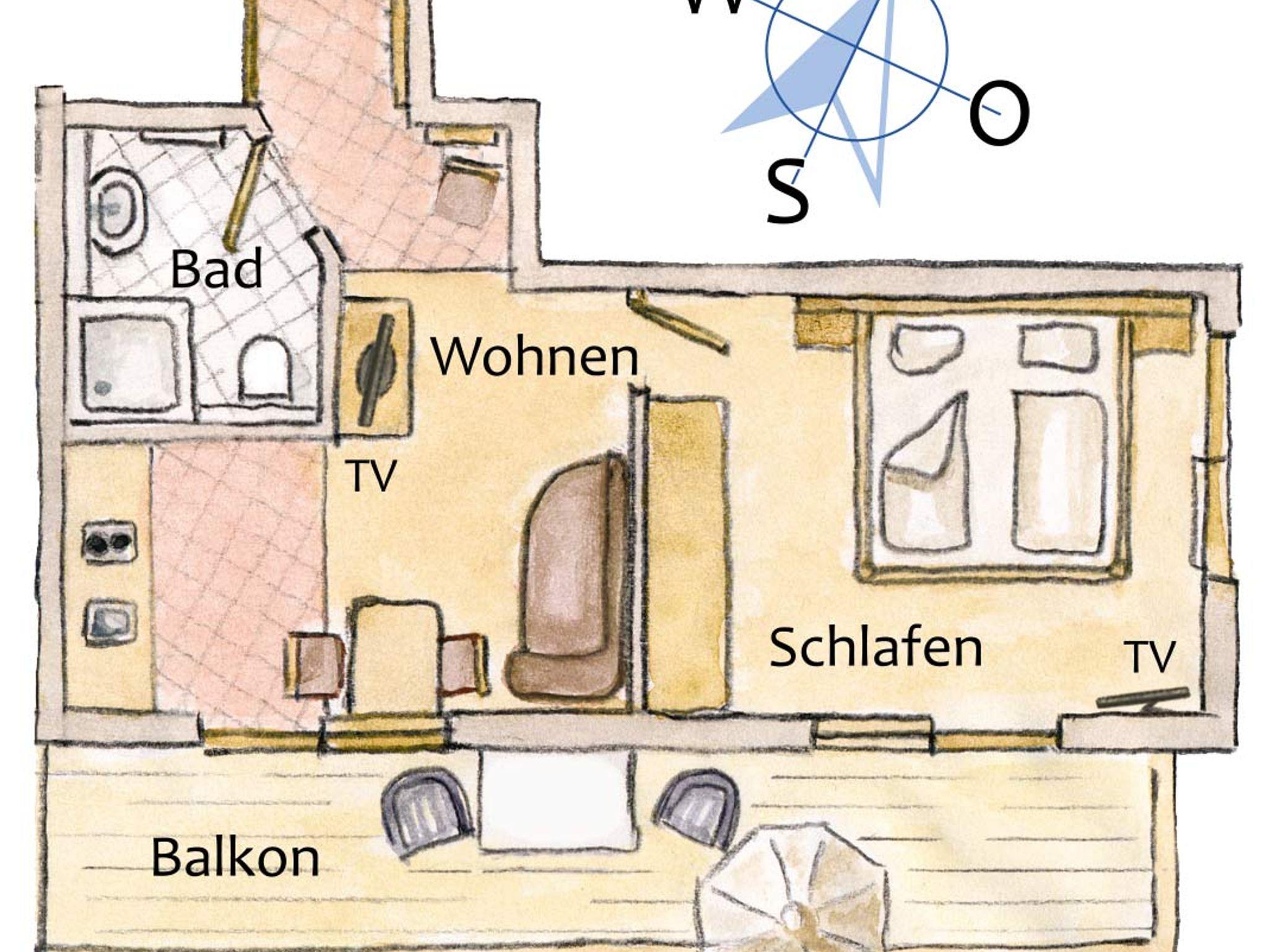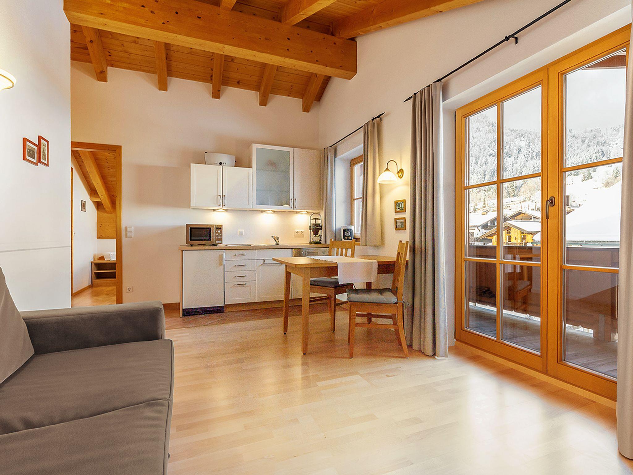 Sonnige 2-Zimmer-Ferienwohnung im 1.OG, Größe ca. 33 m². Der große Süd-Balkon bietet freien Blick ins Kaisergebirge und den Unterberg. An der kleinen Essecke im Wohnraum können Sie die selbst zubereiteten Mahlzeiten genießen. Die Küchenzeile ist mit einem Geschirrspüler ausgestattet. Allergikergerecht wurde in der gesamten Wohnung hochwertiges Echtholz-Parkett verlegt. Bettwäsche und Handtücher sind ausreichend vorhanden und werden nach Ihren Wünschen gewechselt. Für den Fernsehabend steht Ihnen ein DVD-Player sowie je ein Fernsehgerät in Wohn- und Schlafzimmer zur Verfügung. Die CD-Radio-Anlage komplettiert die Ausstattung. Das Duschbad im App. Walmberg wurde komplett renoviert. In unseren Badezimmern bekommen Sie keine kalten Füße! Dafür sorgt die ganzjährig beheizte Fußbodenheizung.