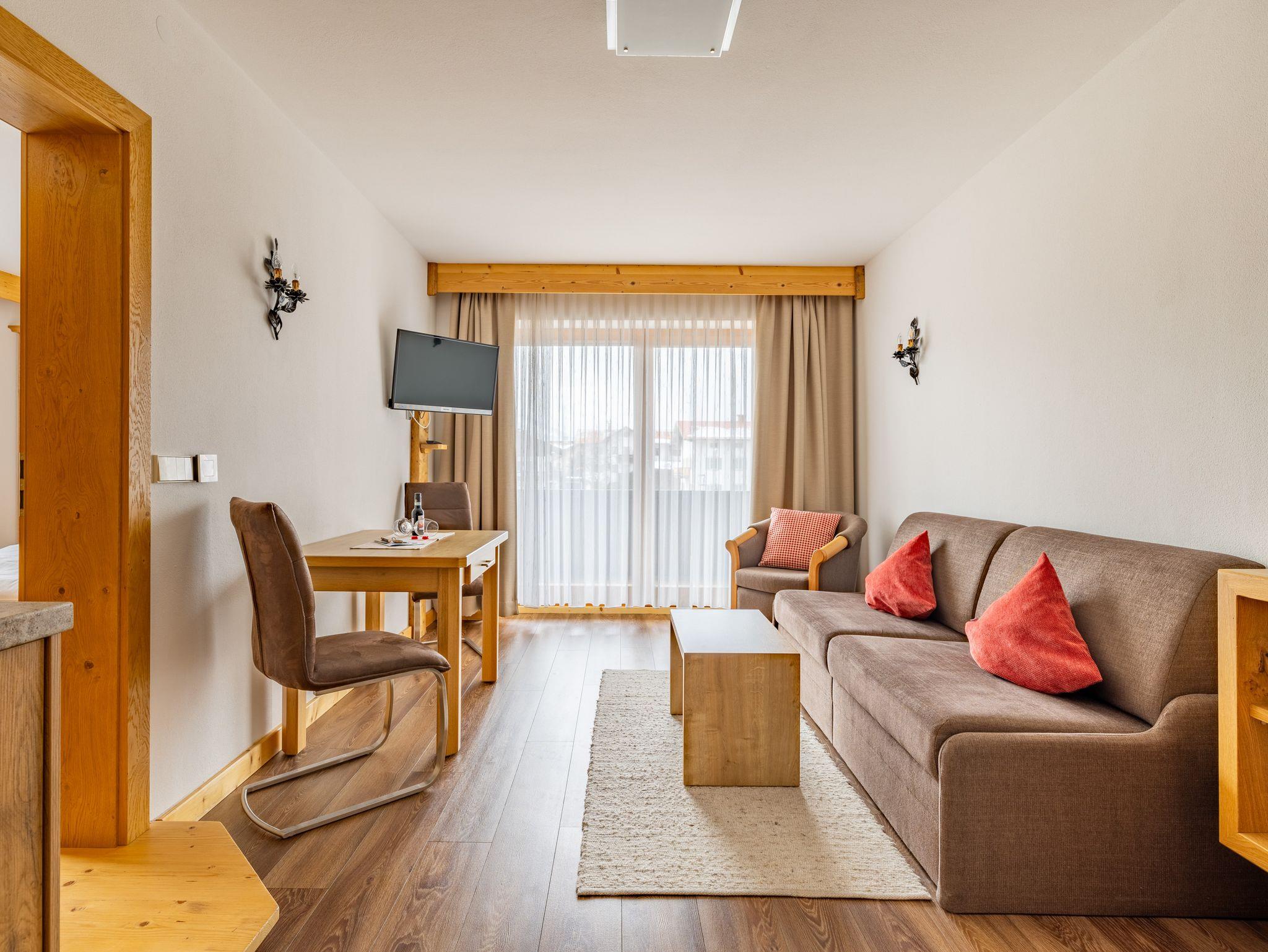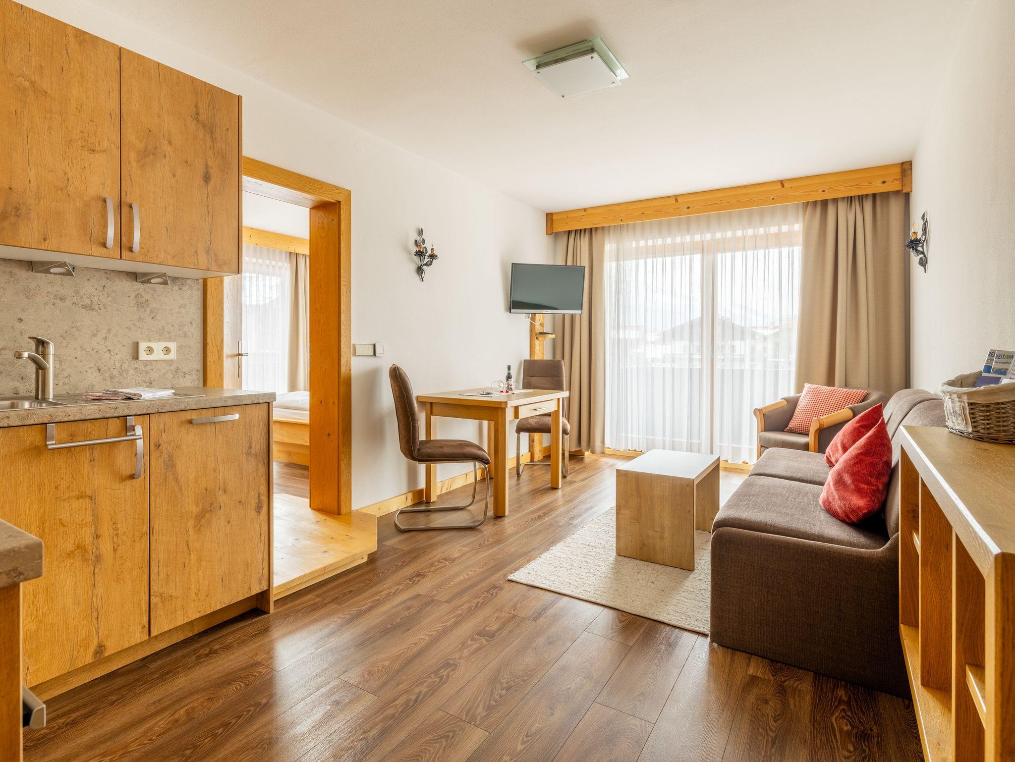 Die neu renovierte, großzügige 2-Raumwohnung im 1. OG hat eine Größe von ca. 41 qm. Die exklusive Wohnung verfügt über ein Schlafzimmer mit DU/WC (Fußbodenheizung) und großem Süd-Balkon (Blick auf den Garten), eine hochwertige moderne Küchenzeile (mit Geschirrspüler, Backofen, 4-Platten-Ceranfeld, Kaffeemaschine, Toaster, uvm.) und ein schönes helles Wohn/Esszimmer mit Panoramafenster, gemütlicher Essecke und einer hochwertigen Ausziehcouch. Vom West-Balkon hat man einen wunderbaren Blick auf das Kaisergebirge und den Unterberg.
