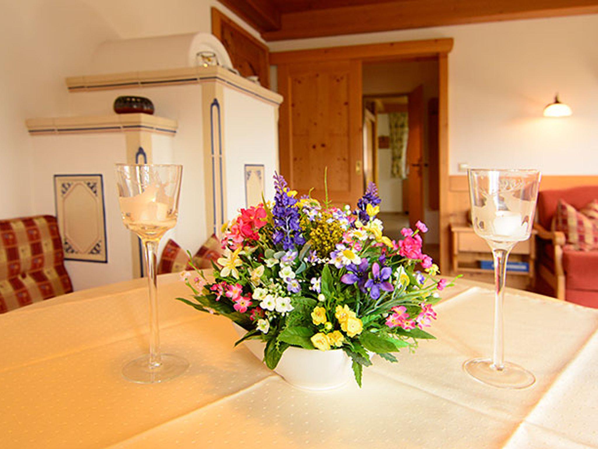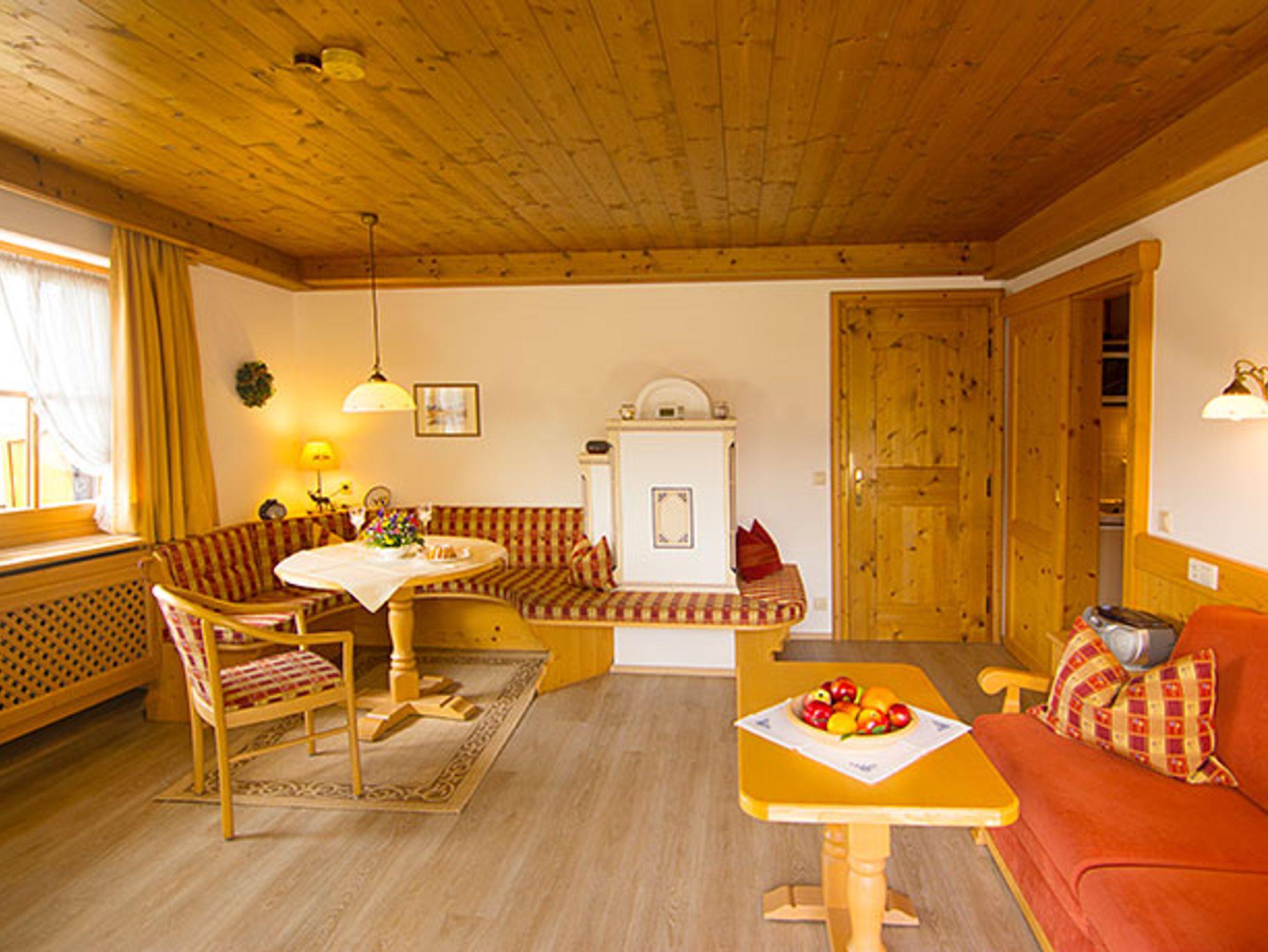 Die Wohnung ist mit hochwertigen Möbeln von unserem Dorfschreiner mit viel Liebe zum Detail im heimischen Stil gefertigt. Zudem ist die Wohnung mit einer separaten Küche mit 2 Ceran-Kochfeldern, Spülmaschine, Mikrowelle, Wasser- und Eierkocher, Toaster, Tassimo-Kapsel-Kaffeemaschine und weiteren komfortablen Extras ausgestattet. Der Wohnraum mit einem großzügigen Essbereich und einem heimeligen, elektrisch beheizbaren Kachelofen lässt keine Wünsche offen.
