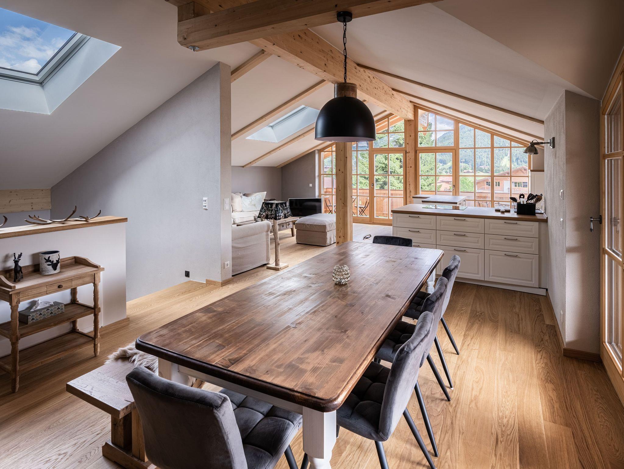 Von der großzügigen Loggia im Dachgeschoss aus hat man einen herrlichen Blick auf den Zahmen und den Wilden Kaiser und kann, geschützt vor Niederschlag und Kälte, seine Zeit genießen. Zudem gibt es noch 5 weitere Balkone, die alle einen anderen Blick auf die Umgebung Reit im Winkls zulassen.