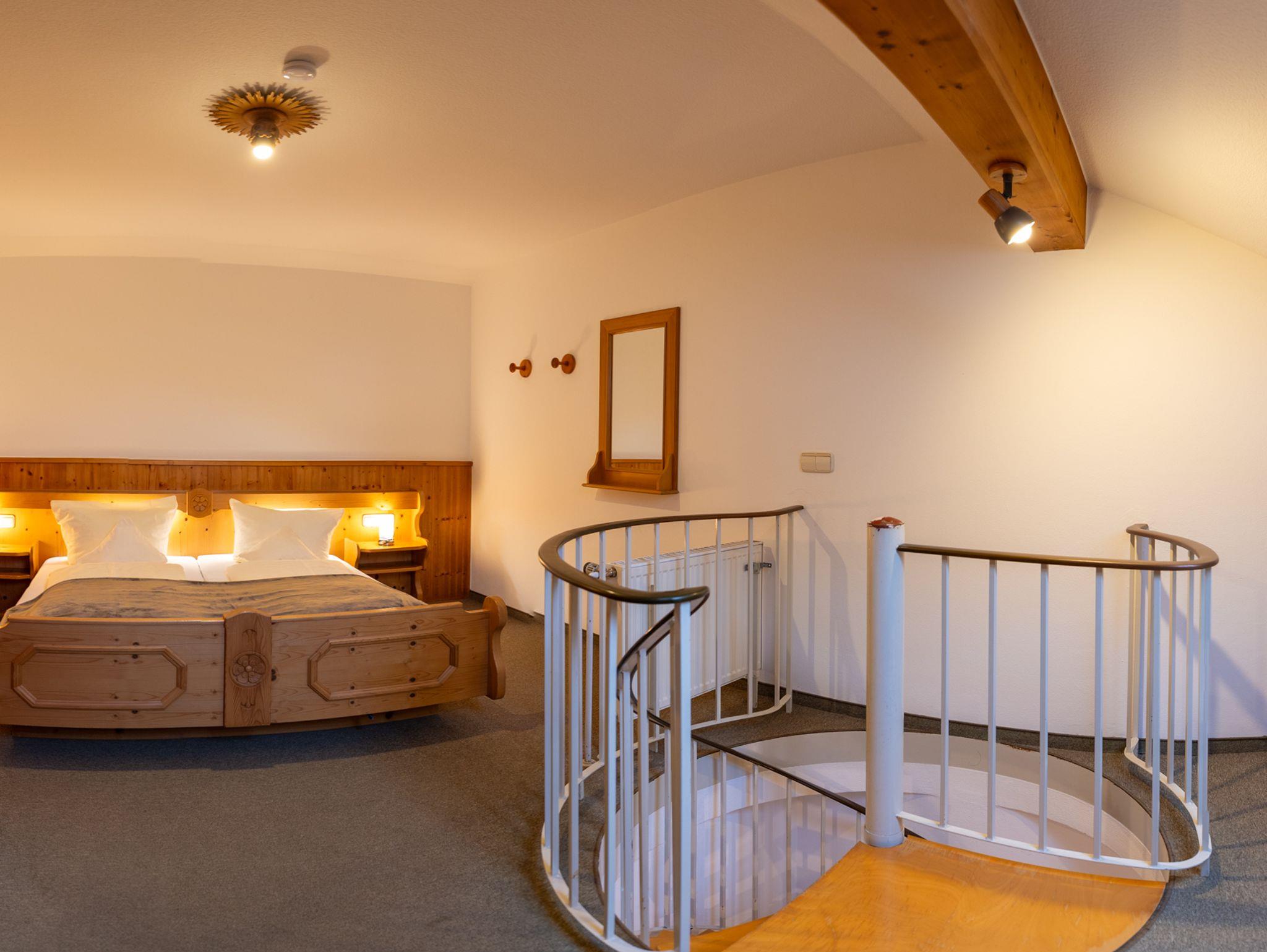 Die Galerie-Ferienwohnung (Wohnraum, Schlafraum, separate Küche und Dusche/WC) hat eine Größe von ca. 48 qm und befindet sich im 1. Obergeschoß. Der Balkon zeigt in Richtung Westen. Das Schlafzimmer ist über eine Wendeltreppe nach oben hin zu erreichen.