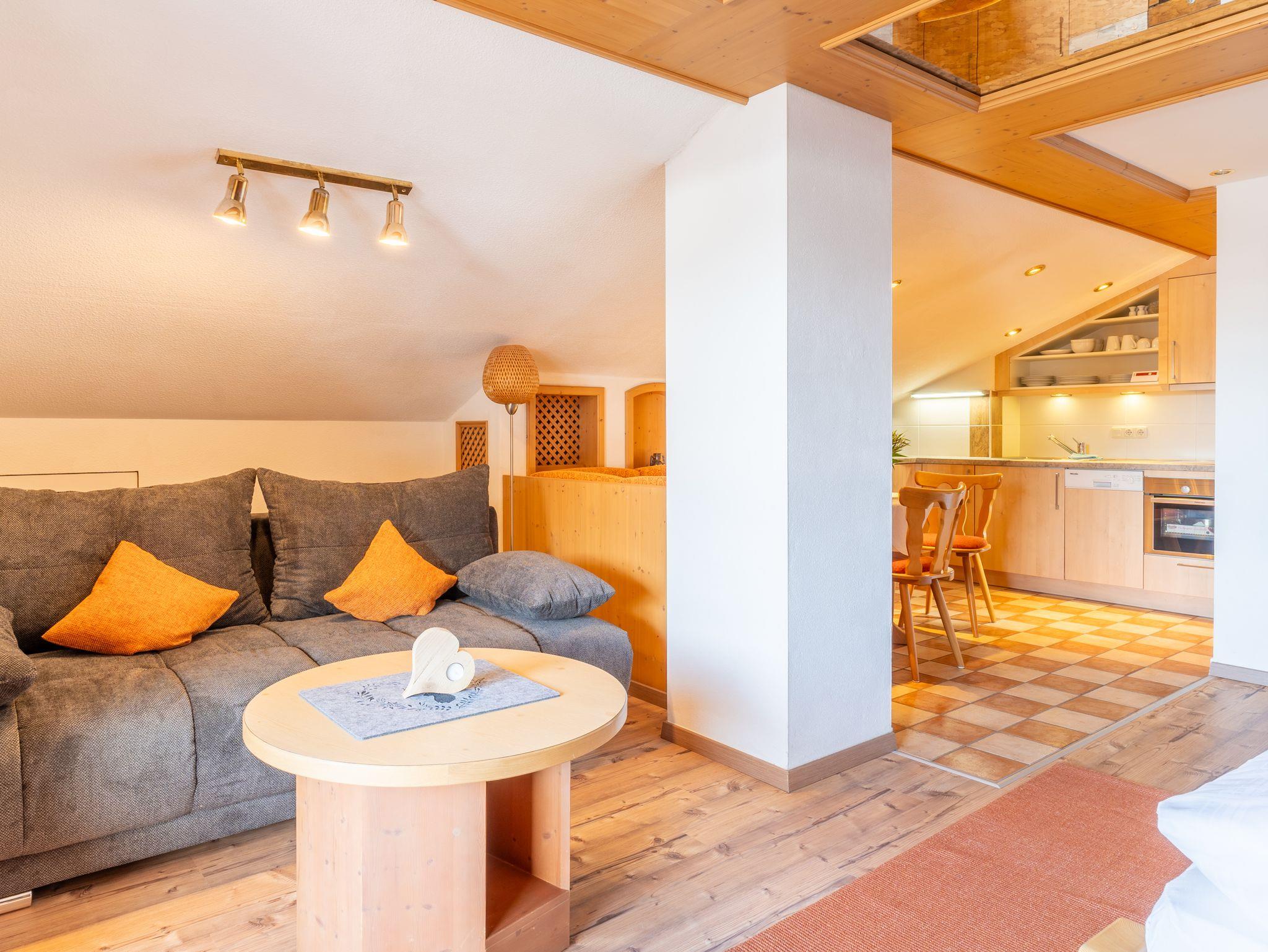 Die ideale Familien-2-Raum-Wohnung ist ca. 50 qm groß und erstreckt sich über das gesamte Dachgeschoss. Im vorderen Bereich der Wohnung befinden sich ein Doppelbett in Komforthöhe (1,80 m x 2,00 m) und ein gemütlicher Wohnbereich mit Schlafsofa, im mittleren Teil ist das Esszimmer mit sehr gut ausgestatteter neuer Küchenzeile (Spülmaschine, Toaster, Wasser- und Eierkocher etc.) und ein Badezimmer. Das zweite Schlafzimmer mit zwei Einzelbetten mit einem eigenen Badezimmer befinden sich im hinteren Teil. Von den beiden Balkonen haben Sie einen schönen Blick auf die umliegende Bergwelt und in den Garten.