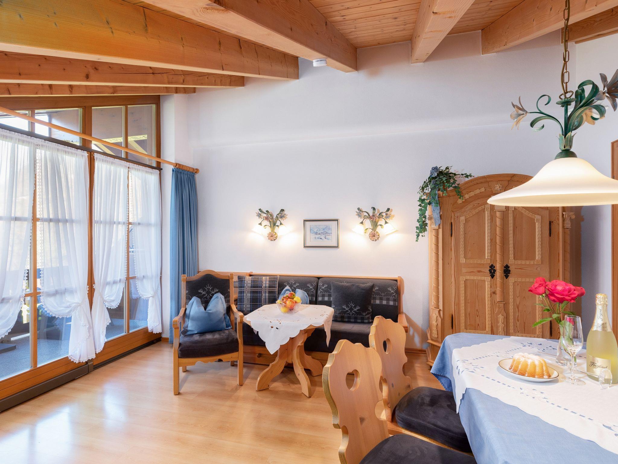 Zwei Schlafzimmer, gemütlicher, großer Wohnraum mit eingebauter Essecke mit Kachelofen. Abgeschlossene Küche mit Spülmaschine u. Mikrowelle. Badezimmer mit Fenster,Doppelwaschbecken, Dusche/WC. Südseitenbalkon mit Blick zum Wilden Kaiser.
