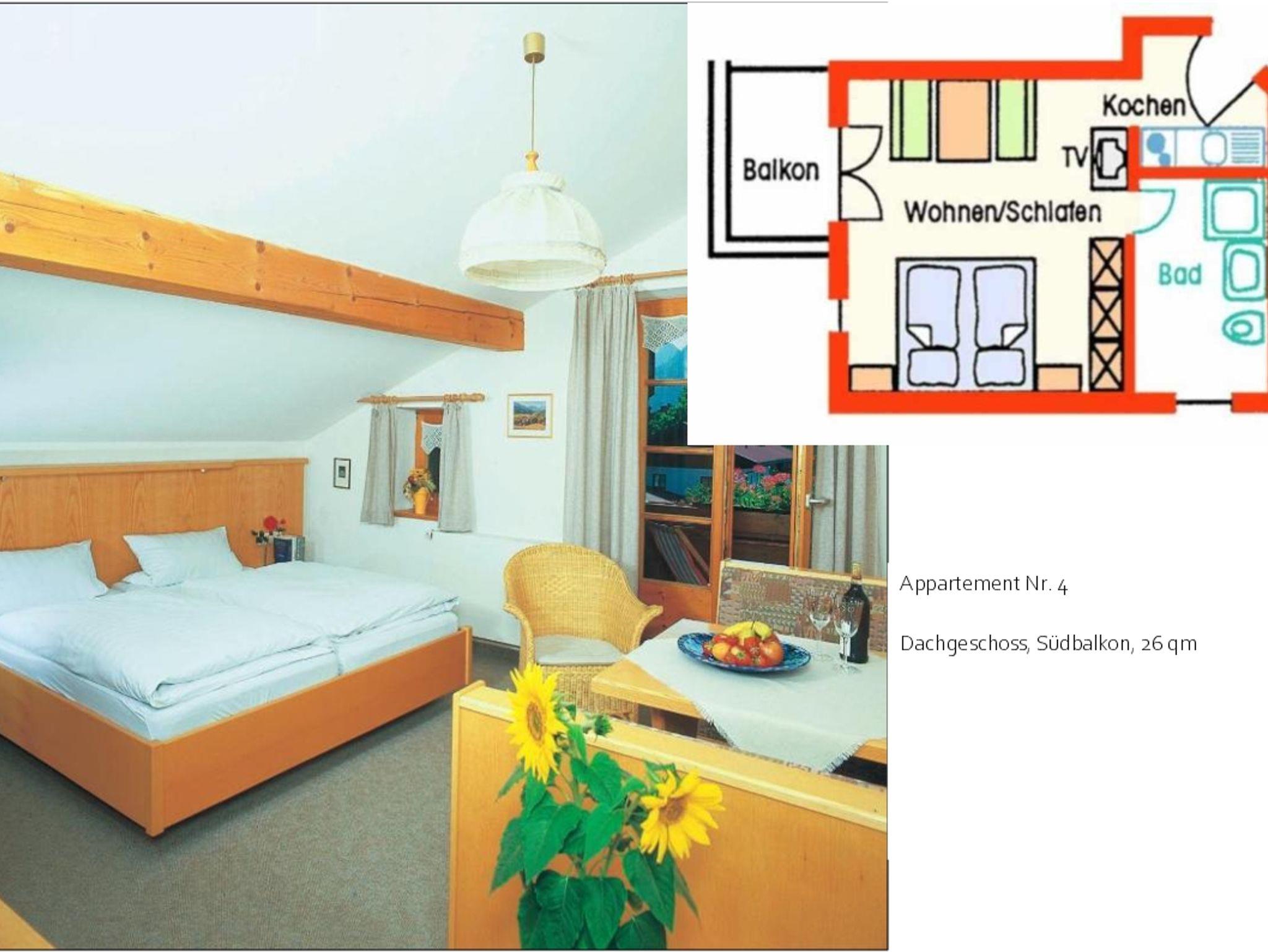 Die Einzimmer-Ferienwohnung mit Wohn-Schlafraum ist ausgestattet mit einem Doppelbett, einer Sitzecke, Südbalkon, Kabel-TV sowie Telefon. Das Bad verfügt über Dusche/WC und Fön. Im Vorraum mit Garderobe befindet sich eine Küchenzeile. Vom Südbalkon aus haben Sie einen herrlichen Bergblick.