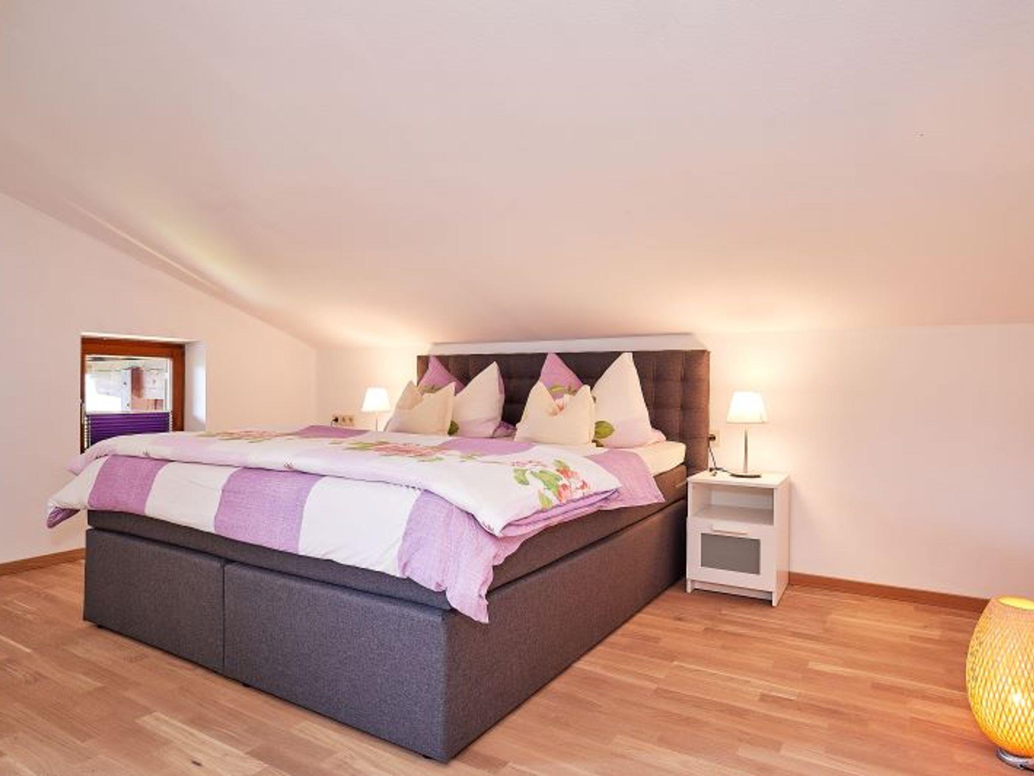 Die großzügig, im bayerischen Stil ausgestattete 4-Zimmer-Ferienwohnung verfügt über sehr geräumige, sonnige Balkone. In der komplett eingerichteten separaten Wohn-Küche mit Spülmaschine können Sie bequem Ihre Mahlzeiten zubereiten. Die helle gemütliche Ferienwohnung hat ein großes Wohnzimmer, zwei Schlafzimmer, große Diele mit Kachelofen, Holz-Innentreppe, ein Bad mit Dusche und WC. Die Handtücher werden von uns gestellt. Die kuscheligen Oberbetten haben Überlänge. Für Allergiker ist diese Wohnung empfehlenswert, da Sie in der Ferienwohnung nur ein natürlicher Holzboden oder Fliesenboden erwartet. In der Küche, Diele und im Badezimmer sind Fliesenböden.