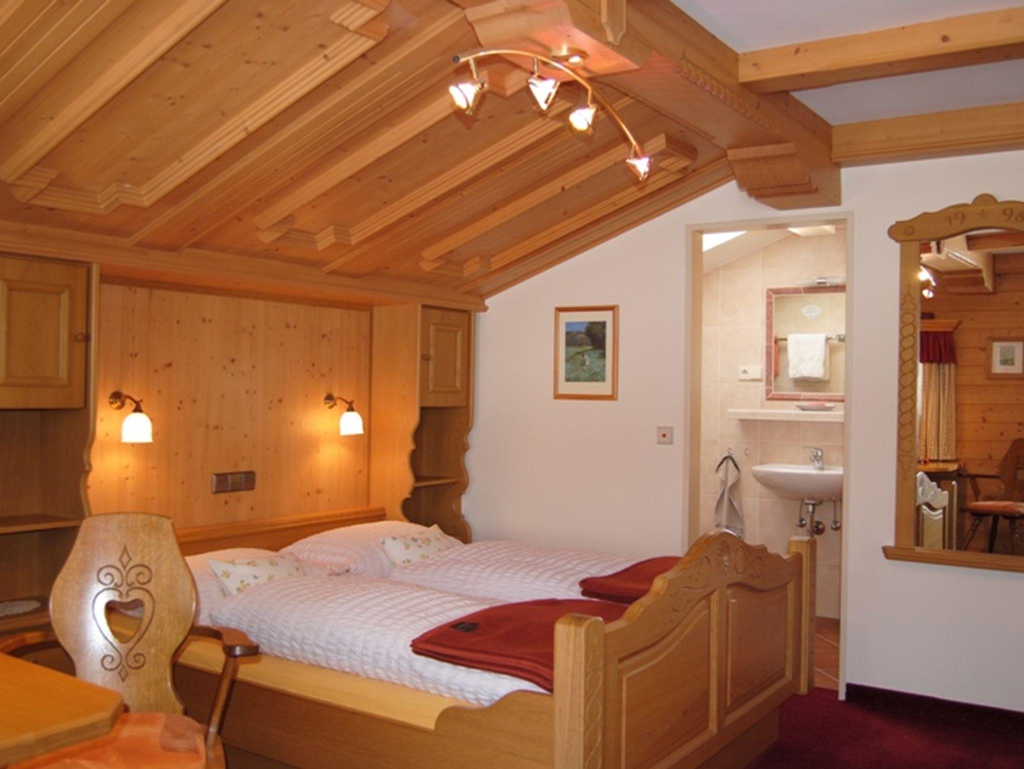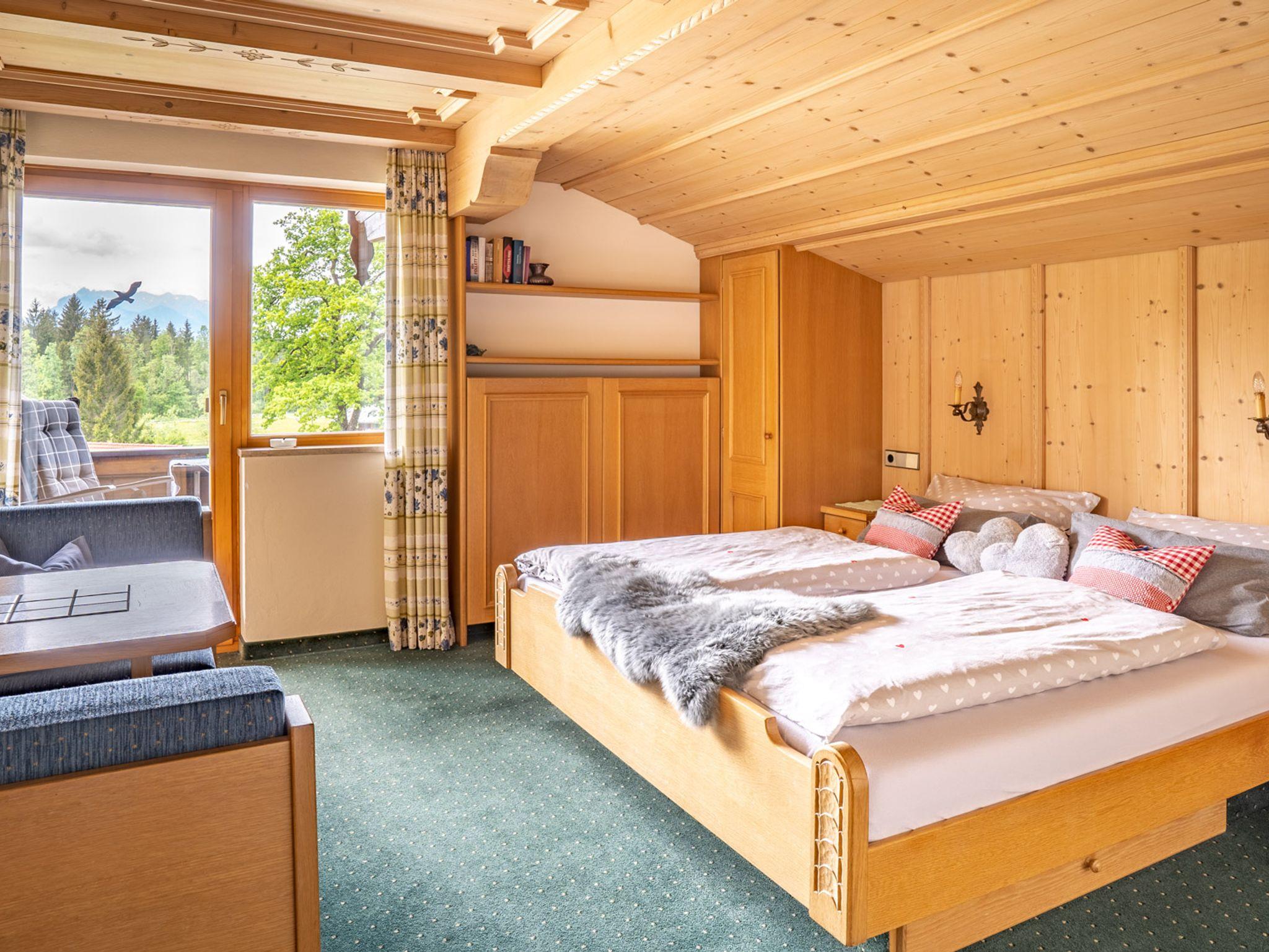 Rustikal eingerichtetes 27 m2 Doppelzimmer mit Balkon in der 2. Etage, aufwändig mit Holzverkleidungen u. Schnitzereien gestaltet, helles Bad: Dusche/WC und Fenster im Dachgeschoß (mit Morgensonne!) - sehr ruhig mit Walmbergblick!
