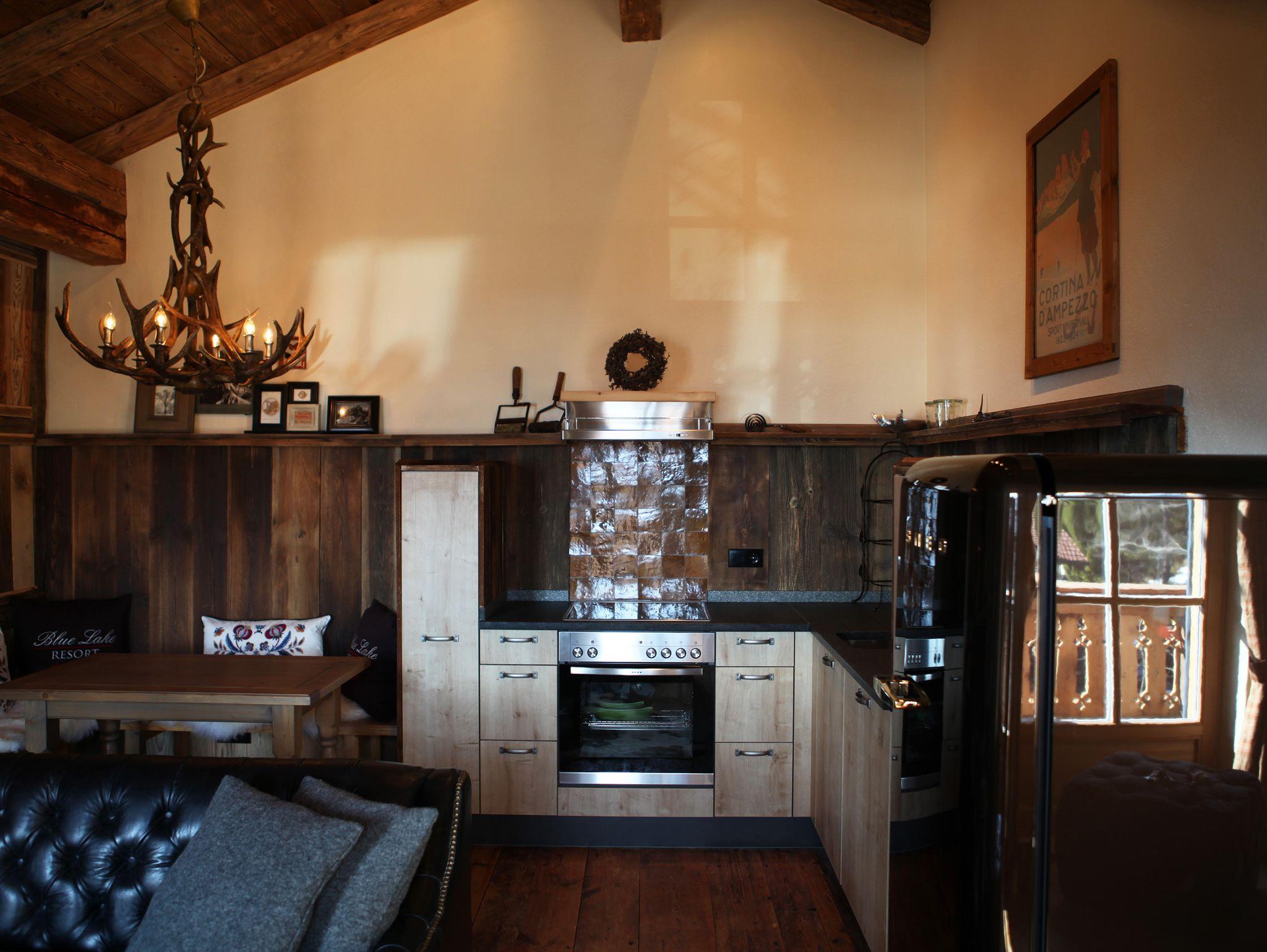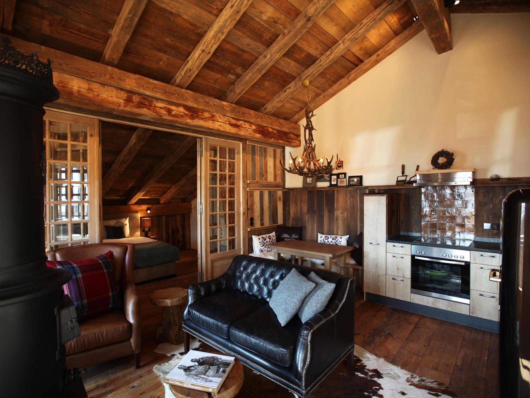 In das Dorfchalet Cortina, gelangt man durch den zentralen Eingangbereich mit bayerischer Sternetür aus Altholz. Eine dahinter liegende, interne Tür verschafft Eintritt in den Garderobenbereich. Über eine Natursteinstreppe steigen Sie auf in das romantische Chalet mit seinem Altholzgiebel. Dieser historische Dachstuhl wurde zum ersten Mal für einen Bauernhof in Oberbayern im Jahre 1876 aufgebaut. Seit 2011 beschützt er nun das Refugio in Reit im Winkl. Das romantische Schlafzimmer mit seiner alten Schlosstür aus fassettegeschliffenen Gläsern, grenzt an den Hauptraum des Chalets. Das Schlafzimmer ist mit Boxspring-Betten ausgestattet sowie einem Original Bauernschrank aus Südtirol für ihre Garderobe. Stauraum für die Koffer finden Sie in Einbauschränken. Ein 7 Meter langer Balkon, mit Blick auf den Ort, die Berge sowie den angrenzenden Bachlauf runden das Chalet ab, und lädt Sie zum Verweilen an der frischen Bergluft ein. Die Gesamtfläche des Dorfchalet Cortina beträgt 61 qm. Unsere geschätzten Gäste haben freien Eintritt in Hallen- und Freibad. WLAN steht Ihnen selbstverständlich zur Verfügung.