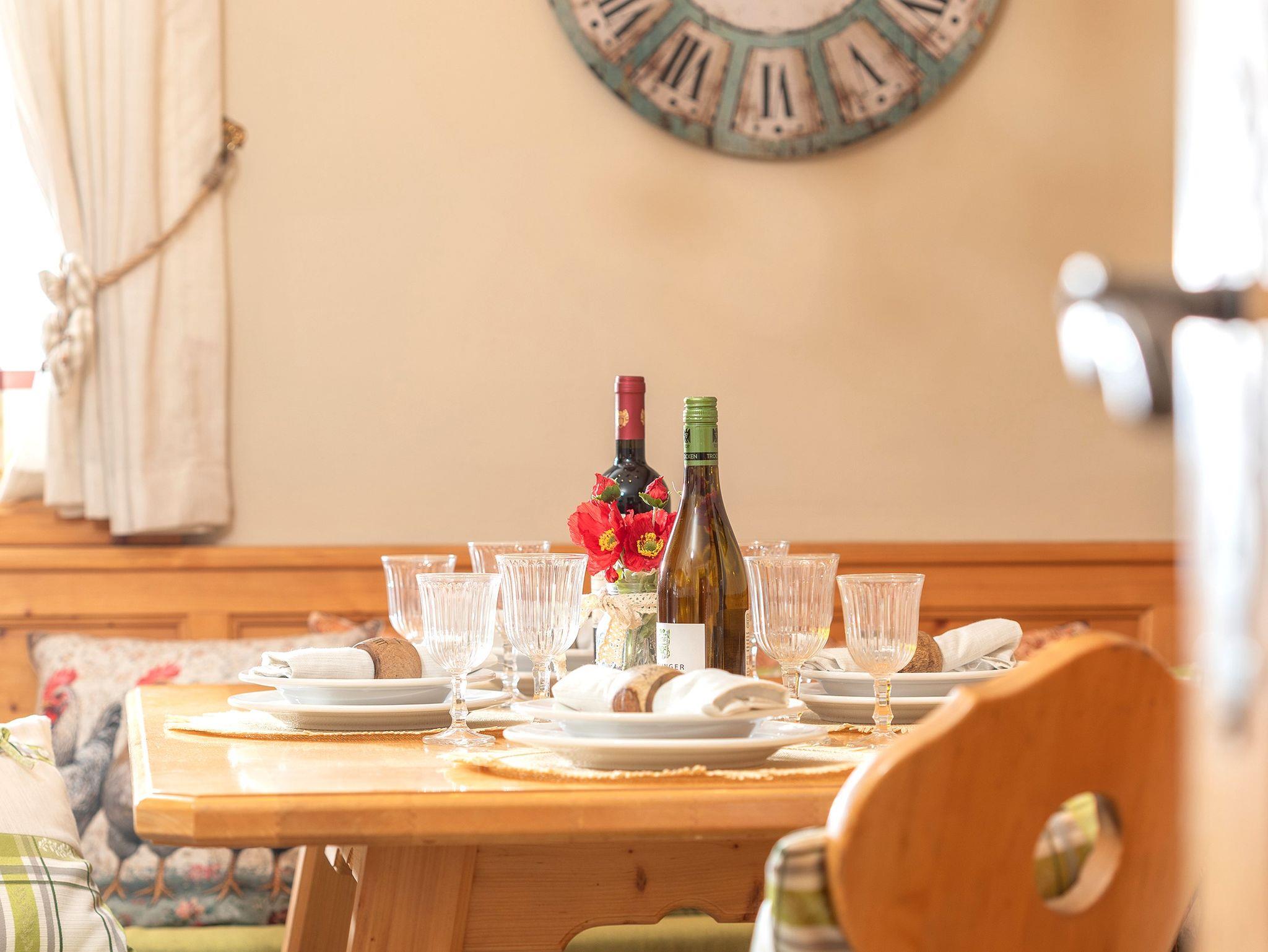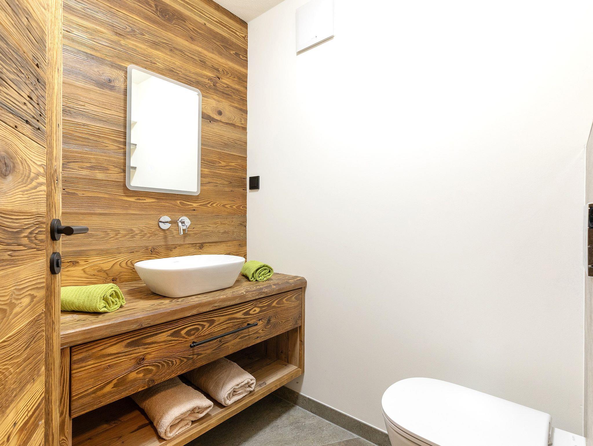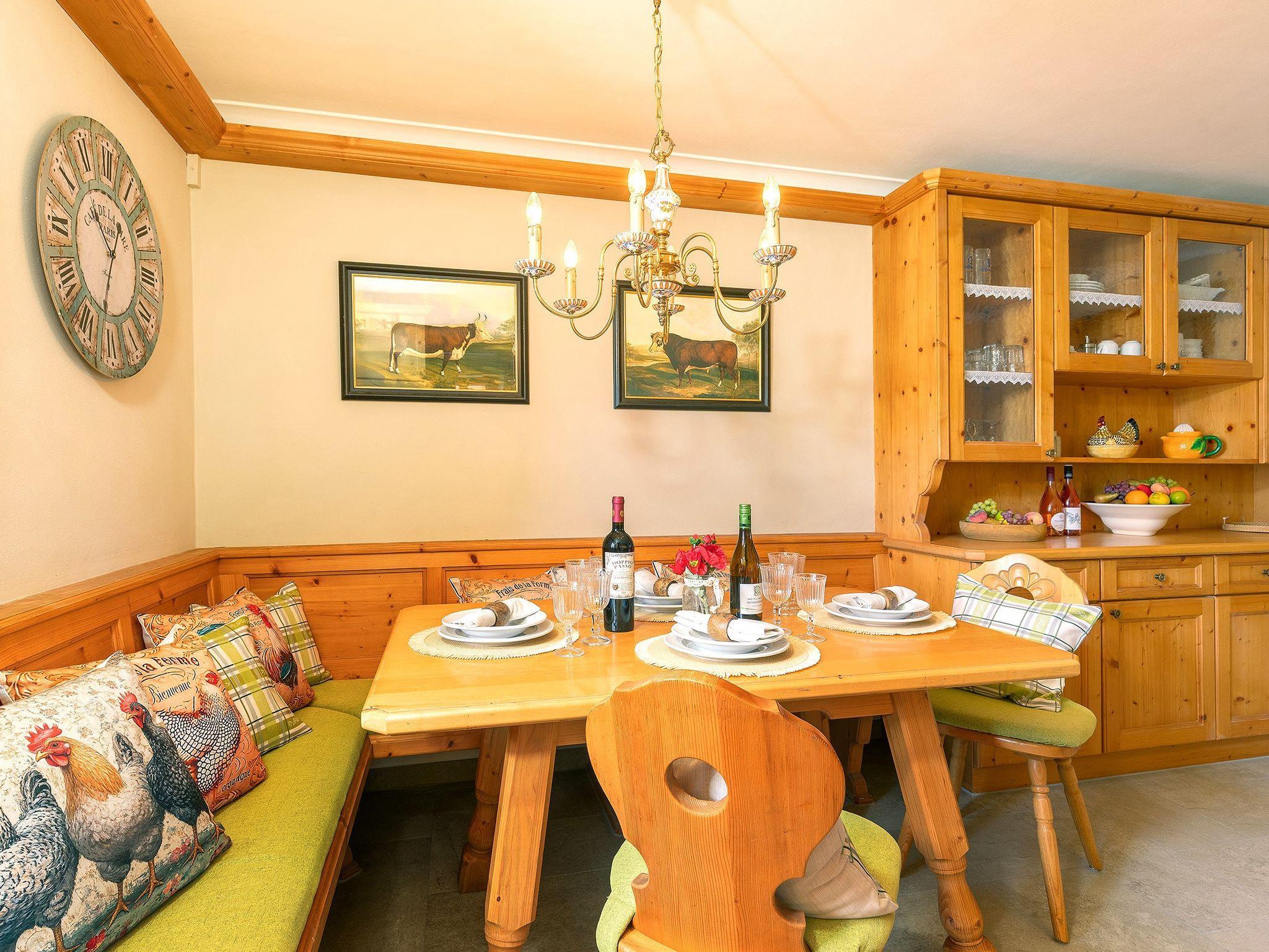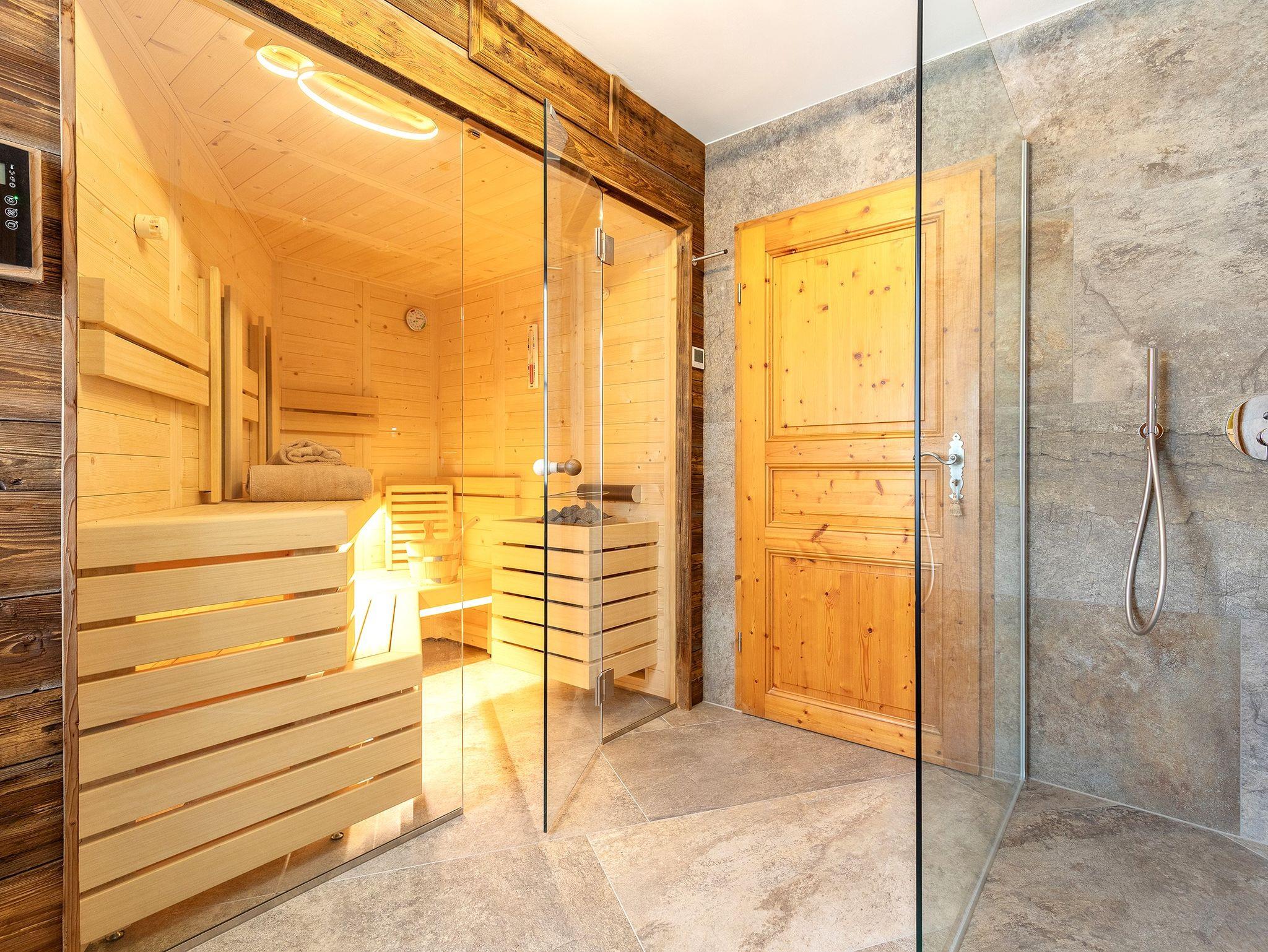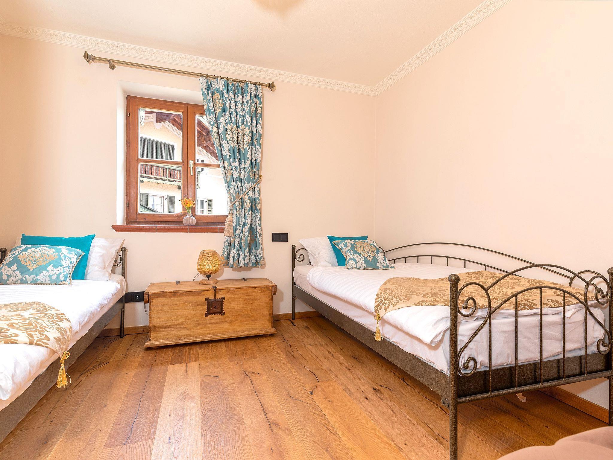 Im ersten Stock befindet sich die großzügige Kaiser Residenz. Diese weitläufige Wohnung bietet Platz für bis zu sechs Personen und verfügt über drei separate Schlafzimmer, einen gemütlichen Wohn- und Essbereich sowie eine eigene Sauna – perfekt, um nach einem aktiven Tag in den Bergen zu entspannen. Der Balkon rundet das Wohlfühlerlebnis mit einem schönen Ausblick ab.