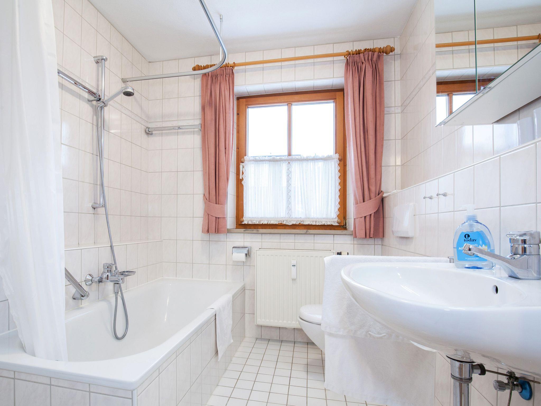Am anderen Ende des Raumes befindet sich eine vollausgestattete Küchenzeile mit neuwertigen Elektrogeräten wie ein Kühlschrank mit Tiefkühlfach, Geschirrspüler, Ceranfeld mit 4 Platten, und ein Backofen. Zudem gibt es einen Toaster, Eierkocher, Wasserkocher, Kaffeemaschine, Kaffeevollautomat von DeLonghi (Bohnen) und eine Mikrowelle. Das Schlafzimmer verfügt über ein Doppelbett, ein TV-Gerät (32 Zoll) und einen großen Schrank aus Echtholz. Der etwa 25 m² große möblierte Balkon mit Süd- und Ostausrichtung, ist mit einem Fliesenboden ausgestattet. Der Balkon ist sowohl vom Wohnzimmer als auch vom Schlafzimmer aus begehbar und bietet einen herrlichen Ausblick auf die umliegende Bergwelt. Genießen Sie entspannte Momente in der Badewanne. Im Badezimmer gibt auch eine Duschmöglichkeit, ein Waschbecken mit Spiegelschrank und ein WC. Gerne können unsere Gäste die zur Wohnung gehörende Waschmaschine und den Wäschetrockner im Keller benutzen.
