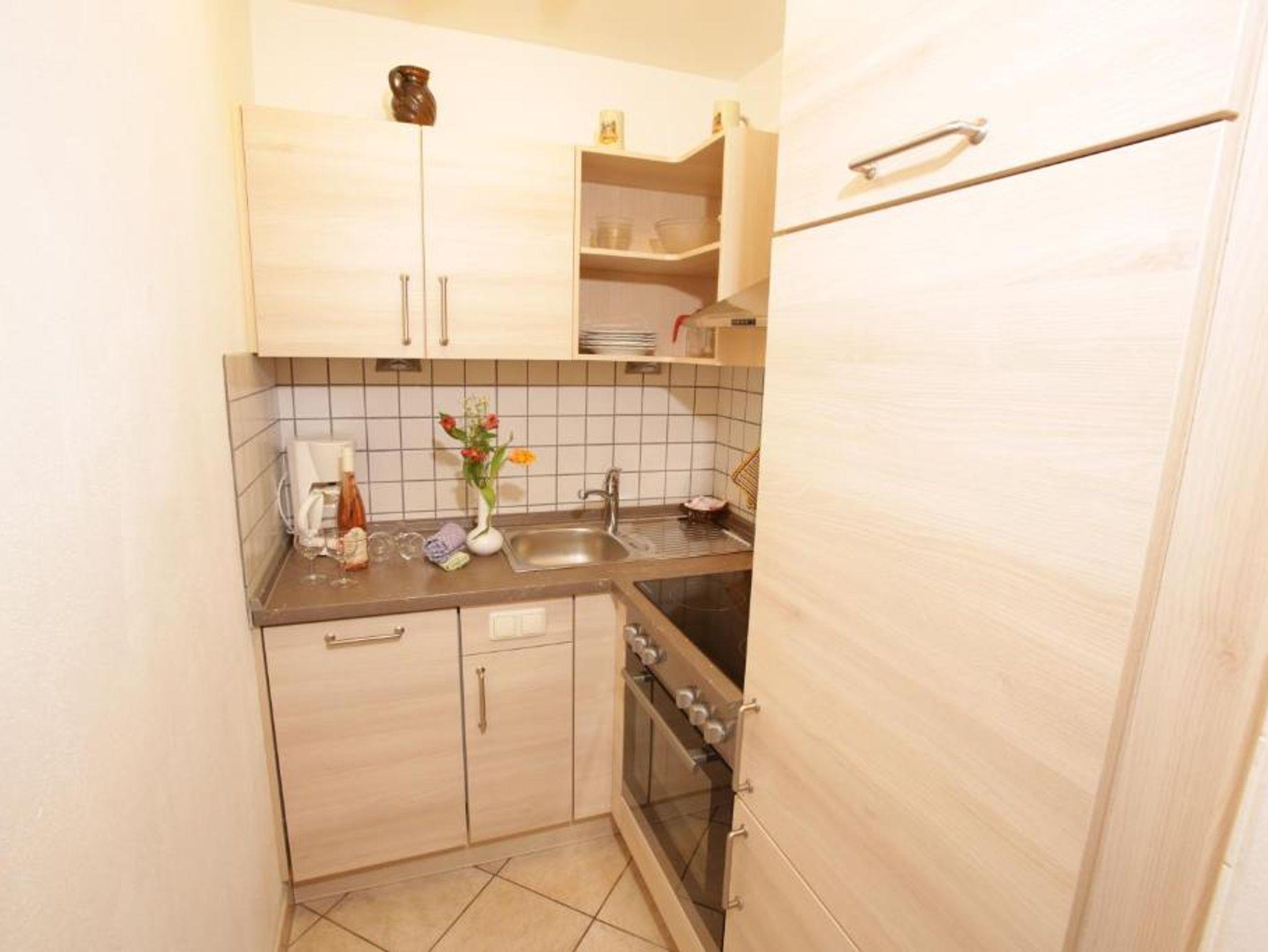 Die Zwei-Raum-Ferienwohnung ist ausgestattet mit Doppelbett, Polstergarnitur mit Lattenrost, Sitzecke sowie Dusche/WC. Die Küche ist mit 2 Kochplatten, Kühlschrank sowie einer Kaffeemaschine ausgestattet. Ein Toaster kann ausgeliehen werden. Durchwahltelefon und Kabel-TV komplettieren die Ausstattung dieser Wohnung.