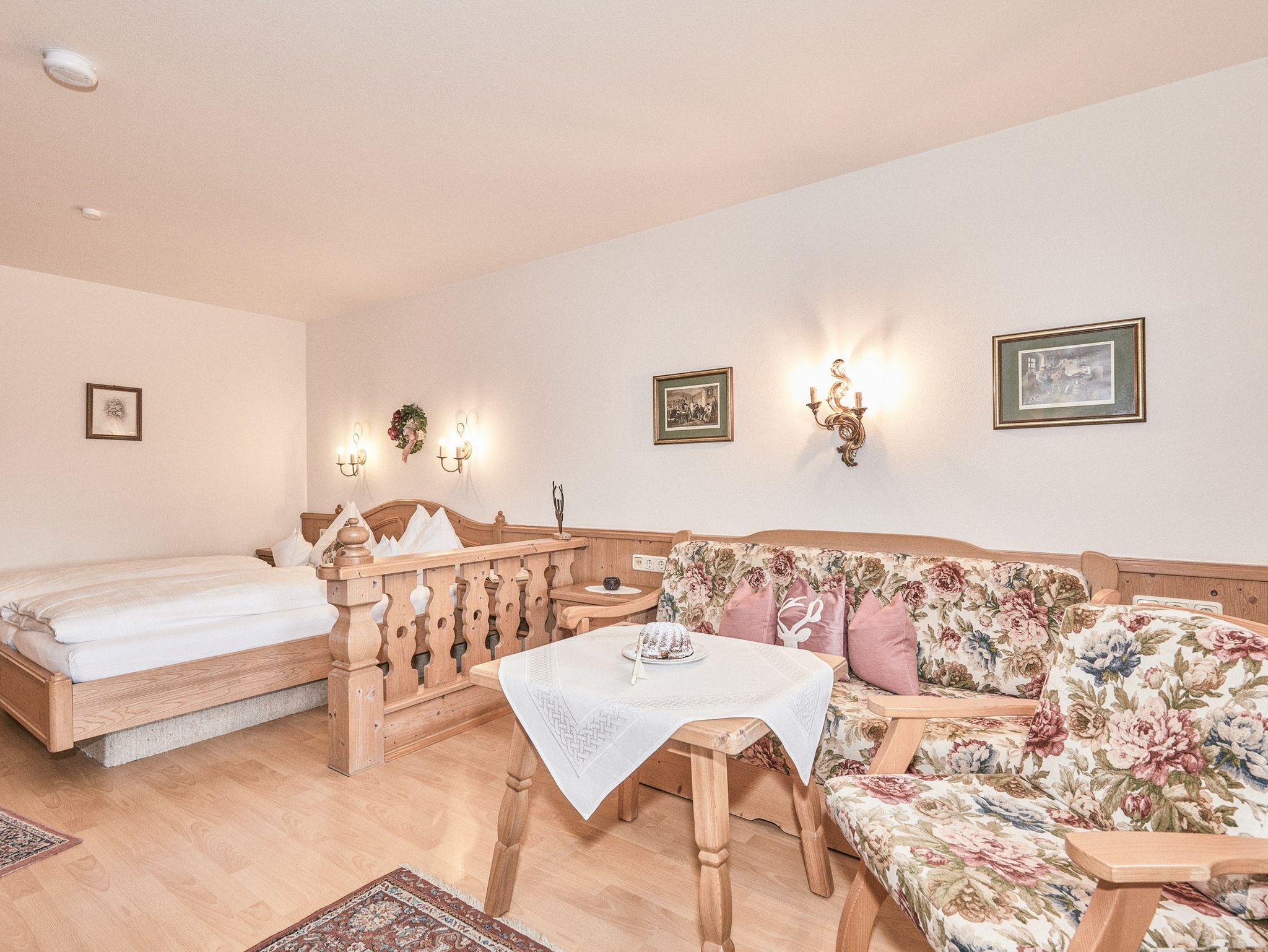 Wohn- und Schlafraum kombiniert, feststehende Betten, Eßecke und Sitzgruppe. Abgeschlossene Küche. Badezimmer-Dusche/WC. Abgeschlossener Südbalkon mit Blick zum Wilden Kaiser.