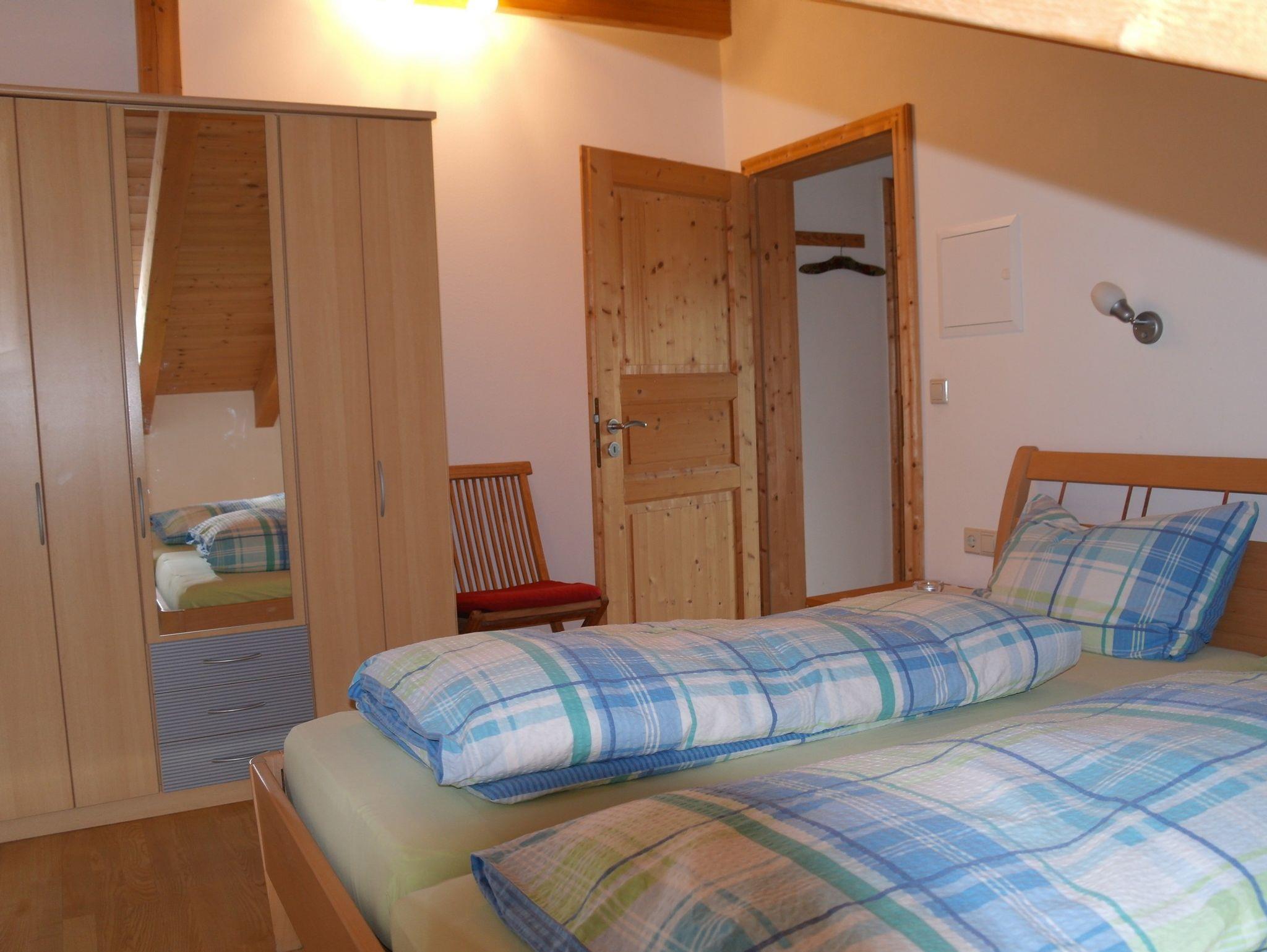 Die nach Osten orientierte Dachgeschoß-Wohnung mit Sichtbalkendecke bietet Platz für 2-4 Personen. Sie verfügt über ein Schlafzimmer mit Doppelbett und einen Wohnraum mit gut ausgestatteter Küchenzeile, Tisch, Stühlen und einer bequemen Sitzecke mit Ausziehcouch für 2 Personen. Auf dem großen Balkon warten bequeme Sessel, ein großer Holzklapptisch und Sonnenschirm sowie ein sehr schöner Ausblick auf den Ortskern und die umliegenden Berge auf unsere Gäste.