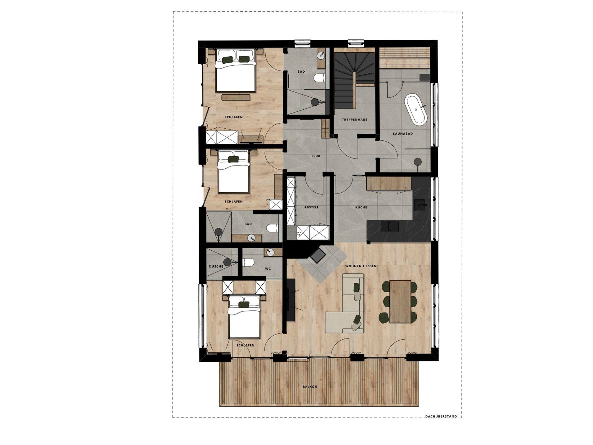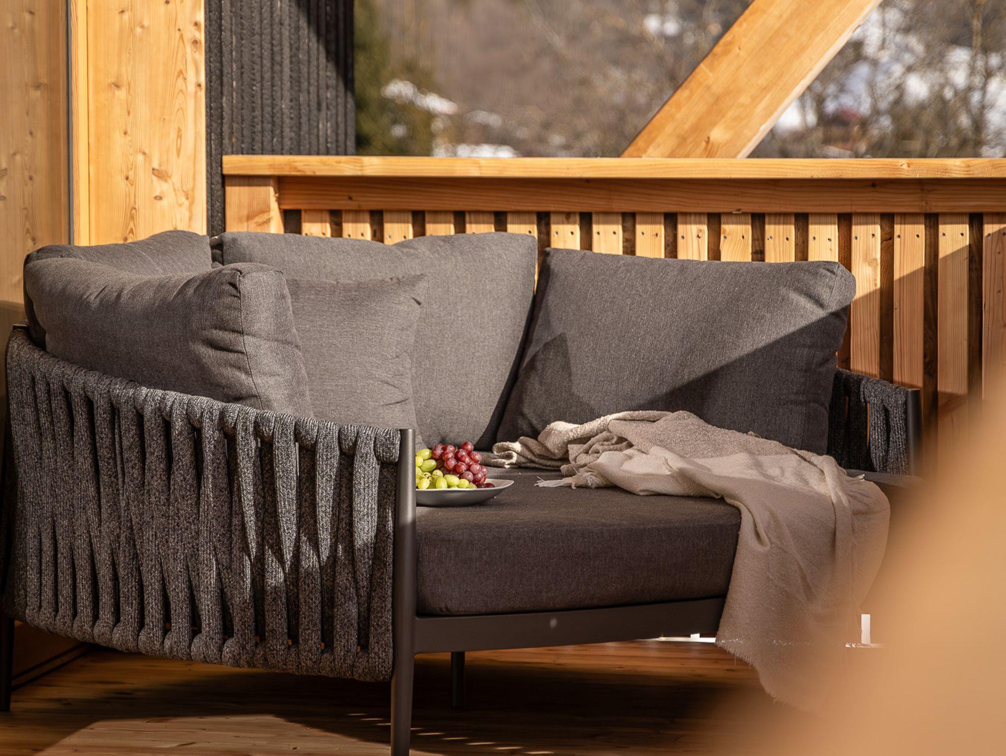Direkt am Wohnzimmer anbindend, befindet sich der großzüge Balkon mit 20 Quadratmetern. Dabei gibt es ganzjährig eine Entspannungs & Liegelounge. Bis auf den Winter haben Sie die Möglichkeit bei der Sitzloungecke Platz zu finden, um bei dem ein oder anderen Getränk die Aussicht zu genießen.