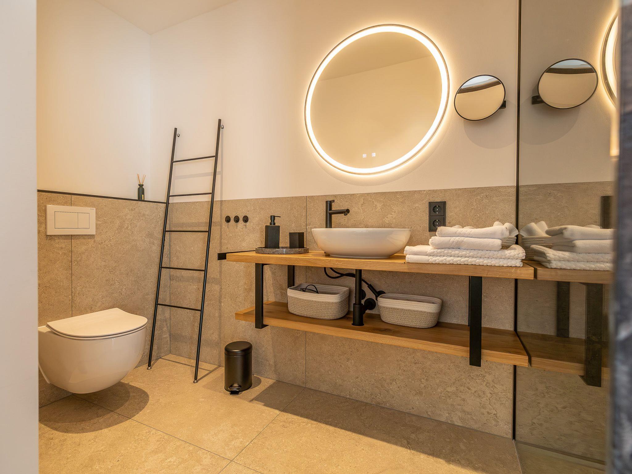 Um dem gehobenen Komfort gerecht zu werden, gibt es pro Schlafeinheit ein seperates Badezimmer. Ebenerdige Duschen, Waschtische, WC´s, 3-Stufen einstellbare LED Spiegel, Kosmetikspiegel, Fön & sonstiges Zubehör sorgen fürs Wohlbefinden.