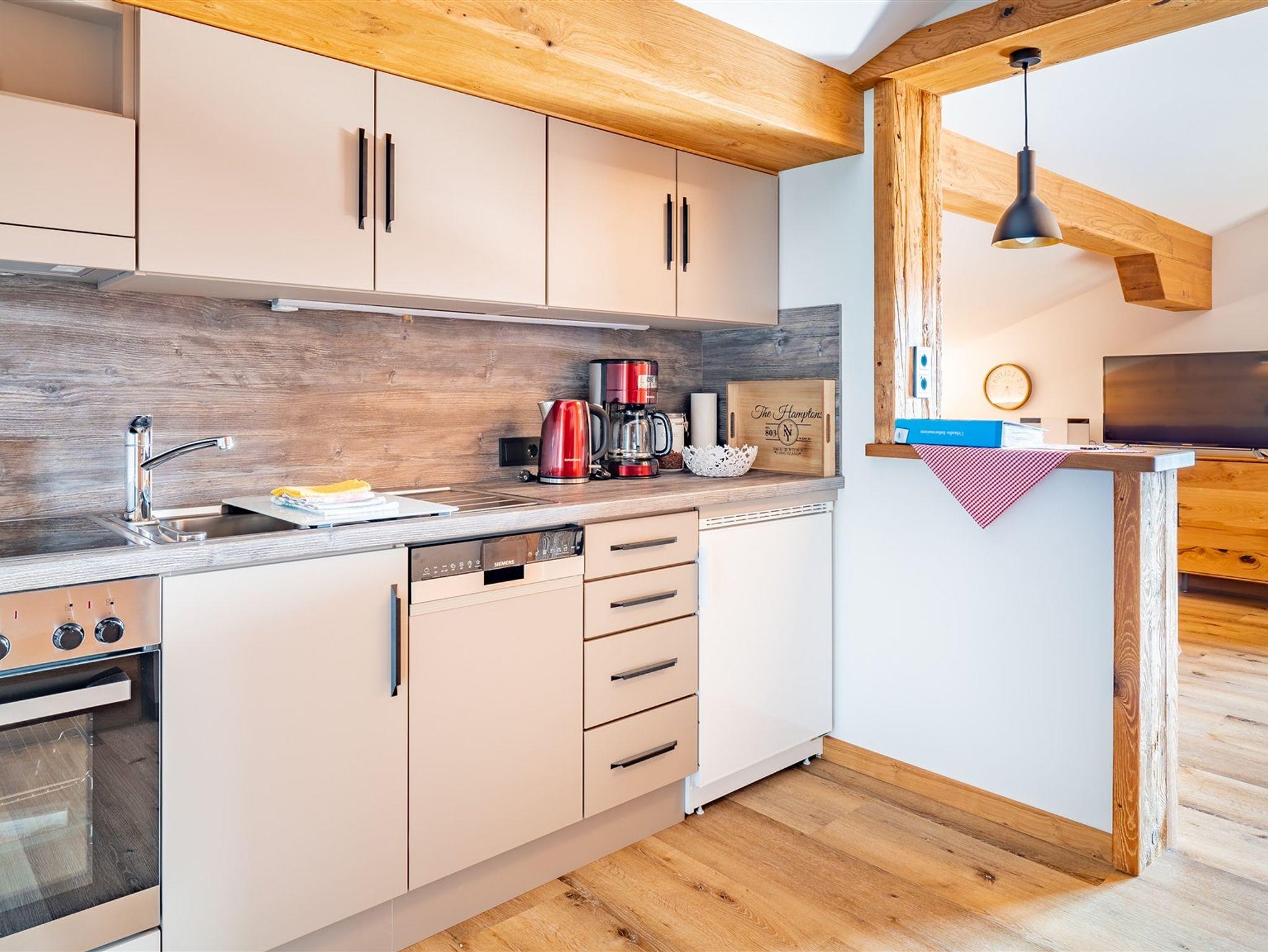 Topmoderne F*****Sterne DTV Dreiraum-Familienwohnung Edelweiß mit zwei separaten Schlafzimmern und zwei Bädern im Natursteindesign, sowie großzügigem Wohnzimmer mit Eckcouch und Essecke mit Stühlen,einer Schreinerküche (zum Wohnzimmer offen) und Balkon in Südwestausrichtung mit Kaiserblick!