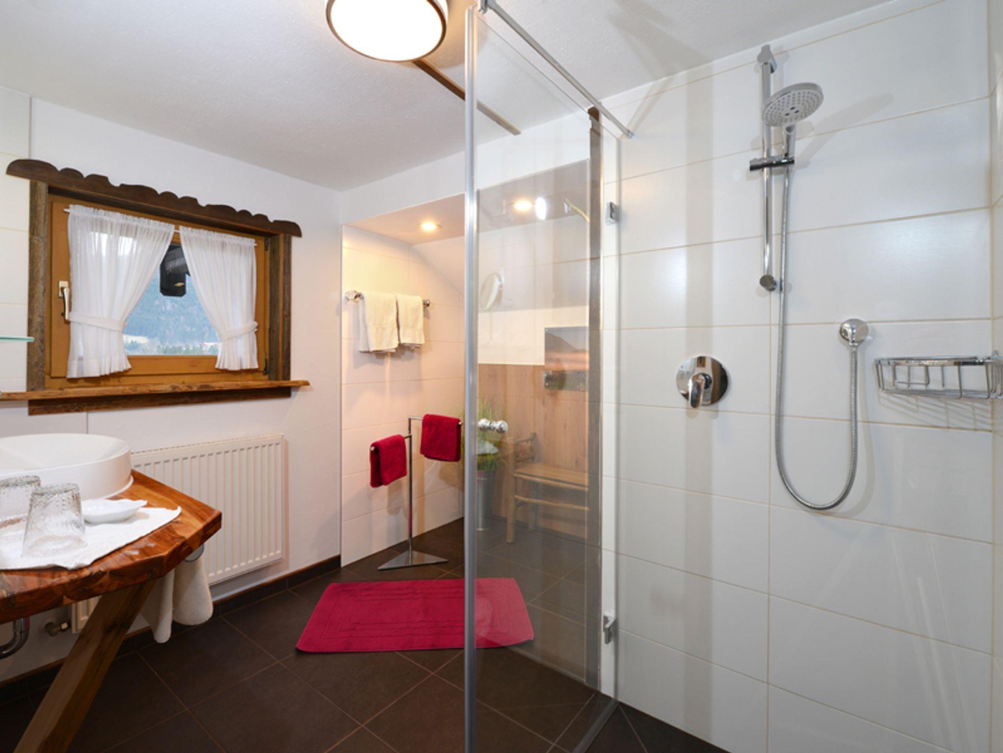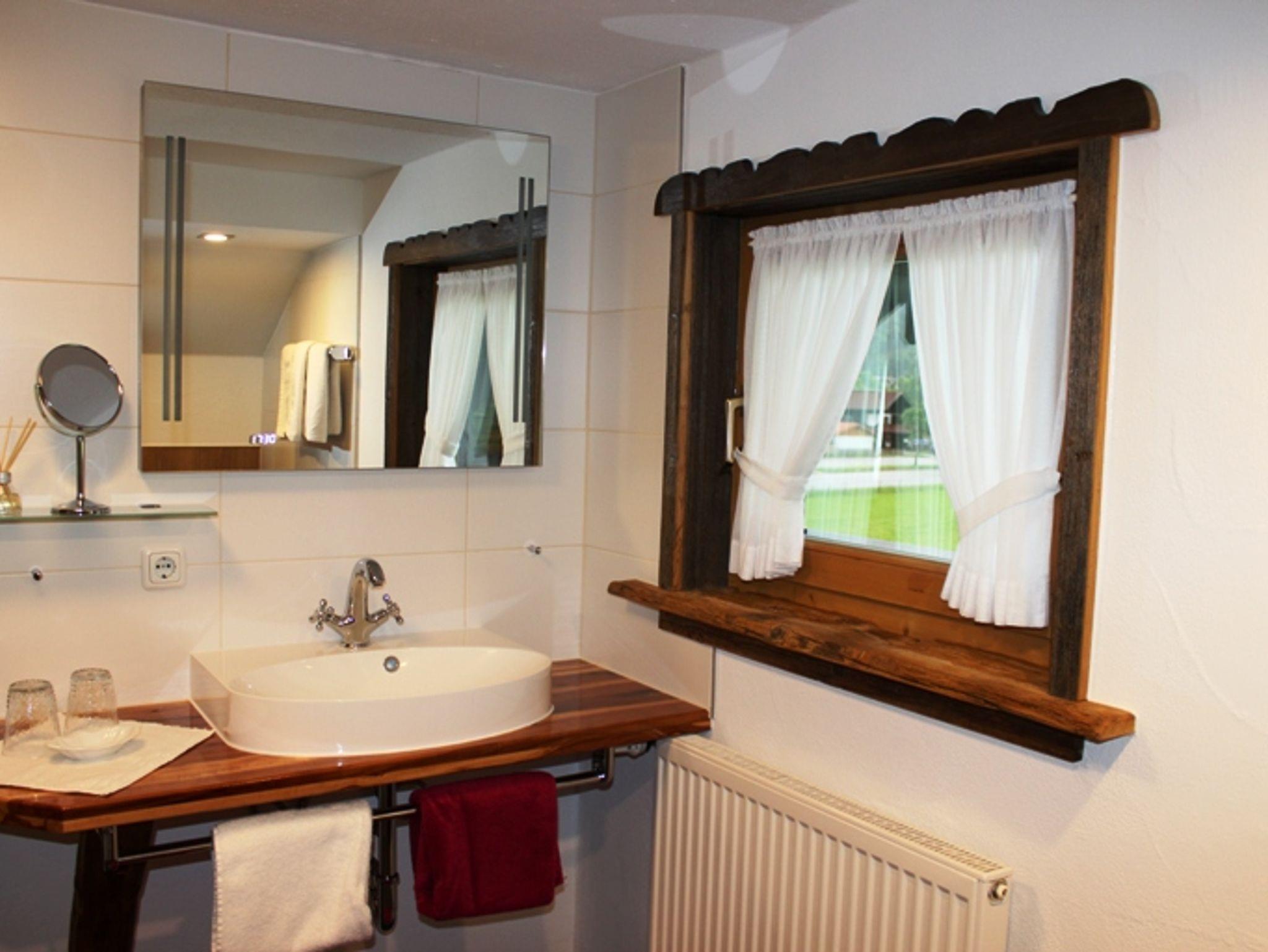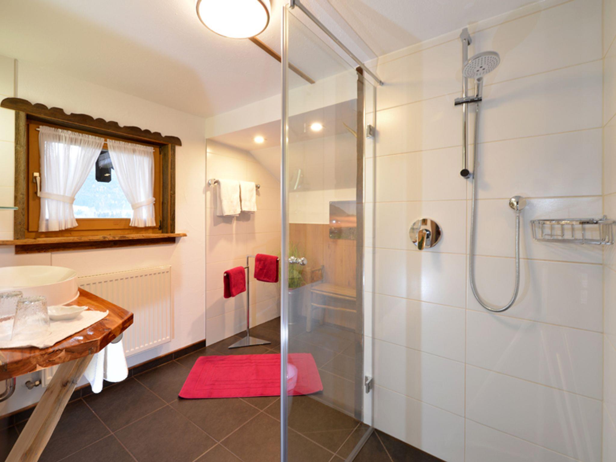Das Badezimmer ist mit Dusche (ebenerdigen Einstieg), Waschtisch aus heimischen Apfelbaum, Spiegel mit integrierter Beleuchtung und Uhr, Sitzgelegenheit, Komode für Utensilien, Fön und Kosmetikspiegel ausgestattet. Separates geräumiges WC.