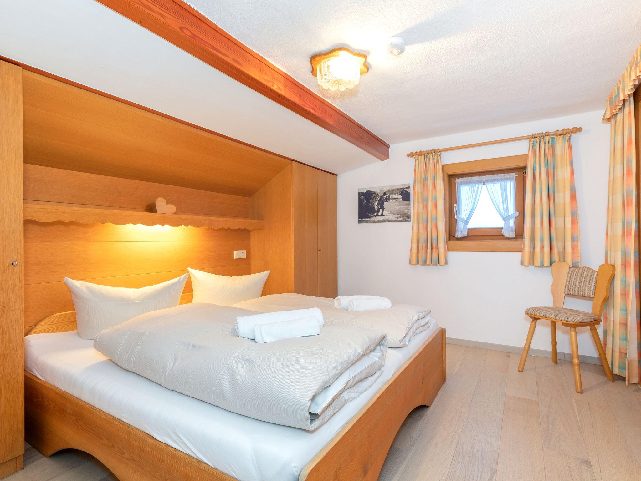 1 Schlafzimmer mit Doppelbett und Ostbalkon mit herrlichem Blick in die Berge.
