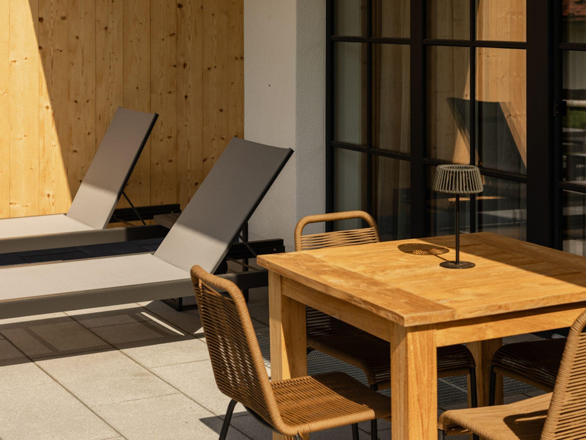 Große Sonnenterrasse: 35 m² mit Terrassenmöbeln und 2 Liegestühlen