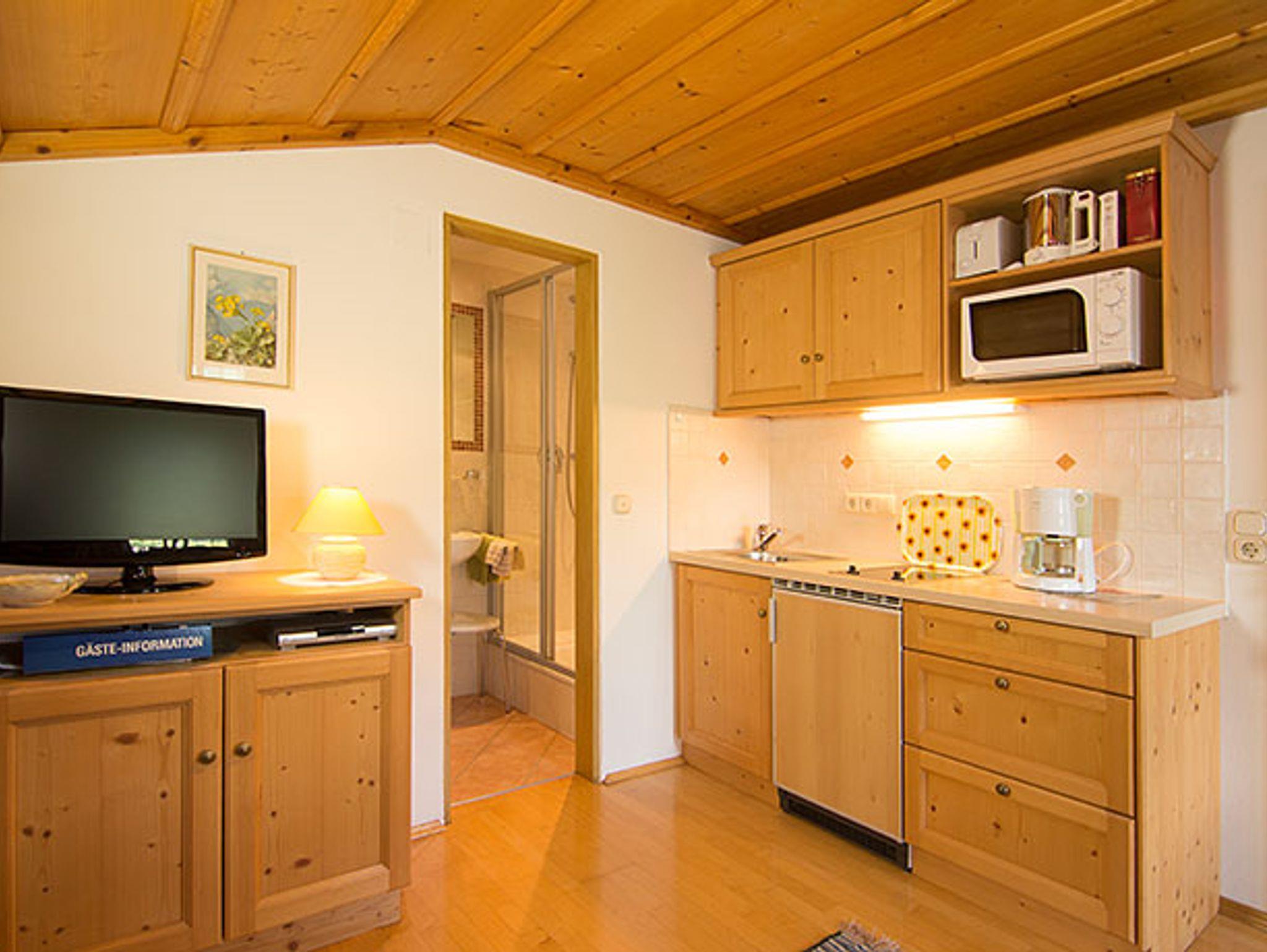 Die heimelige Wohnung wurde mit hochwertigen Möbeln von unserem Dorfschreiner mit viel Liebe zum Detail im heimischen Stil gefertigt. Das Doppelbett befindet sich in einer gemütlichen Dachschräge. Die Küchenzeile mit 2 Ceran-Kochfeldern, Mikrowelle, Wasser - Eierkocher, Toaster, Tassimo-Kapsel-Kaffeemaschine und vielen weiteren komfortablen Extras ausgestattet.