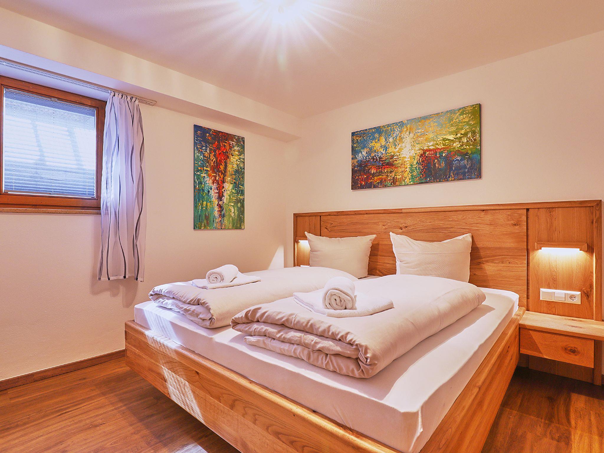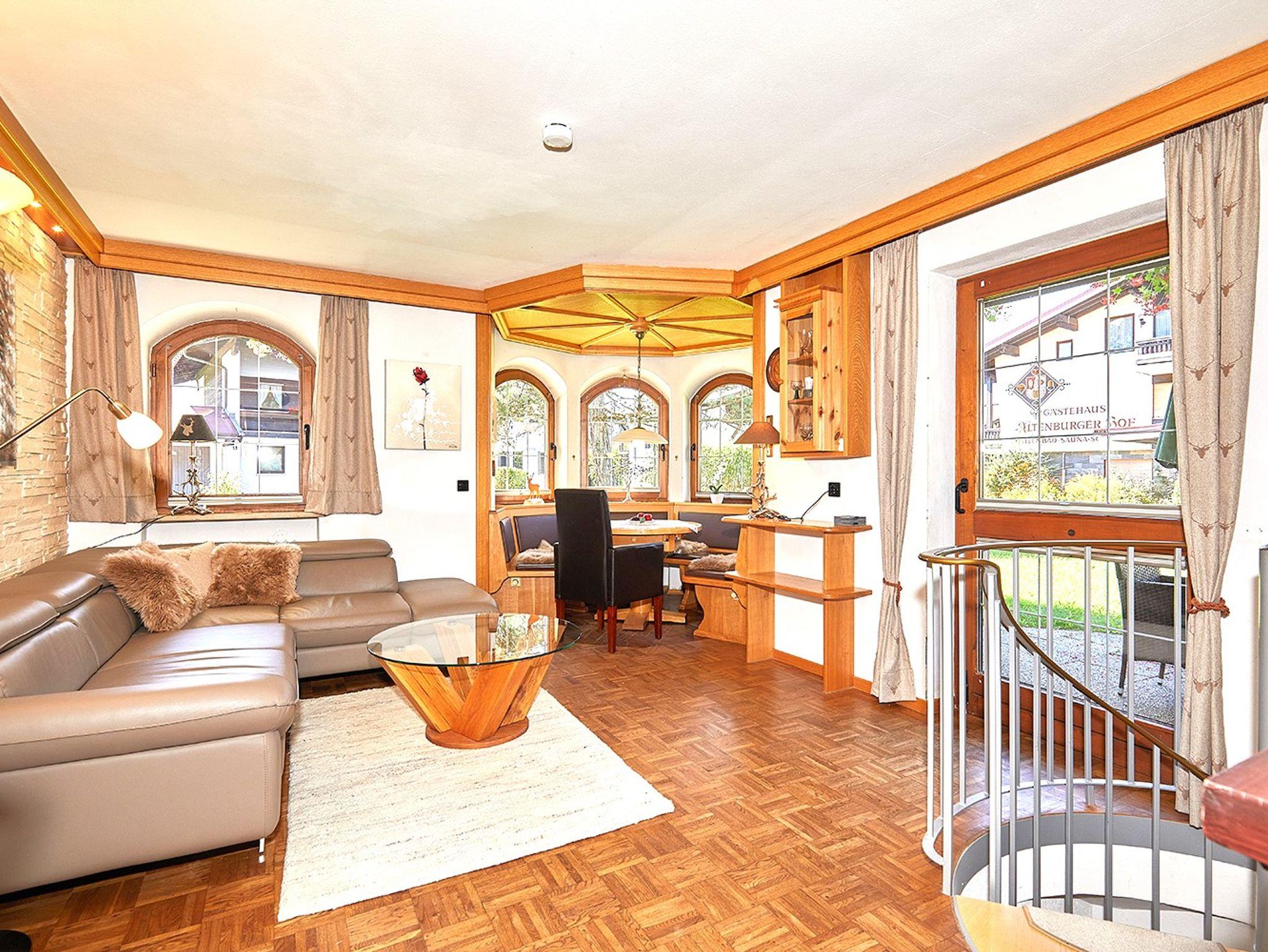 Der Wohnraum verfügt über eine Lederessecke im Erker und ist mit einer modernen Ledercouch, welche zusätzlichen Schlafplatz bietet, sowie einem Kabel-TV, einer Stereoanlage und einem DVD-Player ausgestattet. Weiters gibt es im Raum einen Elektrokamin, welcher besonders im Winter für entspannte Abende sorgt. Nebenan befinden sich eine separate Toilette, sowie die voll ausgestattete Einbauküche, welche keine Wünsche offen lässt. Über eine Wendeltreppe geht es hinunter ins Souterrain, in welchem sich das Schlafzimmer mit bequemen Doppelbett befindet. Die Wohnung verfügt außerdem über ein modernes Badezimmer und eine nach Süden ausgerichtete möblierte Terrasse, die einen herrlichen Blick auf die umliegende Bergwelt bietet und jederzeit zum Verweilen einlädt. Zudem stehen für unsere Gäste eine Sauna, ein Aufenthaltsraum, ein Ski-Raum, WLAN und ein eigener Garagenparkplatz zur Verfügung.