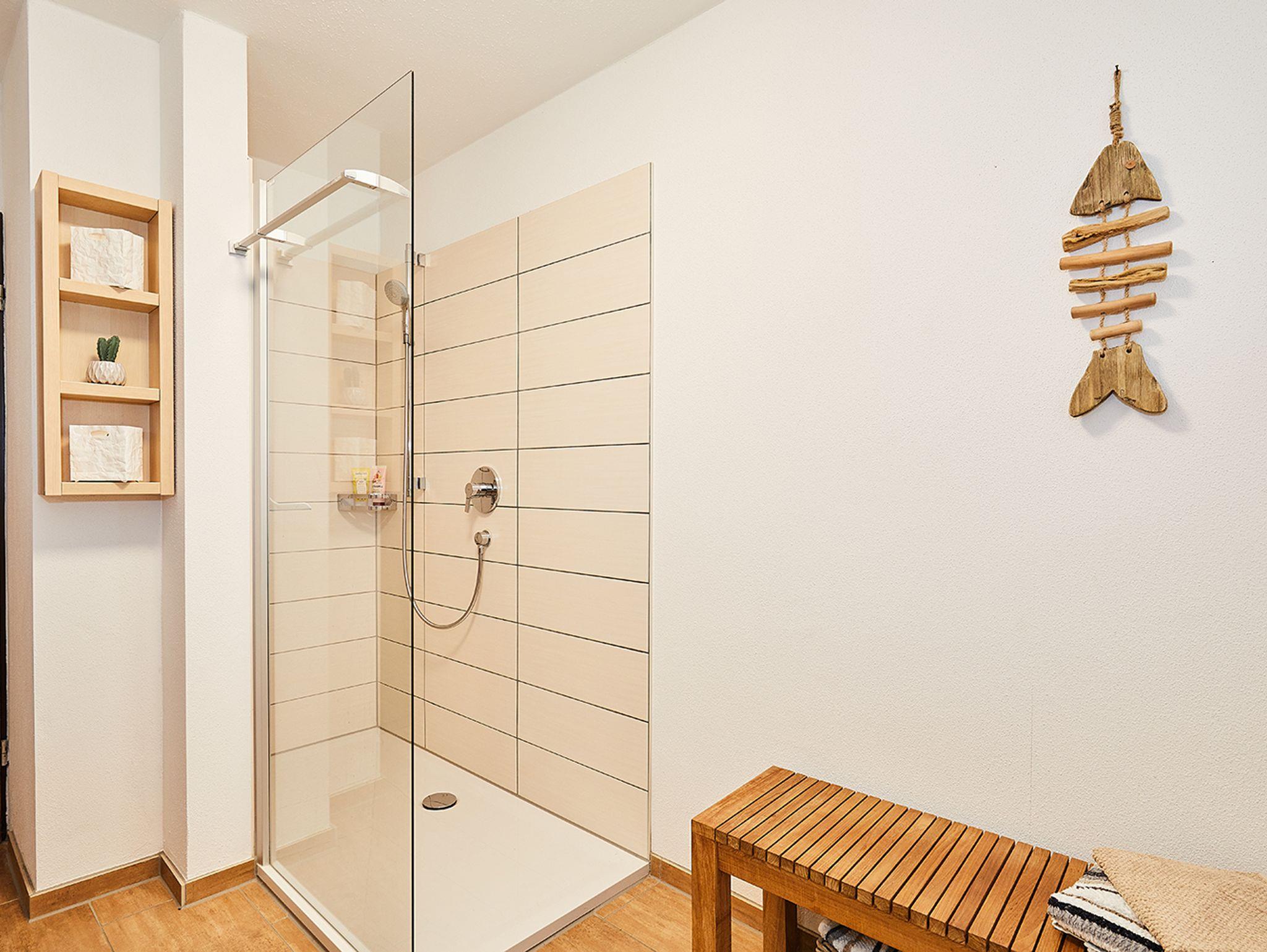 Im EG gibt es auch ein Schlafzimmer mit Doppelbett und eigener Dusche.