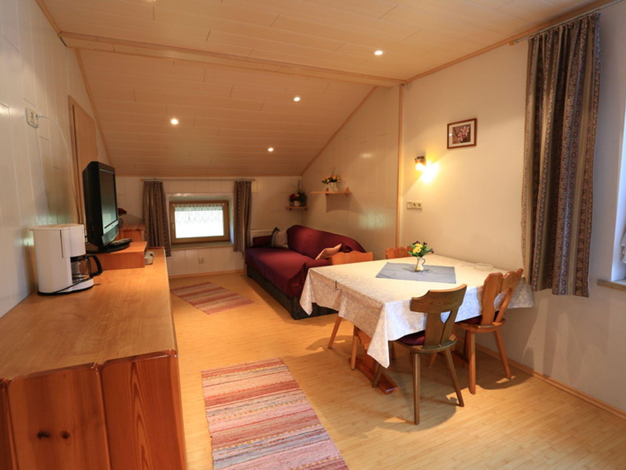 Diese Zwei-Raum-Wohnung mit 46 m² befindet sich im 2. Obergeschoß und bietet Platz für zwei Personen. Die Wohnküche ist ausgestattet mit Mikrowellenherd, 2-Platten-Herd, Kühlschrank mit Gefrierfach, Kaffeemaschine, Toaster, Eier- und Wasserkocher und verfügt über eine Essecke. Im Wohnbereich befindet sich eine gemütliche Schlafcouch sowie ein Flachbildfernseher. Das Schlafzimmer ist ausgestattet mit Doppelbett und einer gemütlichen Sitzgelegenheit. Bad mit Dusche/WC. Der eigene Balkon bietet einen herrlichen Blick auf das Kaisergebirge.
