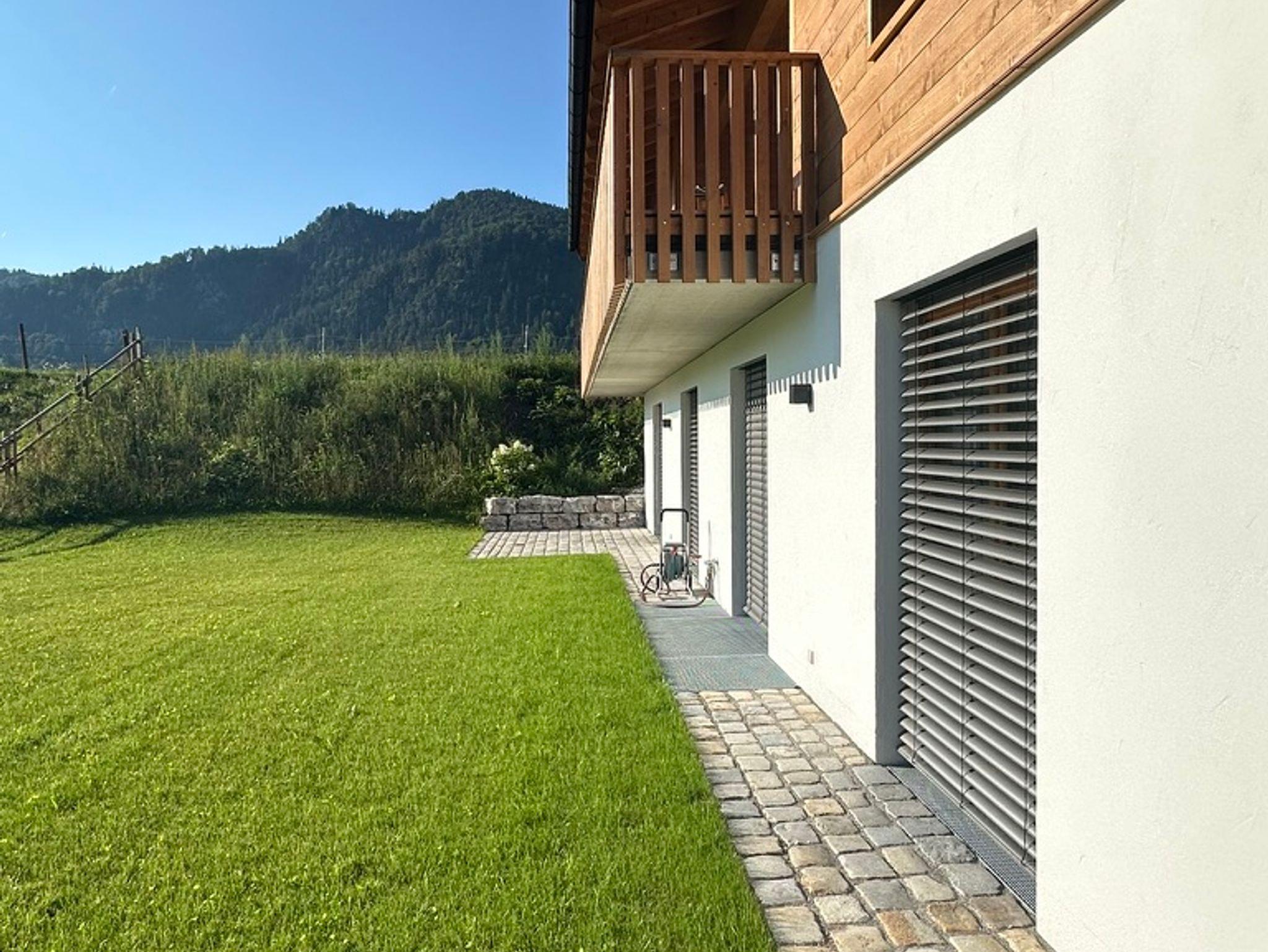 Zum Ferienhaus gehören eine großzügige überdachte Loggia und eine offene Terrasse im Obergeschoss sowie ein sonniger, südwestlich gelegener Garten.
