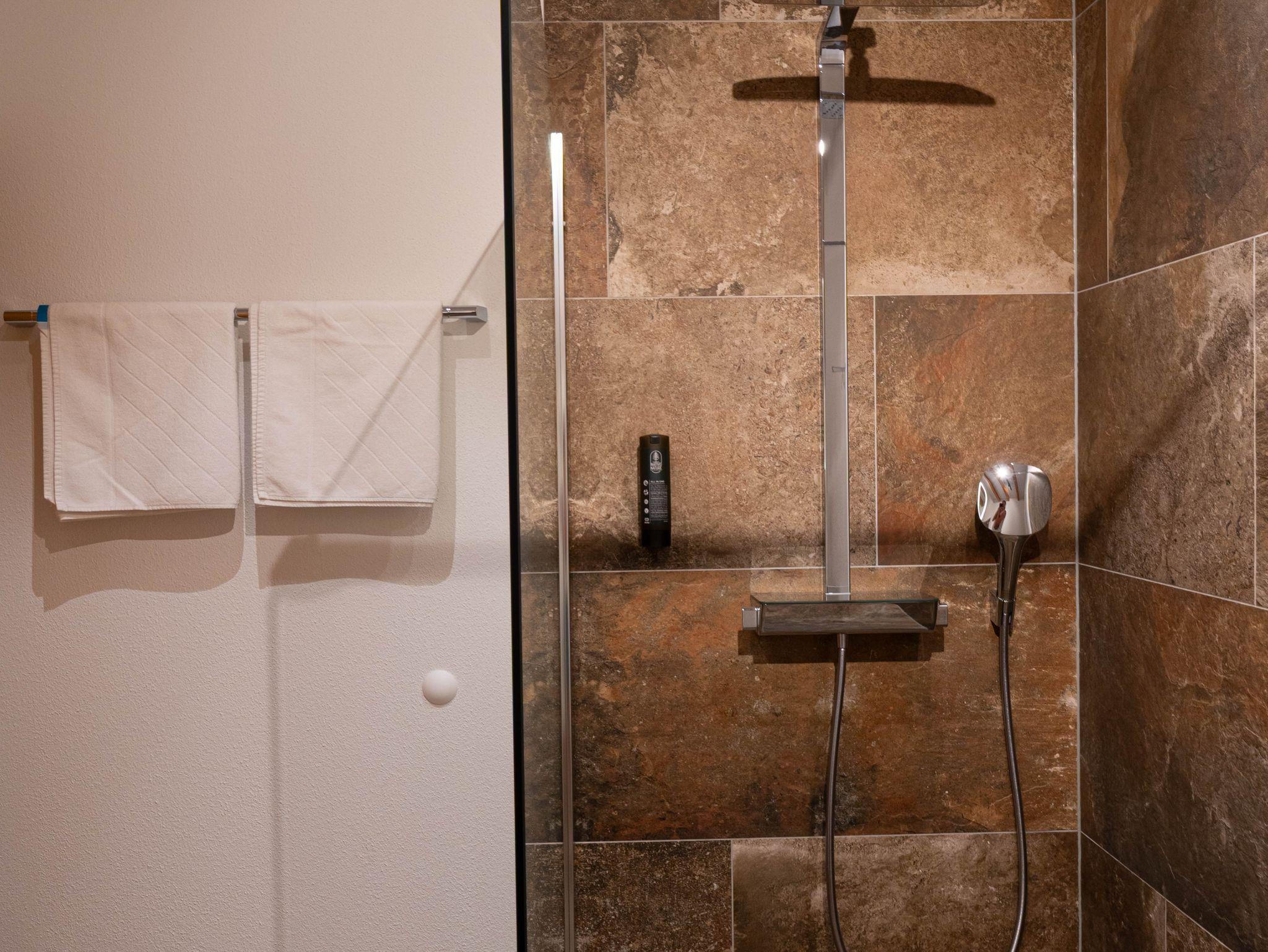 Das Badezimmer ist mit einer begehbaren Dusche und einem luxuriösen Raindance-Duschkopf ausgestattet – für ein echtes Wellness-Gefühl. Fön sowie weiche Hand- und Duschtücher stehen für Sie bereit.