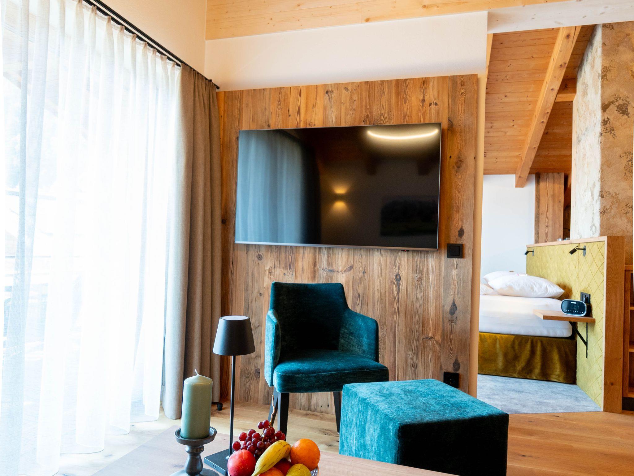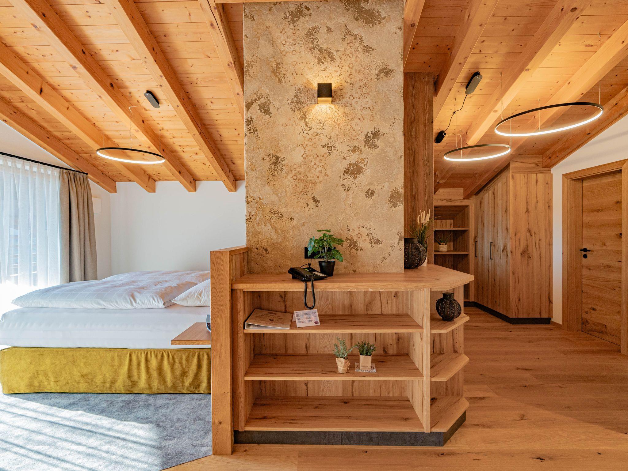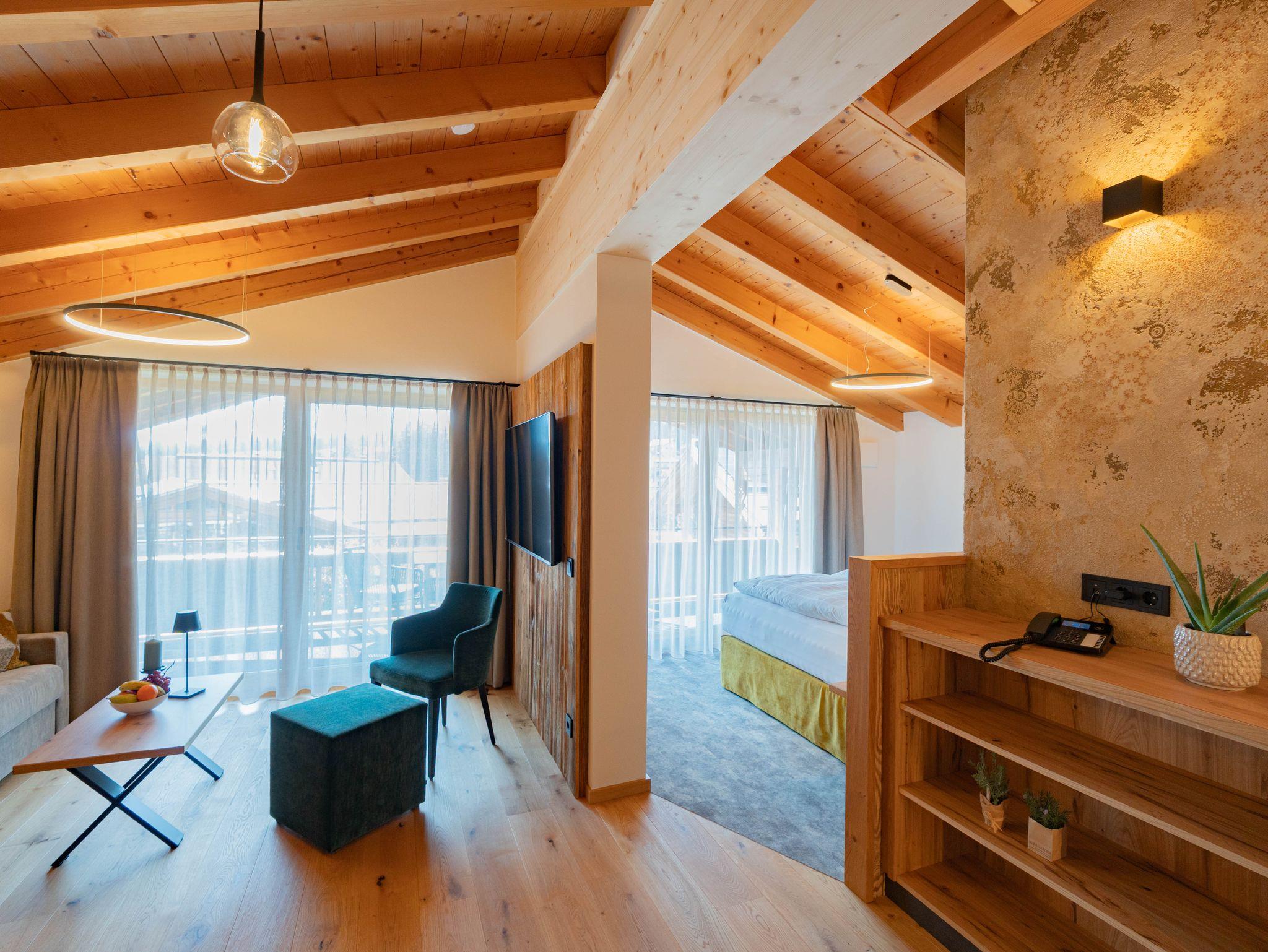 Einzigartig und mit einem atemberaubenden Blick auf die umliegende Bergkullisse begeistert unsere Dachgeschoss-Suite „Stoaadler“.