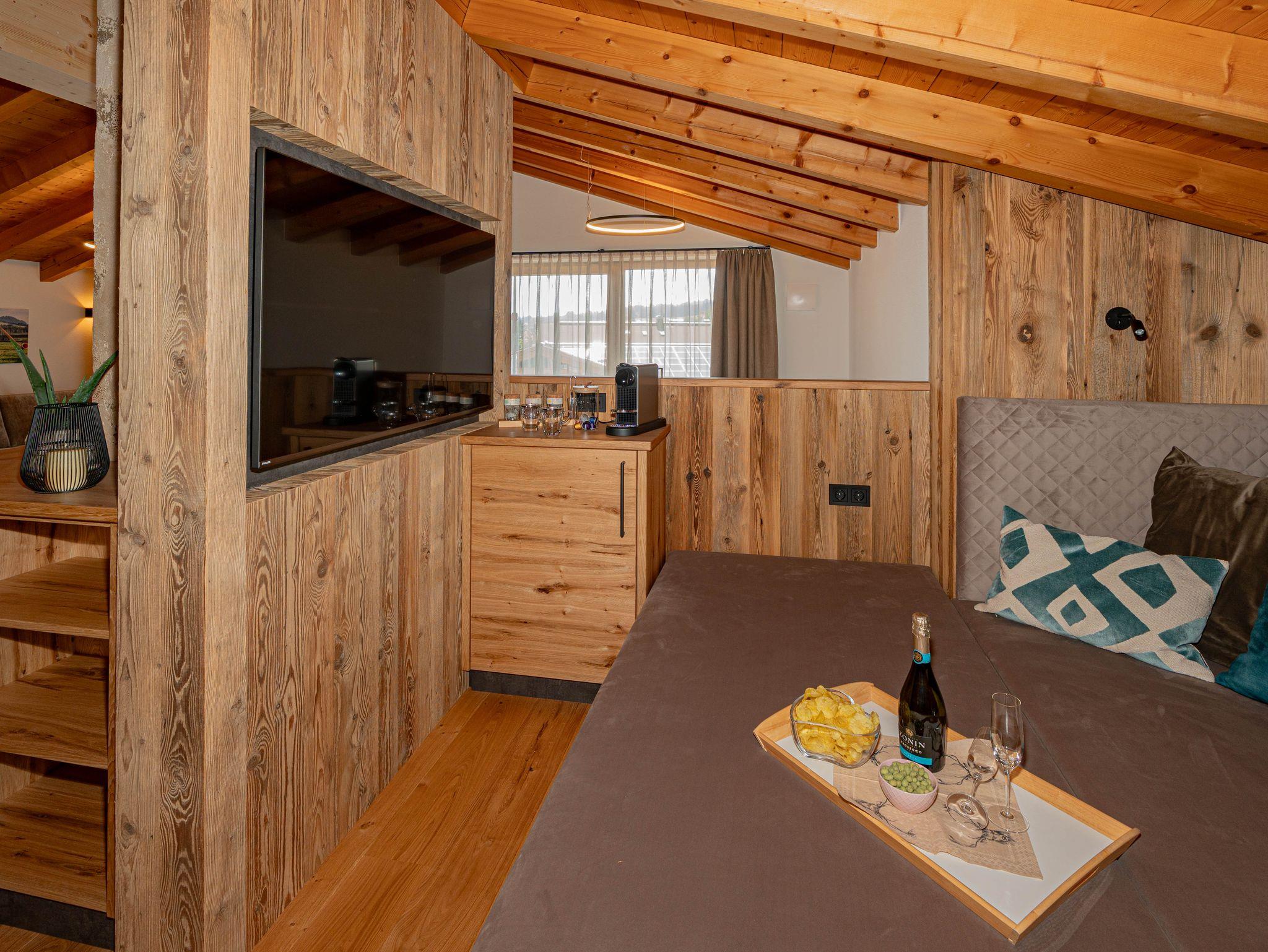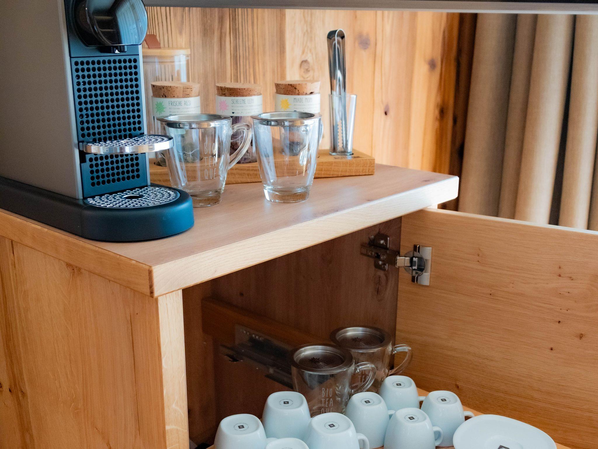 Die Kaffee- und Teebar mit Nespresso-Kapselmaschine neben der gemütlichen Kuschelecke, die eine großzügige Liegefläche und einen großen LED-Smart-TV bietet – lädt zu entspannten Stunden nach einem Tag in den Bergen ein.