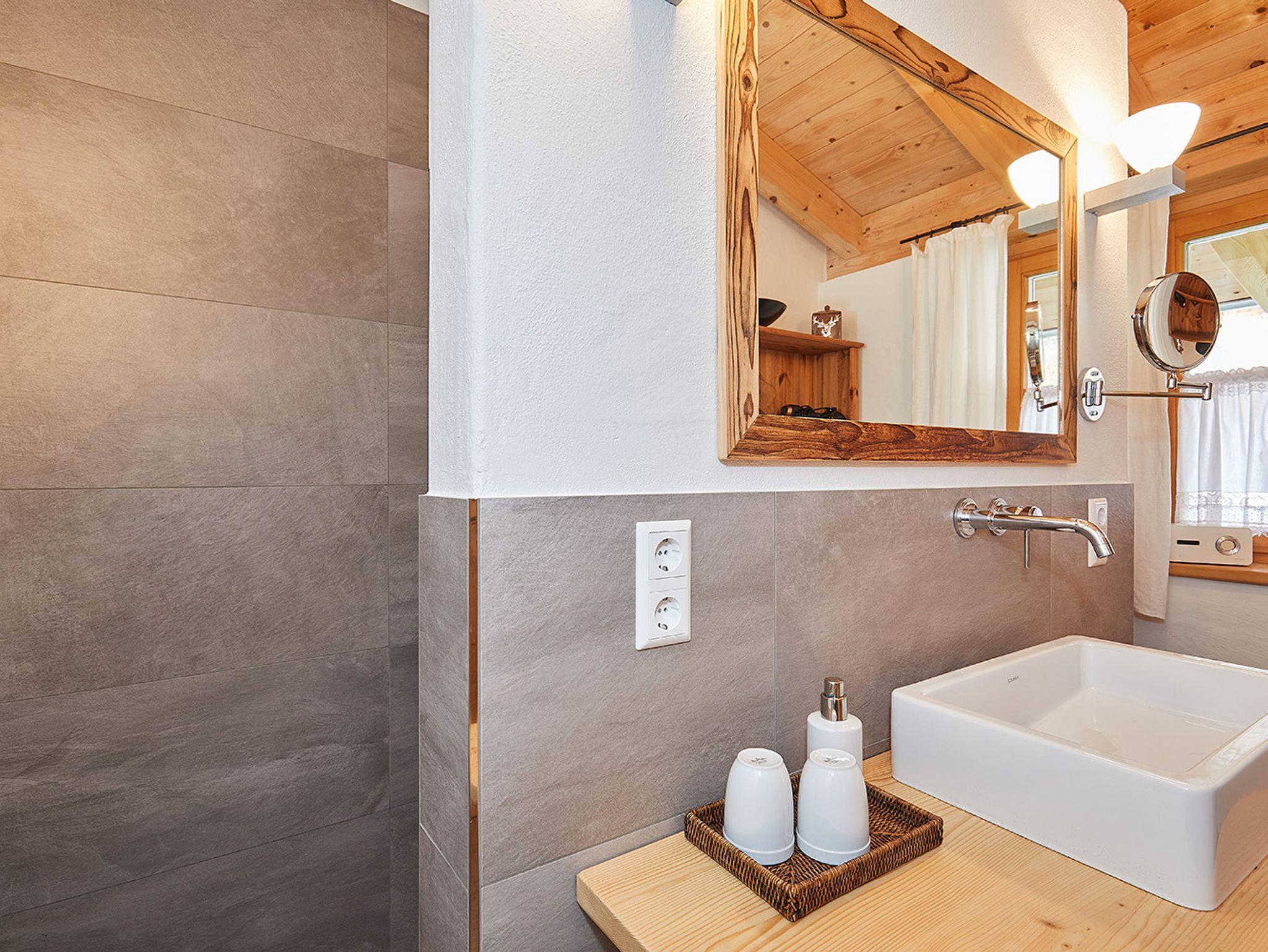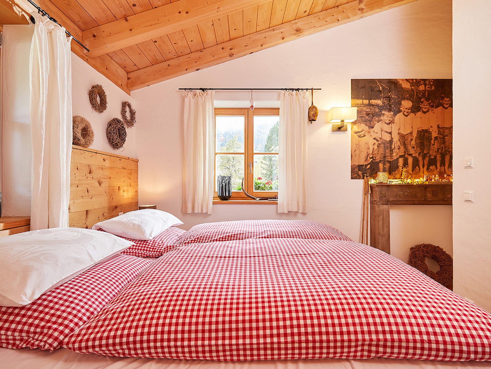 Der Schlafbereich ist durch einen offenen Durchgang zu erreichen. Das bequeme Boxspringbett mit der typisch bayerischen rotweiss karierten Bettwäsche lädt zum träumen ein. Von dort geht es in Ihr Badezimmer mit ebenerdiger Dusche, abgetrenntem WC, einem großen Holzregal für alle Ihre Utensilien. Für kalte Tage finden Sie dort auch eine Wärmflasche.