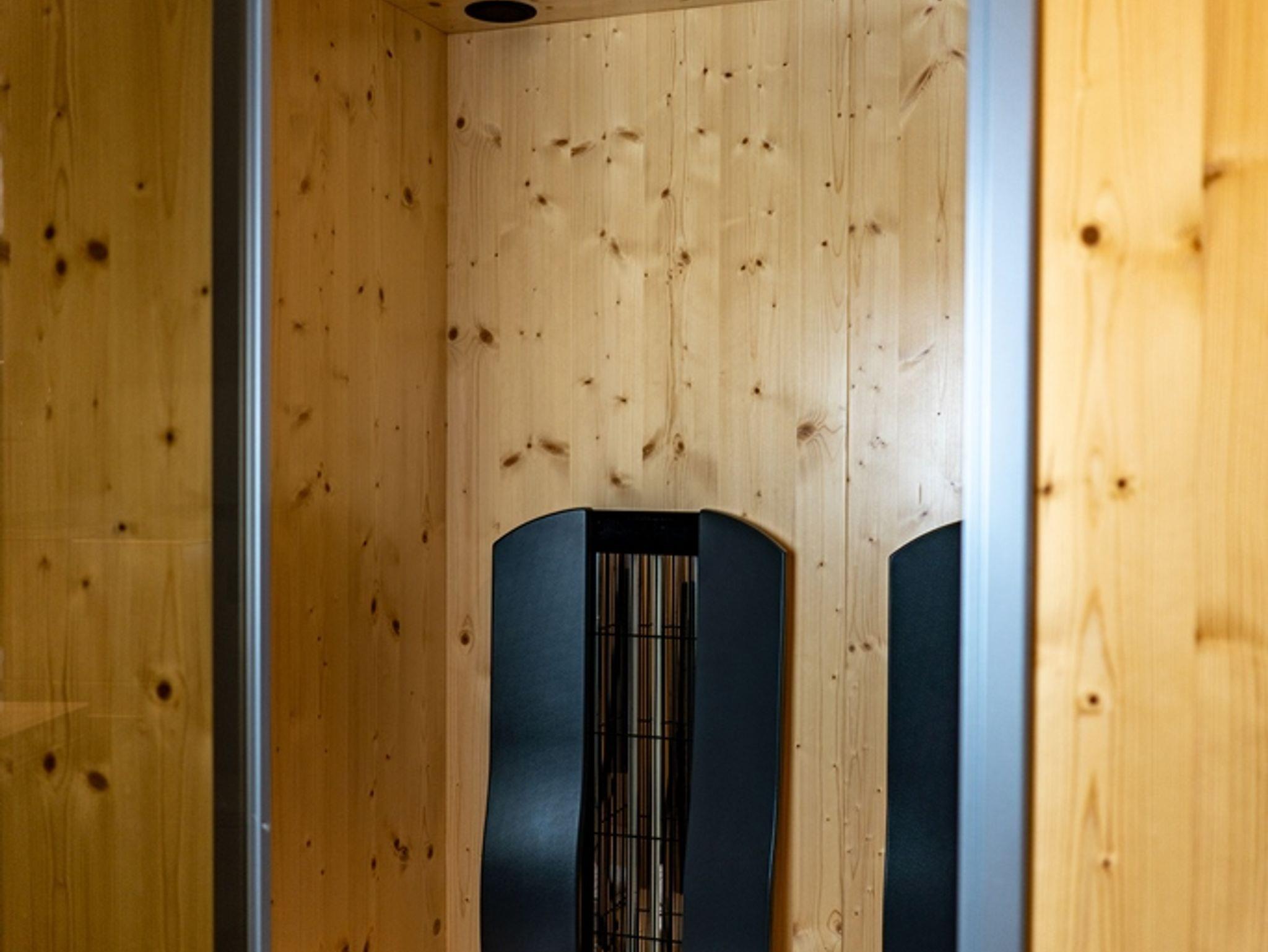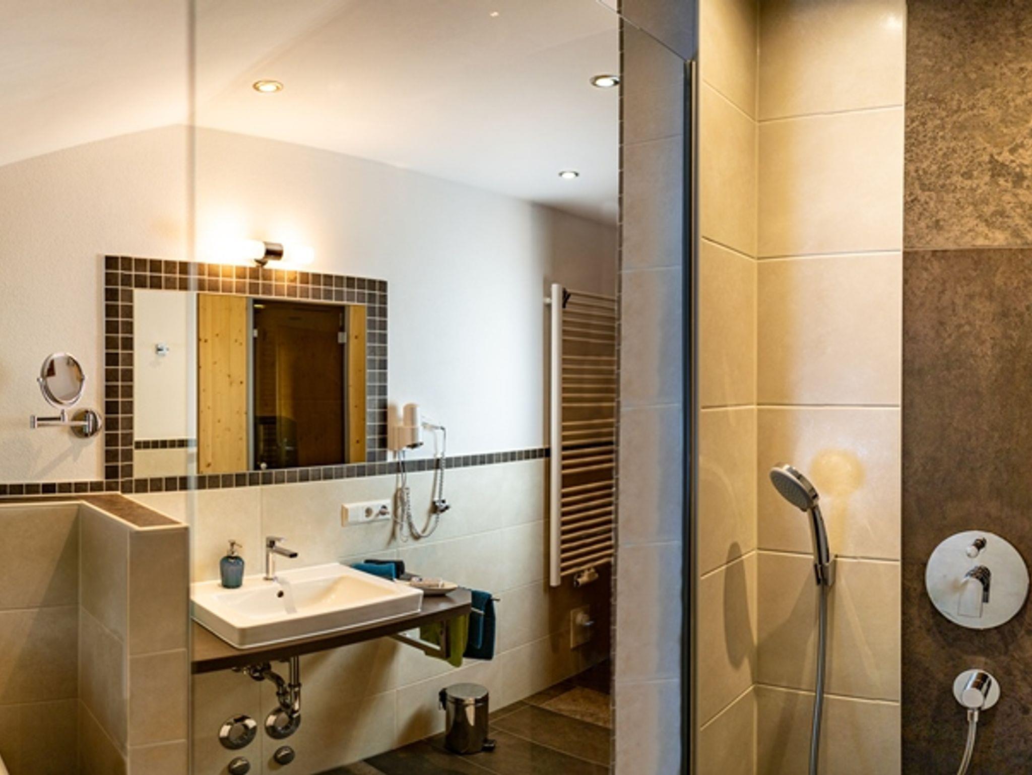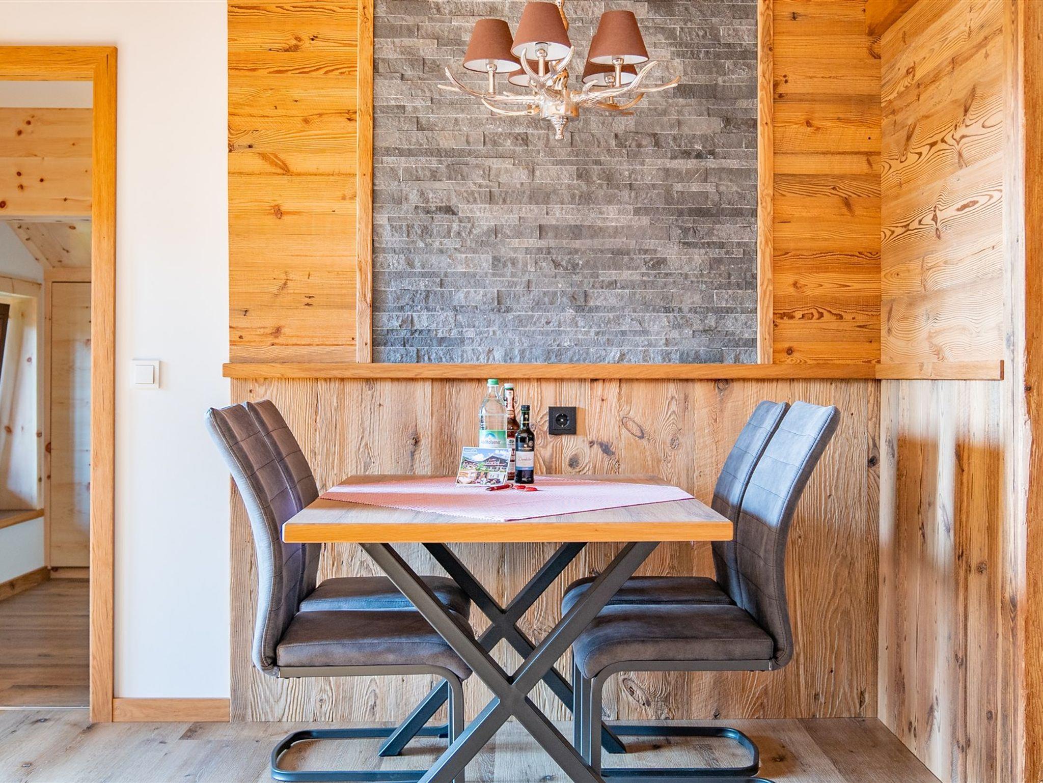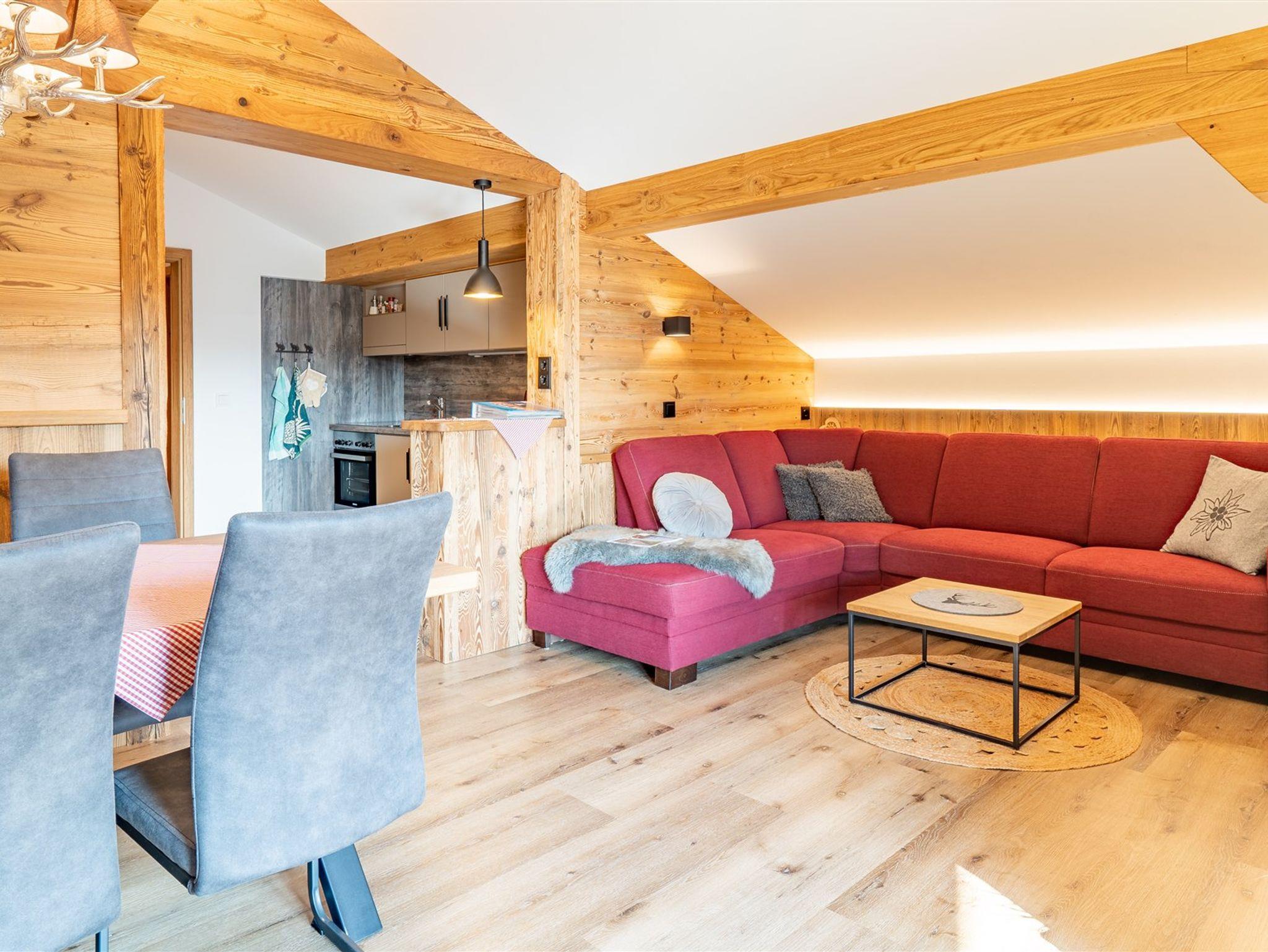 Praktische Wohnküche mit Essecke und Stühlen, Durchgang zum Wohnzimmer mit Ledereckcouch, im neuen Anbau ein elegantes Wellnessbad mit schwellenloser Dusche und Infrarot Wärmekabine, sowie ein Schlafzimmer mit Zirbenholzdetails.
