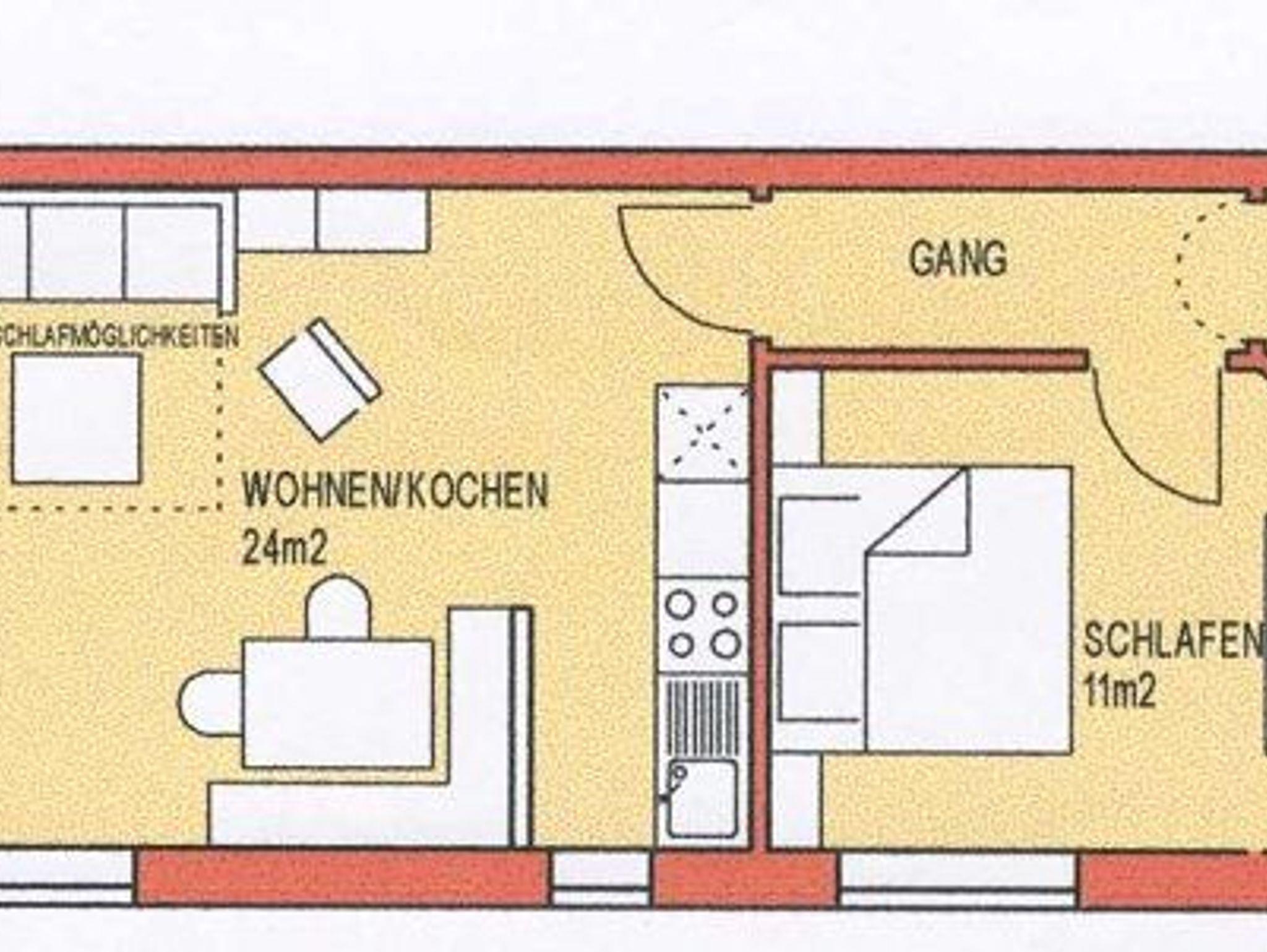 Die gemütliche Zwei-Raum-Ferienwohnung für 2-3 Personen hat eine Größe von 45 m². Die Wohnung verfügt über einen separaten Eingang. Im gemütlichen Wohnraum ist eine Küchenzeile sowie eine Essecke integriert. Die Couch kann für eine weitere Personen aufgebettet werden. Das Extra-Schlafzimmer ist mit einem Doppelbett Breite 1,80m ausgestattet. Das Bad verfügt über eine Dusche, Waschbecken und WC.