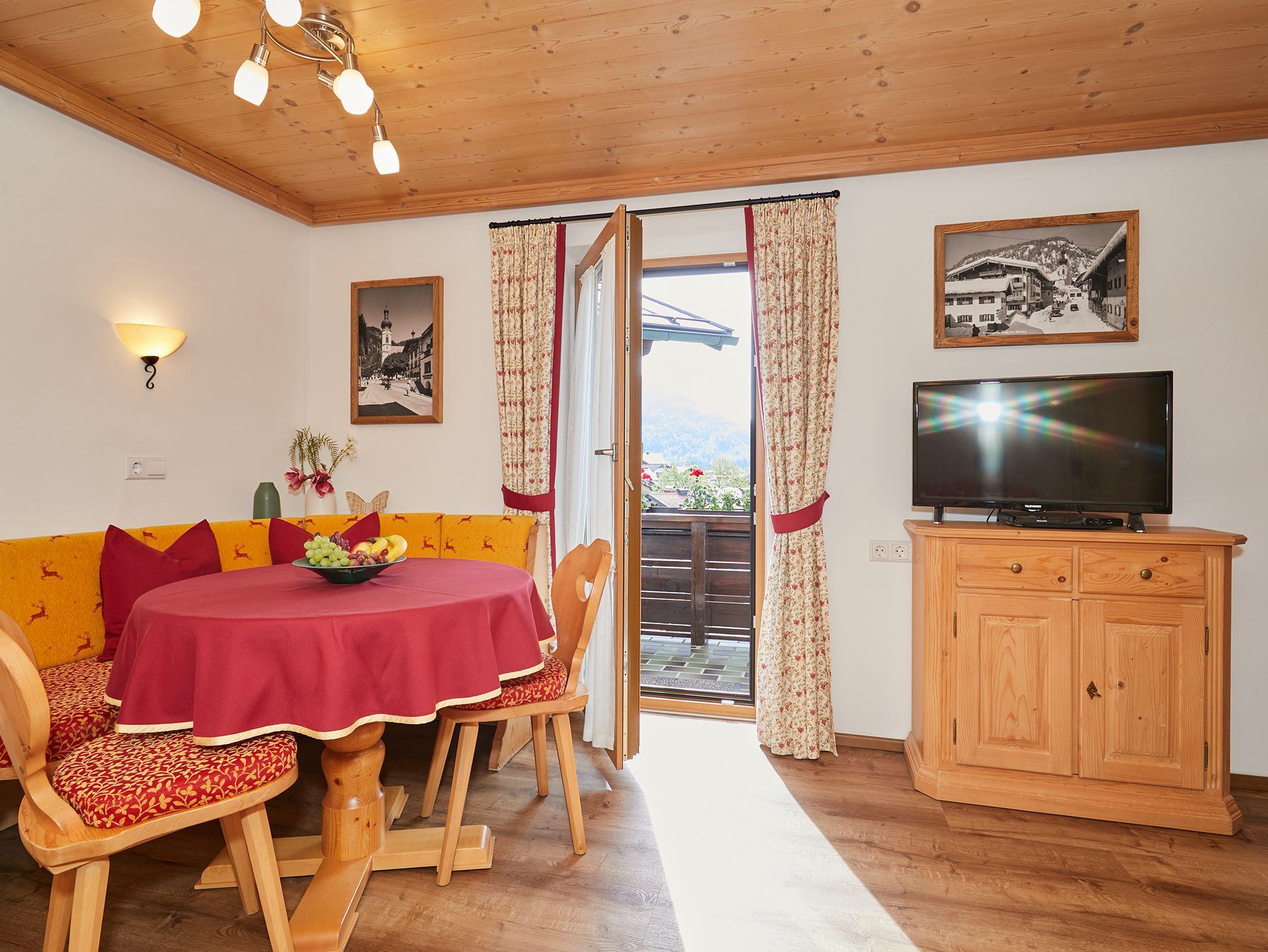 Unsere umfangreich renovierte, gemütlich, liebevoll und komfortabel im Landhausstil neu eingerichtete Wohnung Bergblick befindet sich im 1. OG. Von Ihrem Südost-Balkon haben Sie einen wunderschönen Blick auf Reit im Winkl und die umliegenden Berge. Der gemütlich eingerichtete Wohnraum mit einer Eckbank und einer komfortablen Couch ist mit Flachbild-TV, DVD-Player sowie Stereoanlage ausgestattet. Die separate kleine Küche ist komplett ausgestattet (Mikrowelle, Kühlschrank mit Gefrierfach, Toaster, Wasserkocher). Leckere Schmankerl lassen sich dort gut zubereiten. Das Schlafzimmer ist mit einem Doppelbett (verstellbaren Lattenroste und Bandscheibenmatratzen) eingerichtet. Bettwäsche und Handtücher werden gestellt.
