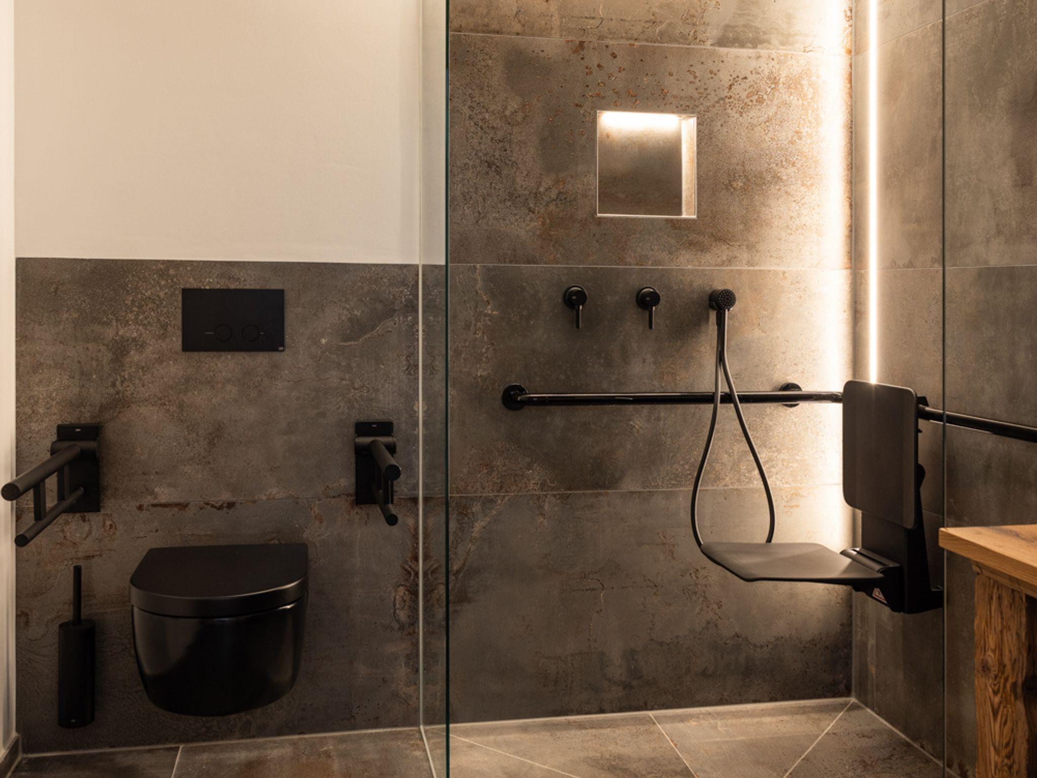 55?m² behindertengerechter Komfort, der Freiheit spürbar macht: Diese schwellenlose Wohnung für zwei Personen verbindet durchdachte Zugänglichkeit mit exklusiver Einrichtung und liebevollen Details. Freuen Sie sich auf ein großzügiges Bad mit Duschsitz, WC mit Stützhilfe, gemütliches Boxspringbett, Ledersofa und eine große Sonnenterrasse für Ihre persönliche Auszeit im Grünen.