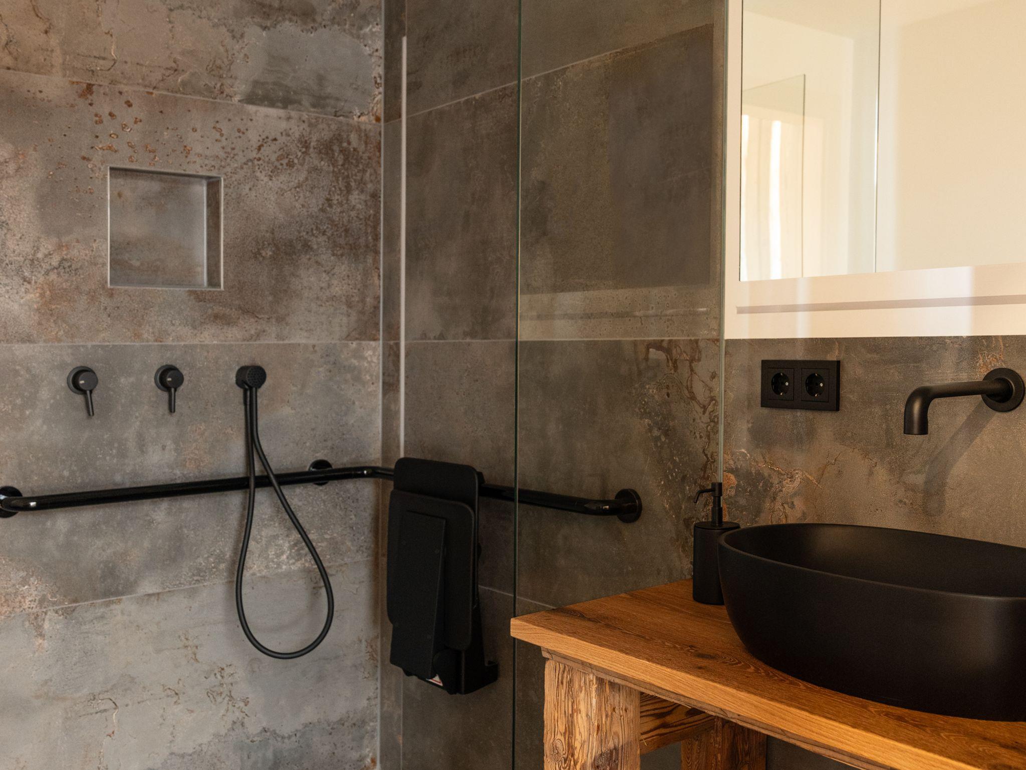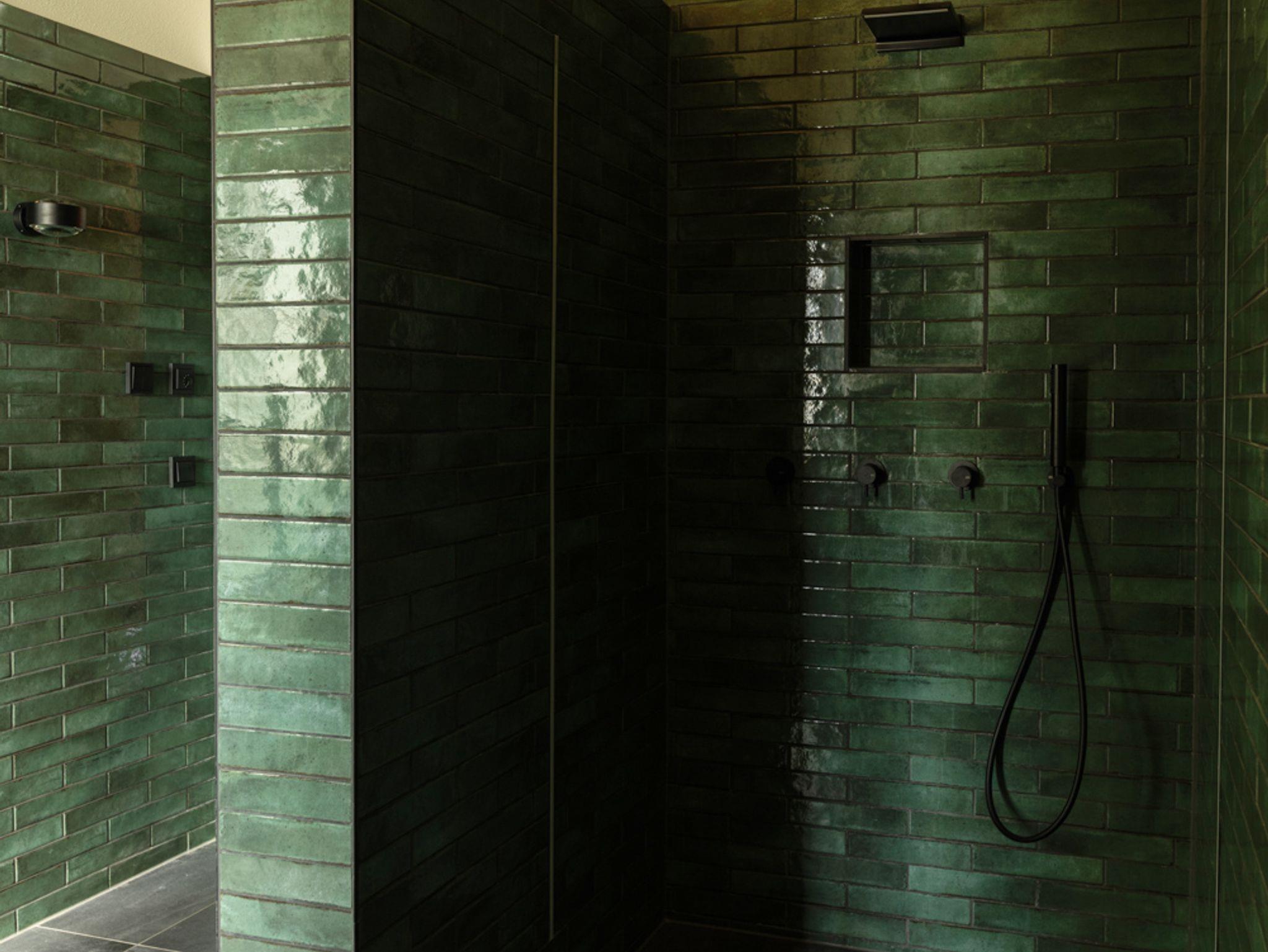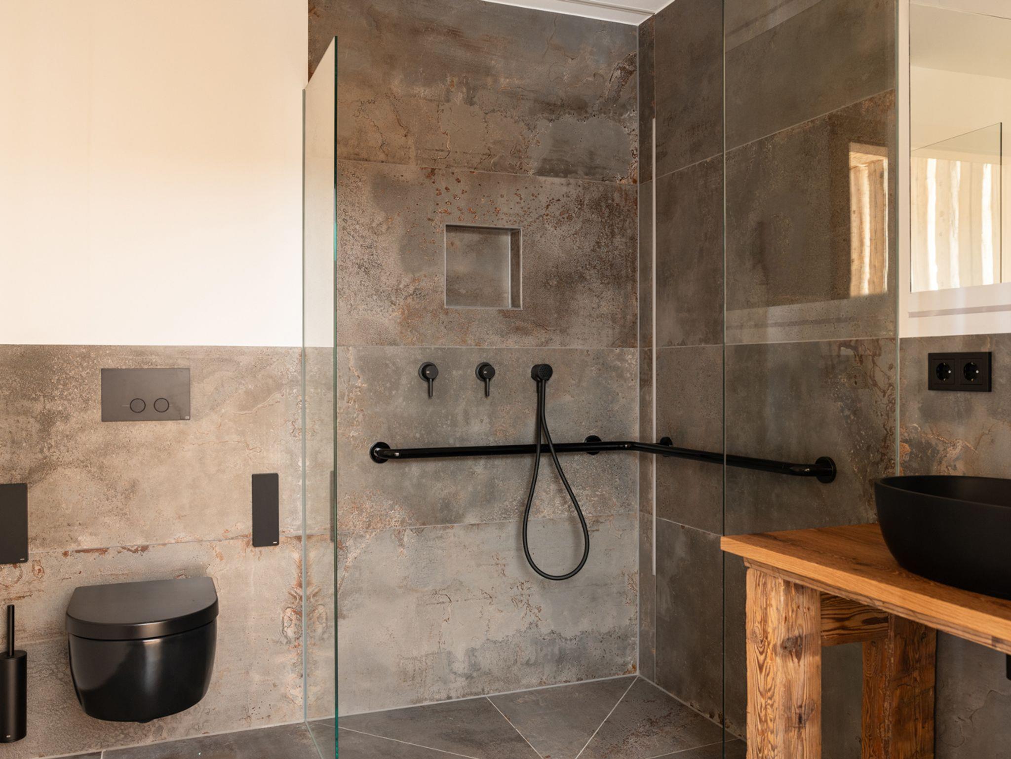 Separates Bad mit ebenerdiger Regendusche, Waschtisch und WC