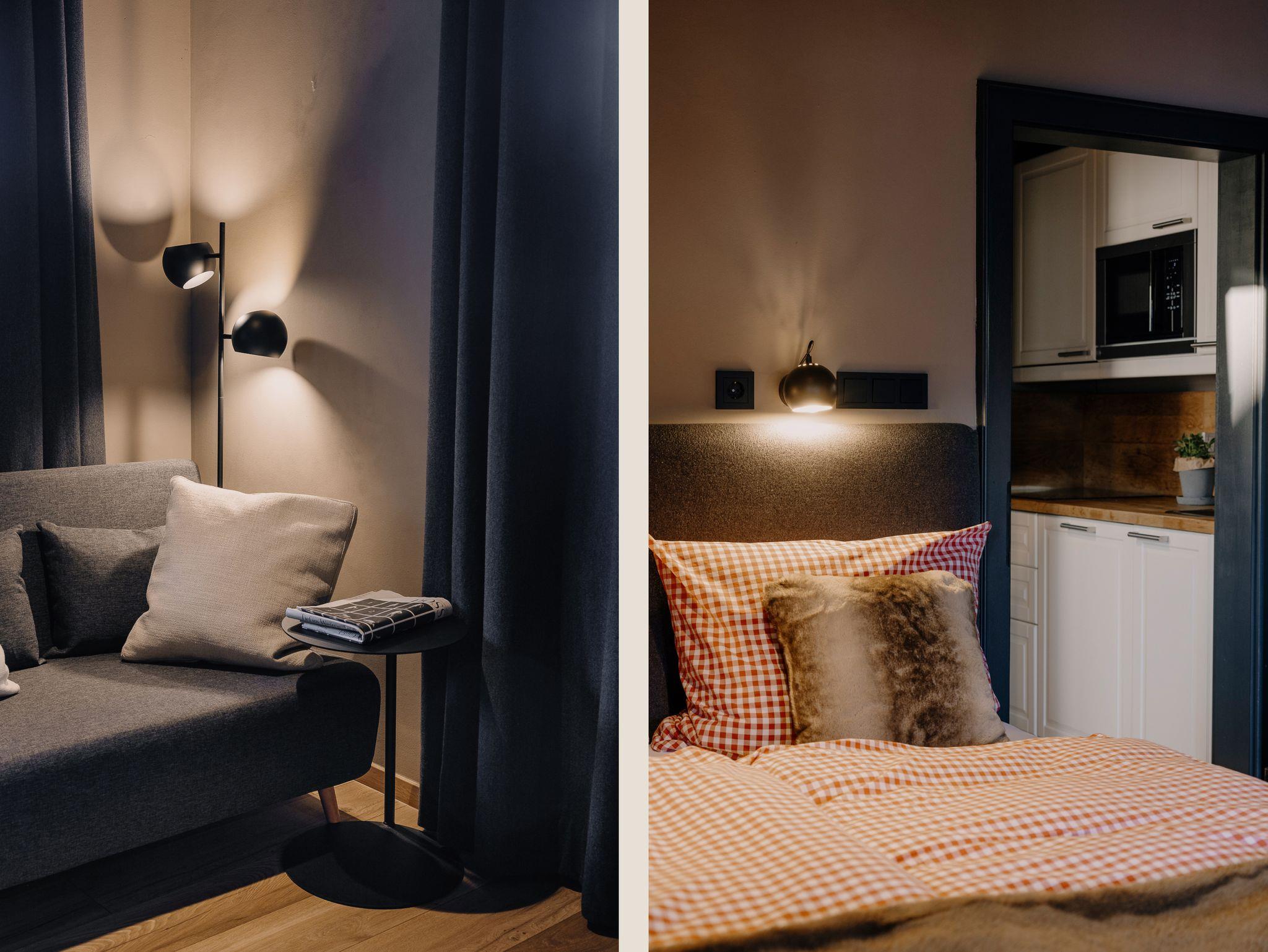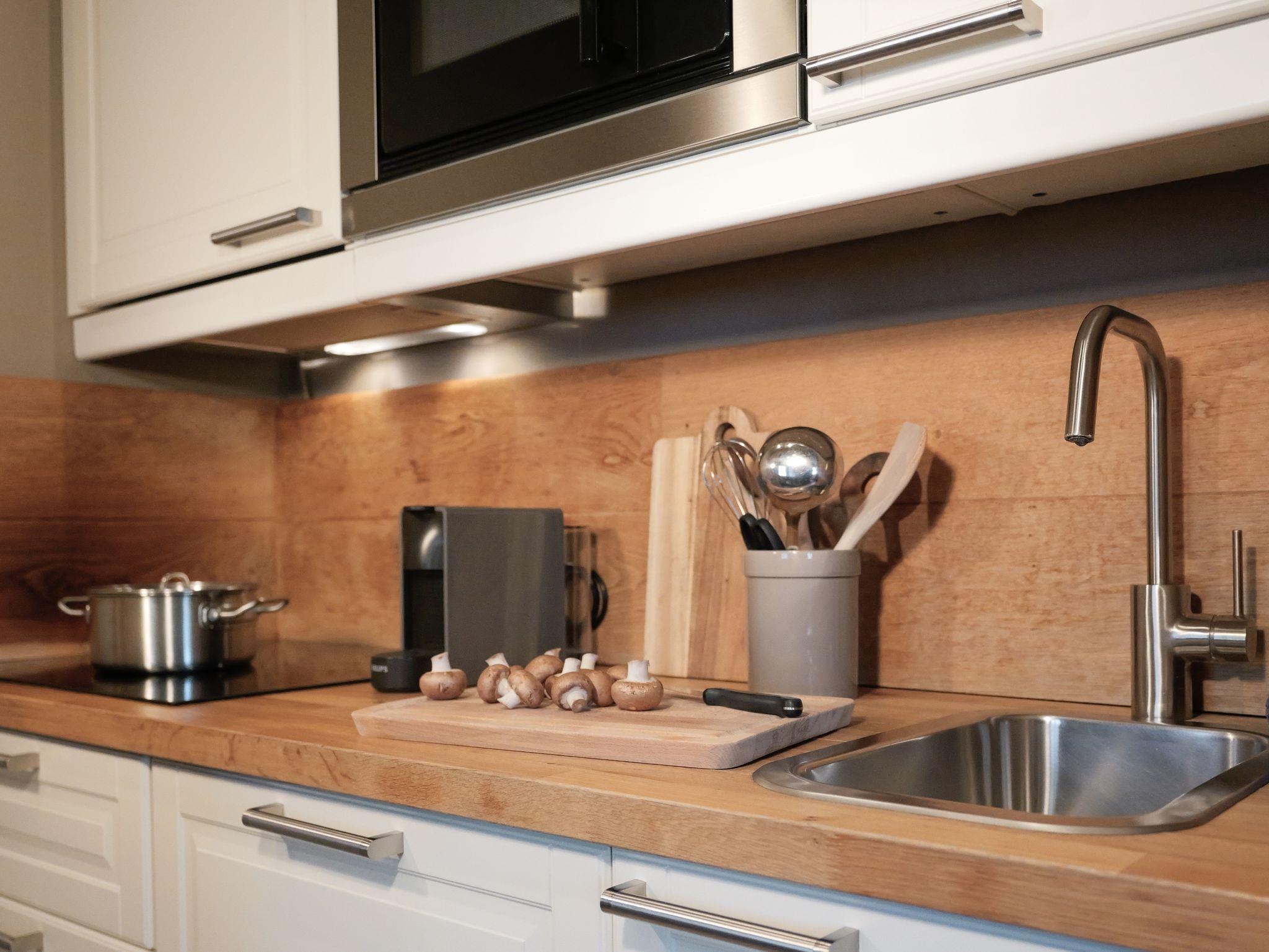 Das kleine Apartment im modernen Landhausstil besteht aus einem kombinierten Wohn-Schlafraum mit Doppelbett (160x200), Flat-Screen-TV, einem alten Bauernschrank und Holztisch sowie einem Schlaf-Sofa (120x200), einer gut ausgestatteten Küchenzeile und einem modernen Bad mit Dusche, großem Spiegel und Steinwaschbecken.