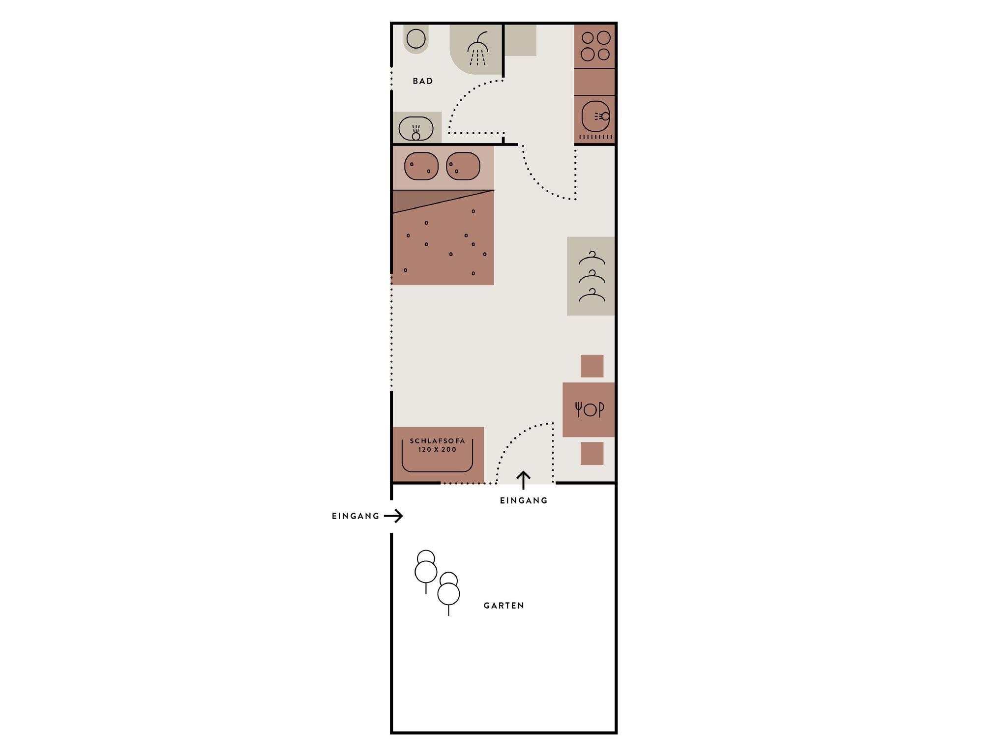 Das Apartment liegt im Erdgeschoss verfügt über einen eigenen Eingang, eine möblierte Terrasse sowie einen nach Süden ausgerichteten, privaten Garten. Es ist für zwei Erwachsene oder eine Familie mit ein/zwei kleinen Kindern ausgelegt.