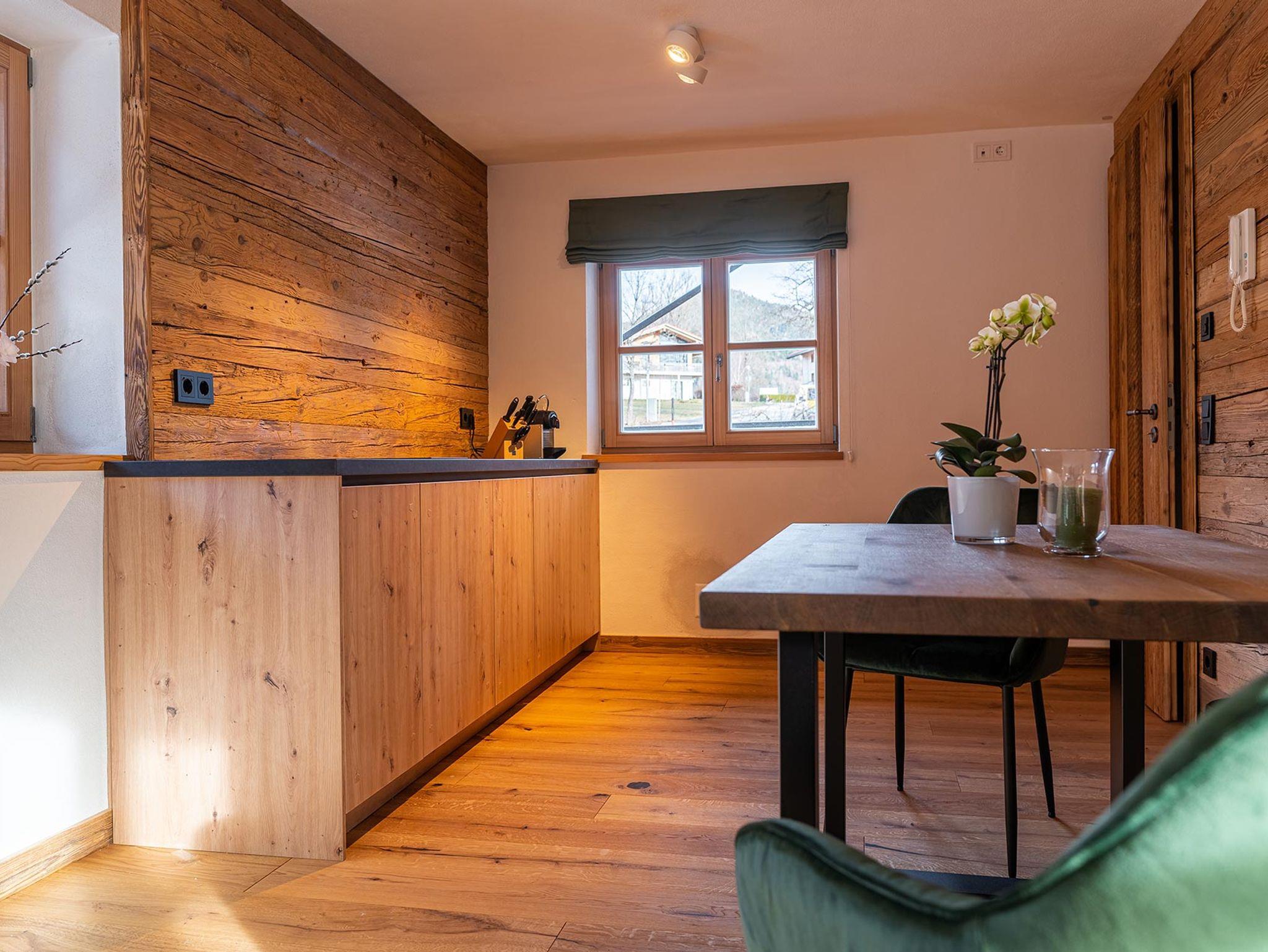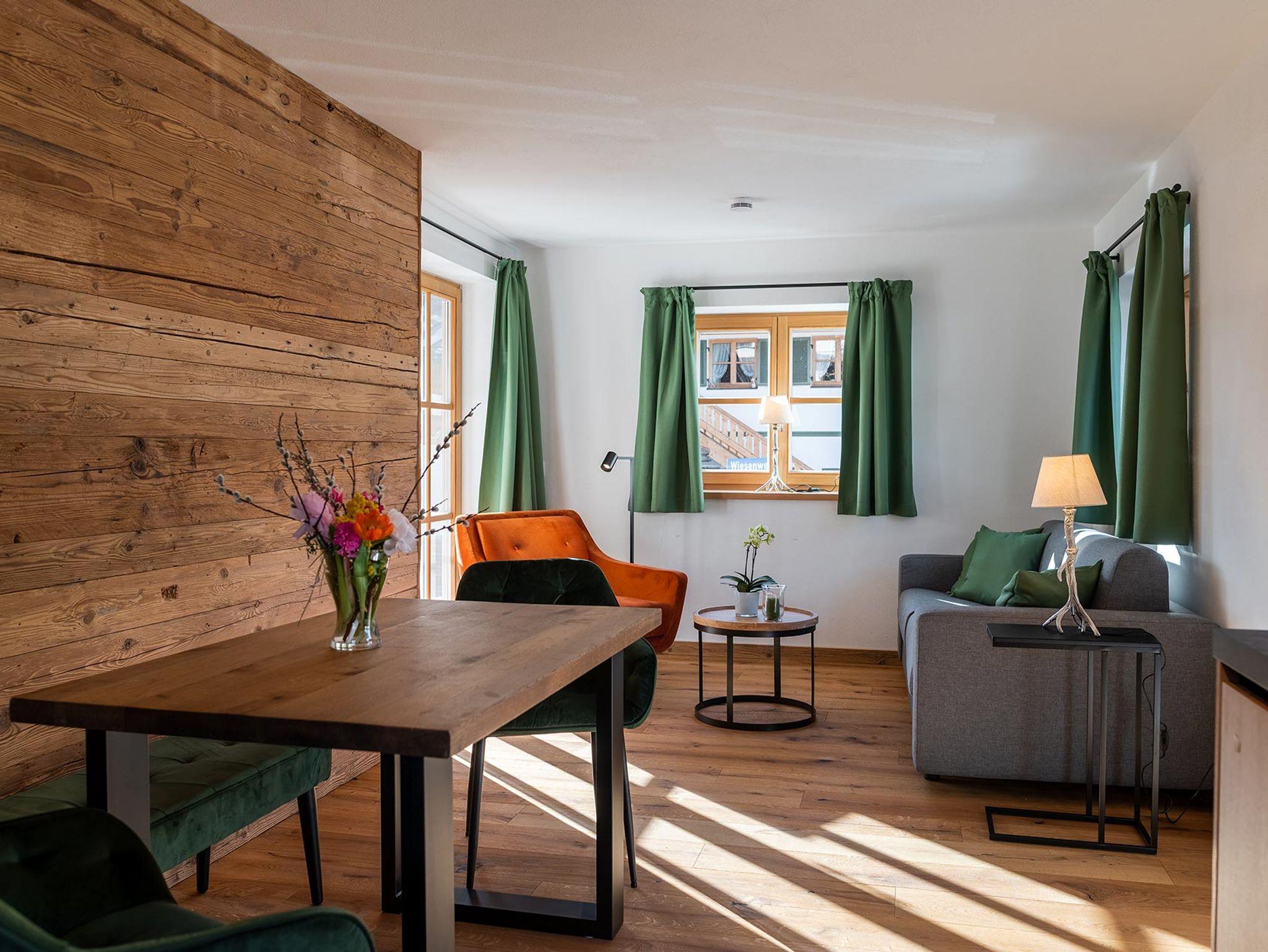 Das Appartement Winklmoos im Chalet Viol ist ca. 50m2 groß, befindet sich im Erdgeschoss und hat eine kleine Terrasse mit herrlicher Süd/West-Ausrichtung. Das Appartement verfügt über ein gemütliches Schlafzimmer mit Boxspringbett, Altholzvertäfelung, TV und einem 1,50m großen Kleiderschrank, sowie die Möglichkeit der zusätzlichen Nutzung einer Schlafcouch im Wohnzimmer. Die Wohnung hat ein schönes Bad mit Regendusche, eine kleine offene Küchenzeile mit portablen Backofen, der bei Bedarf genutzt werden kann, eine gemütliche Sitzecke mit Tisch und eine Sofaecke mit TV. Es gibt einen privaten Parkplatz vor dem Haus.