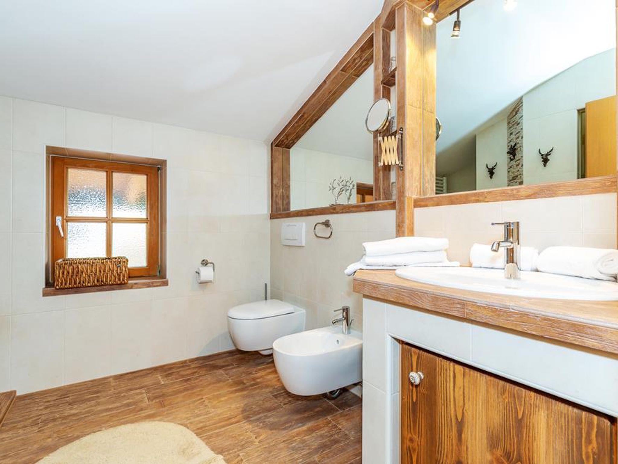 Alle Schlafzimmer verfügen jeweils über ein Doppelbett, sowie Sat-TV-Flachbildschirme. Der geräumige Wohnbereich ist mit viel Liebe zum Detail hochwertig eingerichtet. Entspannen Sie nach einer schönen Wanderung auf der komfortablen Couchgarnitur oder einem der beiden Fernsehsessel. Der eingebaute Kachelofen sorgt gerade im Winter für eine gediegen Stimmung. Der Essbereich punktet mit einem großen Holztisch und hochwertigen Stühlen, sowie mit einer geräumigen Küchenzeile, mit Kühl- und Gefrierschrank, Mikrowelle, Backofen, 4-Platten-Ceranfeld, Geschirrspüler. Hunde sind hier herzlich willkommen. Im Chalet Bergromantik gibt es zwei Bäder, in beiden befindet sich ein WC. Auch eine Waschmaschine mit Wäschetrockner dürfen unsere Gäste gerne benutzen. Des Weiteren bleibt Ihre Winterausrüstung stets trocken – dank Skischuhalter mit Skischuhheizung. Auch Ihr Auto bleibt in der Garage trocken. Auf dem Stellplatz vor der Garage können ein bis zwei PKWs parken.