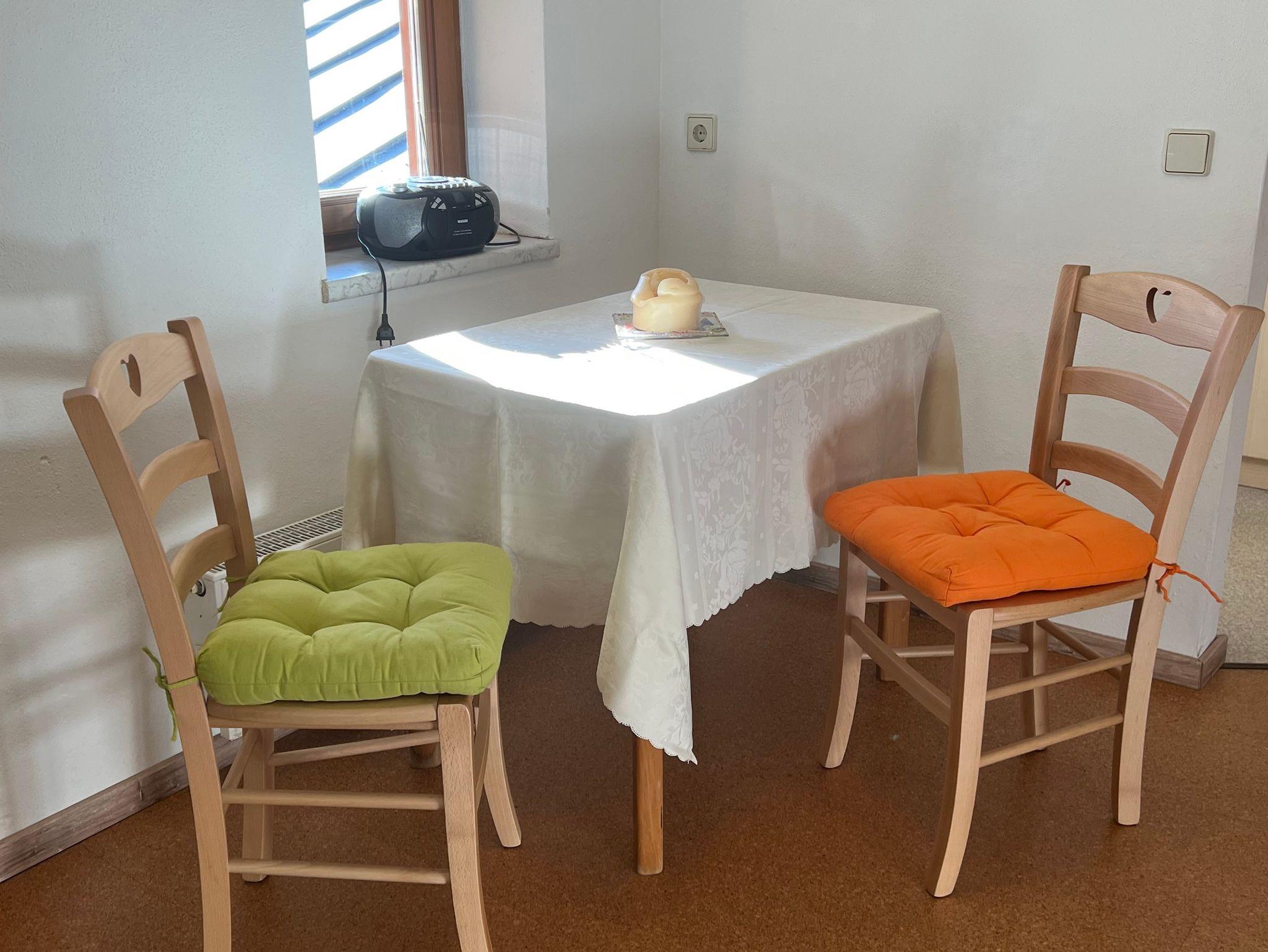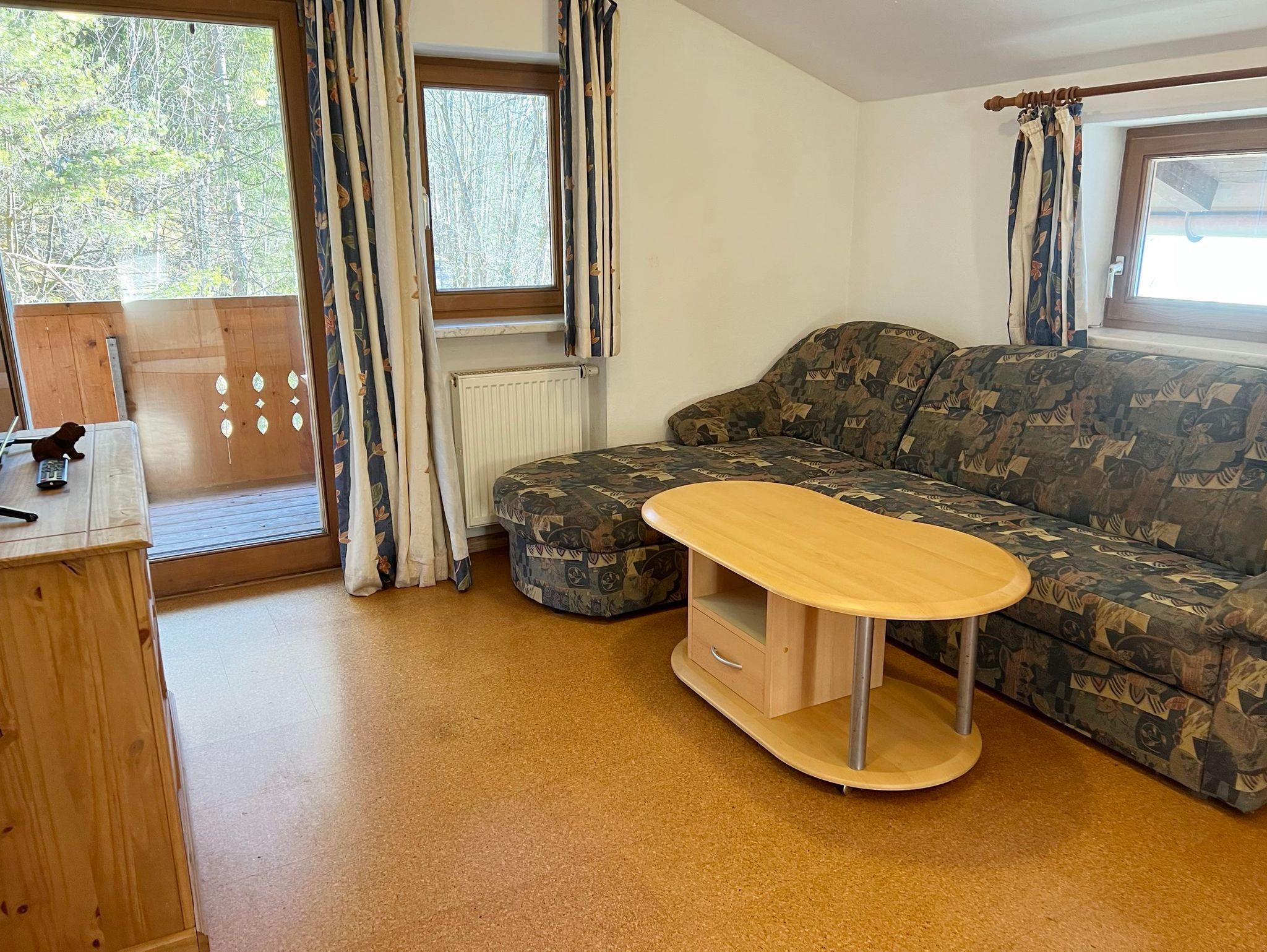 Massivholzmöbel im Schlafzimmer und Wohnzimmer und eine Übereck-Küche sorgen für Gemütlichkeit. Auf der Kommode steht der Fernseher und auf der Fensterbank das Radio. Die Küche hat Kühlschrank, Backofen, Vierplattenherd, Mikrowelle, Toaster, Kaffeemaschine, Wasserkocher und ist gut ausgestattet. Daneben befindet sich auch eine Extraessecke. Das Schlafzimmer verfügt über Schrank, Extrasofa und separaten Zugang zum Balkon. Eine eigene Garderobe vor der Wohnung sorgt für Ordnung. Die Wohnung ist mit warmem Korkparkettboden ausgestattet. Bettwäsche und Handtücher werden gestellt. Auf dem beleuchtbaren Balkon mit uriger Holzbänken blicken Sie über das ganze Reit im Winkler Tal und in die Berge und können in der Morgensonne das Frühstück genießen.