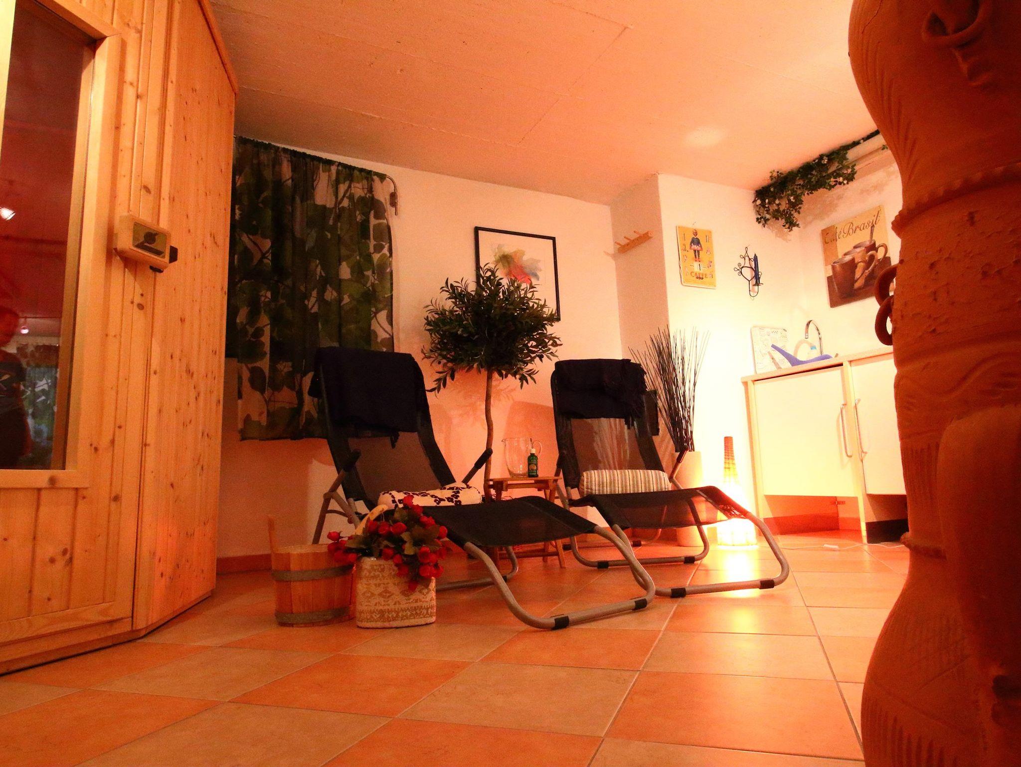 Ferner stehen eine Sauna, ein Solarium, eine große Liegewiese mit Grillplatz, ein kleiner Spielplatz mit Rutsche, Schaukel steht zur Verfügung. (Sauna- und Solarium-Nutzung gegen eine geringe Gebühr)