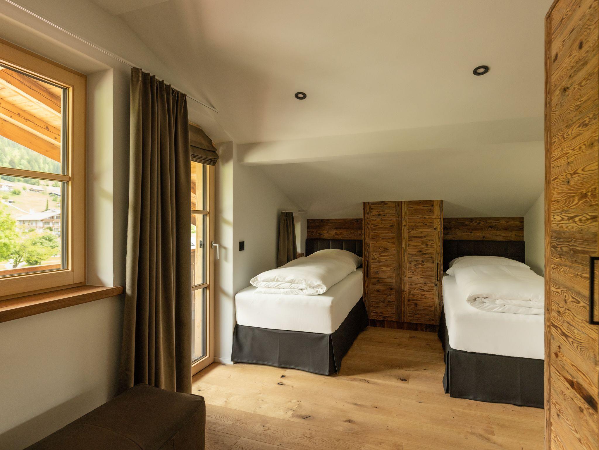 Schlafzimmer 2 mit Boxspring-Einzelbetten, Schrank, Waschtisch, ebenerdiger Regendusche und separatem WC