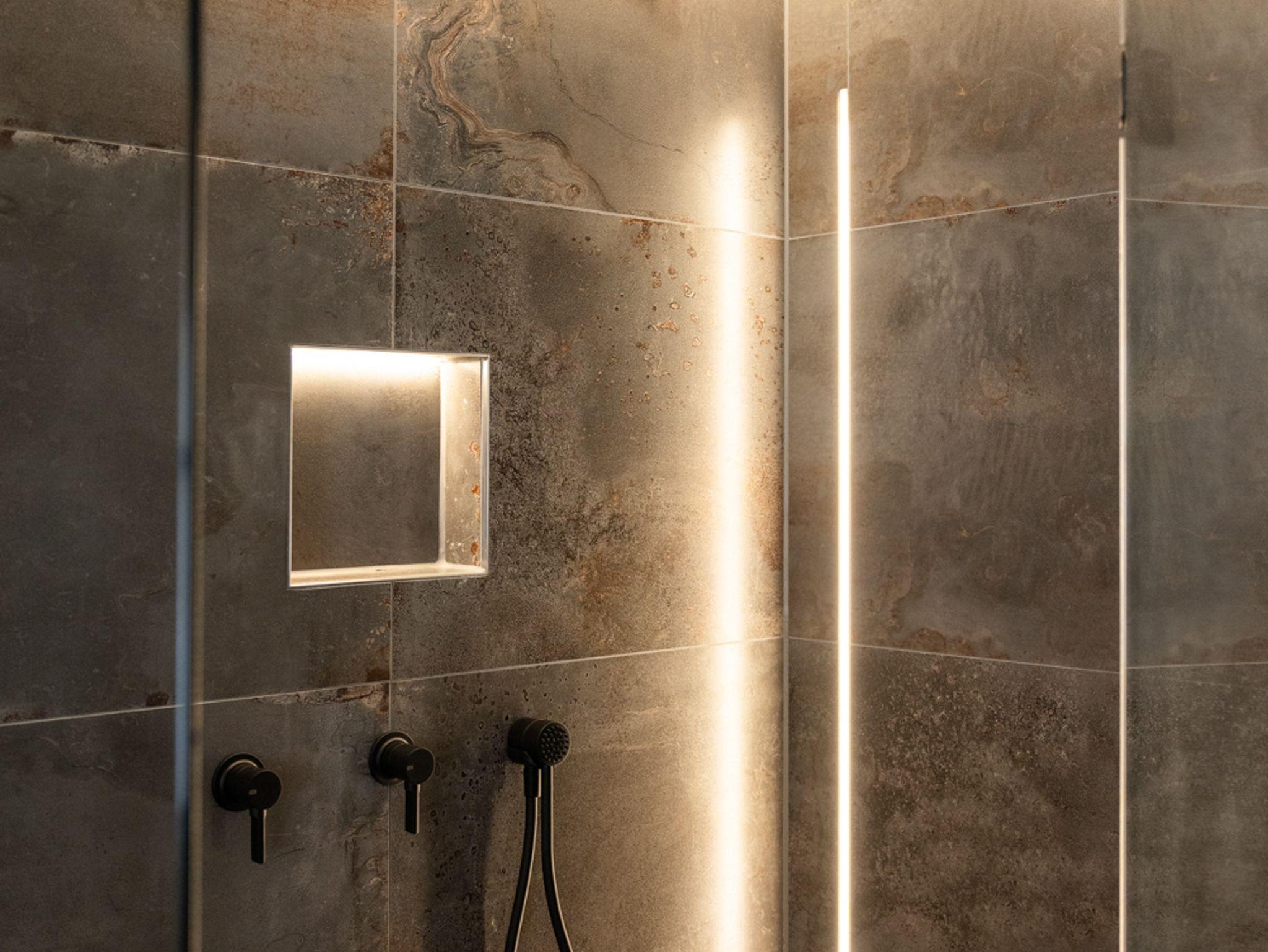 Separates Bad mit ebenerdiger Regendusche, Waschtisch und WC