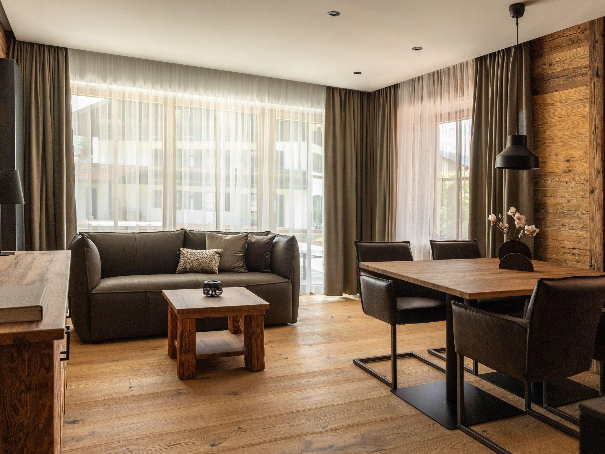 Für alle, die Ruhe mit Stil und Natur mit Komfort verbinden möchten: Sobald Sie Das Denisl betreten, stellt sich ein tiefes Gefühl der Erholung ein. Mitten im Herzen von Reit im Winkl, zentral an der Sonnenloipe, wartet ein neues Apartmenthaus mit 14 stilvollen, hellen Ferienwohnungen voller Flair auf Ihre unvergessliche Zeit im Chiemgau. Viel Altholz, gedeckte Farben, indirekte Beleuchtung, schwarze Armaturen und große Türen zu Balkon oder Terrasse machen Ihre Urlaubstage zu einem echten Design-Erlebnis. Freuen Sie sich auf bestens ausgestattete Küchen, einladende Essbereiche, gemütliche Ledersofas, große Waschtische, kuschelige Boxspringbetten und Regenduschen, die Sie rundum verwöhnen und entspannen lassen. Im Haus zählt der großzügige Aufenthalts- und Eventraum mit 120?m² zu einem beliebten Treffpunkt, um gemütlich zusammenzusitzen, gemeinsam zu feiern oder Tagungen durchzuführen – ausgestattet mit Küche, Theke, Tontechnik, Getränke-/Snackautomat und einer großen Sonnenterrasse mit Blick ins Grüne. Für Aktive Urlauber beginnen direkt vor der Tür idyllische Wanderwege, tolle Biketouren und gepflegte Skiloipen im Winter. Ihre Ausrüstung ist dabei bestens aufgehoben: im großen Skikeller mit Spinden und Skiwerkstatt sowie im Radlhäusl mit Fahrraddusche, Werkstatt und Spinden. Für entspannte Momente sorgt die charmante Sauna im Garten – Ihr Rückzugsort für Körper und Geist. Familien freuen sich über den Spielplatz und das Freibad ganz in der Nähe, aktive Urlauber schätzen schätzen die Haltestelle für den Wanderbus direkt hinter dem Haus. Kostenlose Parkplätze sind in ausreichender Anzahl im Hof vorhanden und wer elektrisch unterwegs ist, findet eine E-Ladestation bei der nahen Tourist-Info.