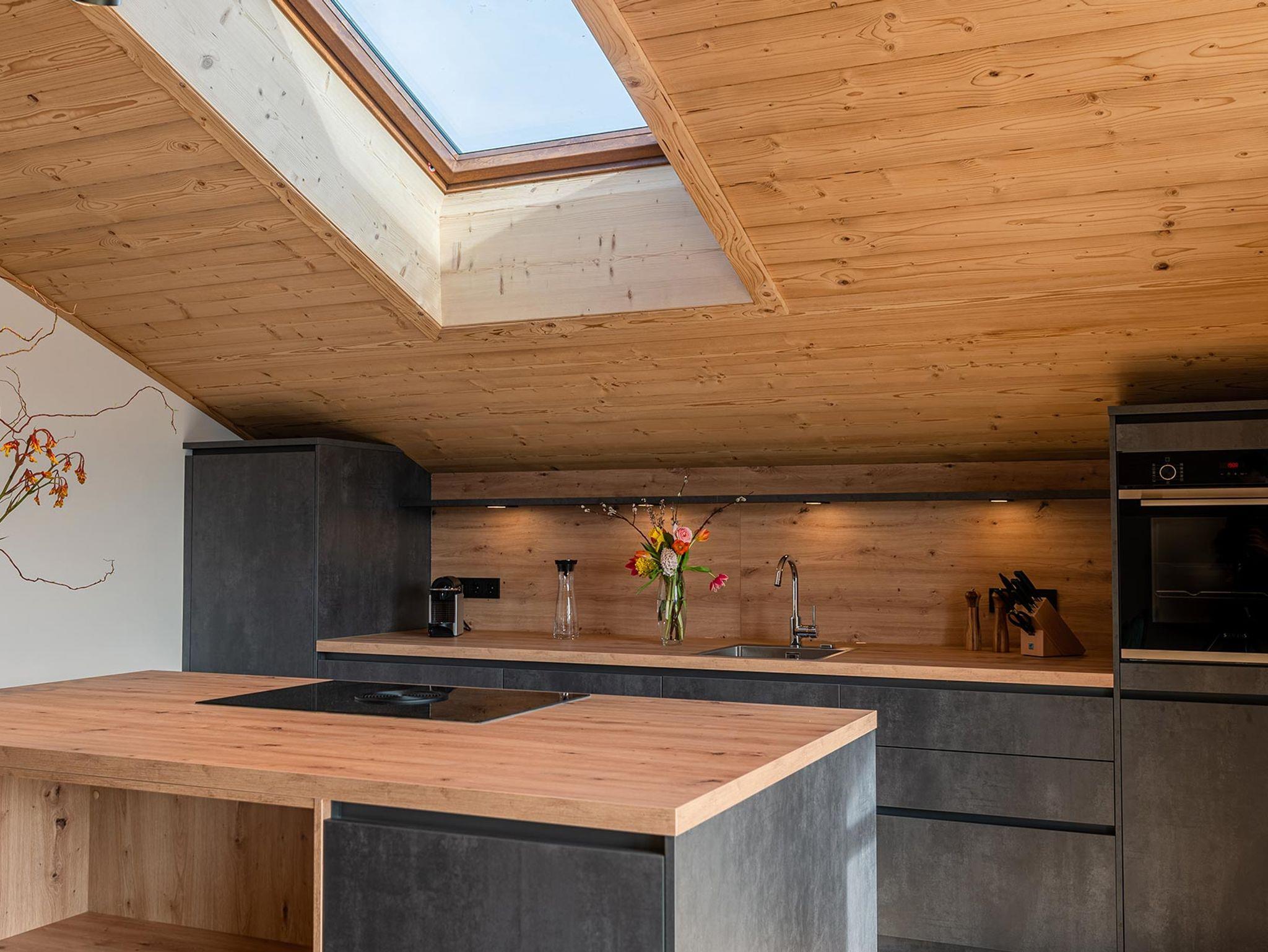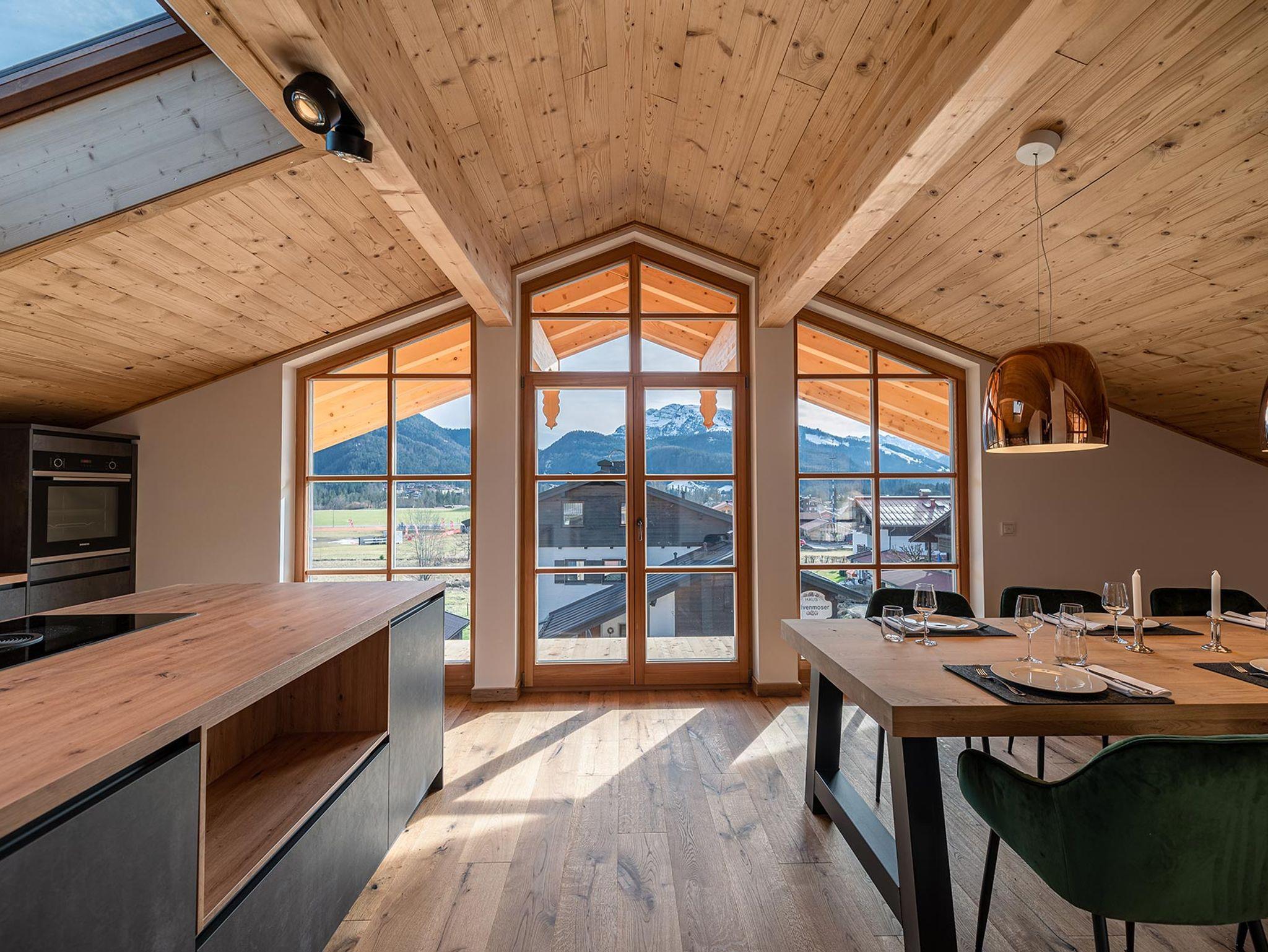 Die Appartement Steinplatte ist das Größte im Chalet Viol mit ca. 160m2 verteilt auf 2 Etagen. Die hochwertig eingerichtete Wohnung befindet sich im ersten Stock und Dachgeschoss und verfügt über eine schöne und hochwertig eingerichtete Essküche mit vollausgestatteter Küchenzeile und einladendem Küchenblock und einem großem Eichentisch, der Platz für 6-8 Personen bietet. Von der Küche aus hat man durch die Panoramafenster einen schönen Blick auf das Kaisergebirge. Im Dachgeschoss befindet sich außerdem eine große Sitzecke mit Glaskamin, TV, einer schönen Leseecke und einer einladenden Loggia mit Westausrichtung für z.B. schöne Abende im Freien. Die Wohnung Steinplatte verfügt über 3 gemütliche Schlafzimmer im Obergeschoss mit Boxspringbetten, Altholzvertäfelung und jeweils einem TV, sowie 2 schöne Bäder mit Badewanne und zusätzlicher begehbarer Regendusche. Das Highlight auf dieser Etage ist der Saunaraum mit einer Sauna für 4-5 Personen, 2 Liegen und direktem Zugang zum Balkon. Zum Appartment gehören 2 Stellplätze vor dem Haus.