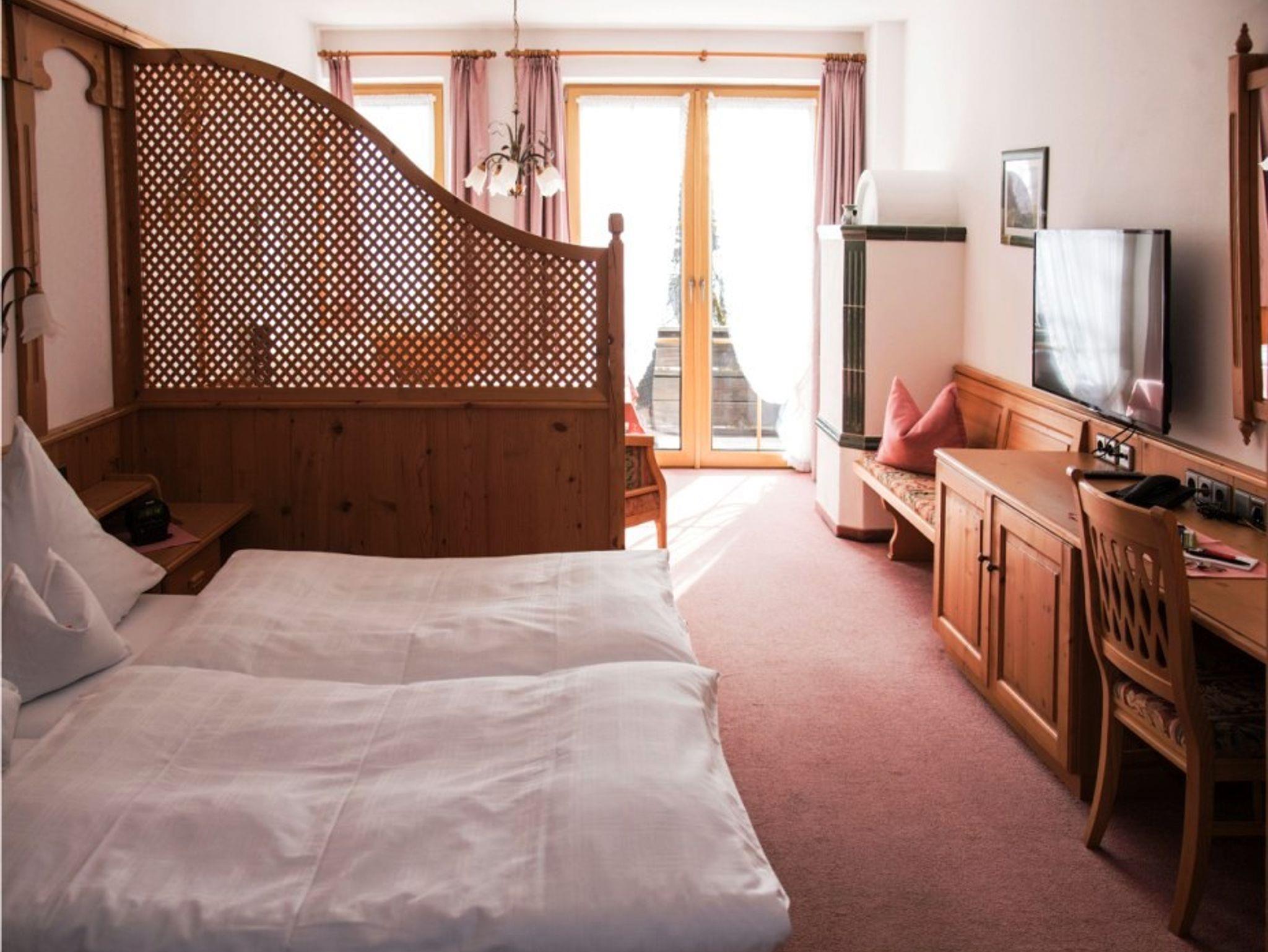 Schöner Wohn-Schlafraum mit abgetrennter Schlafnische mit Doppelbett, gemütlicher Sitz- und Essecke im Landhausstil in Altholz mit Kachelofen eingerichtet. Zimmersafe. Kochnische mit Mikro/Spülmaschine und Dusche/WC. Vom Südbalkon haben Sie den Blick zum Dorfplatz bis zum Unterberg und Kaisergebirge mit ganztägiger Sonne.