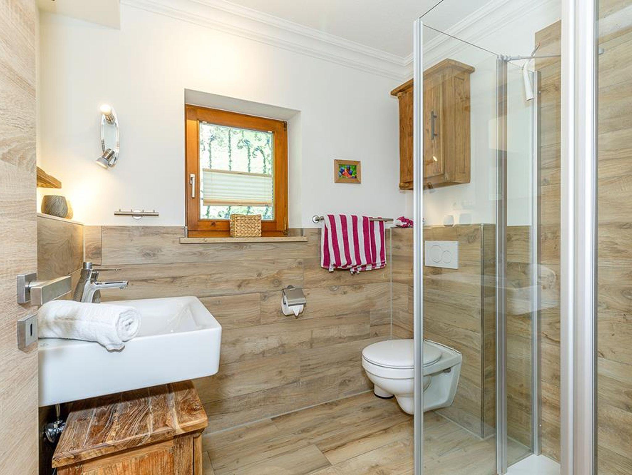 In der unteren Etage befindet sich die Garderobe, das Kinderzimmer, die Waschküche mit Waschmaschine und Trockner, ein sehr modernes Bad mit Dusche und WC. Außerdem ist hier das größte Schlafzimmer mit Zugang zum Garten und eigenem Fernseher und zwei gemütlichen Ausruhsesseln. Ein gepflegtes offenes Treppenhaus führt in die mittlere Etage und trägt zum großzügigen Wohngefühl bei. In der mittleren Etage des dreistöckigen Häusles befindet sich das große und gemütliche Wohnzimmer mit großem Fernseher mit DVD -Player und ein großes Esszimmer. Am massiven Essentisch können alle Gäste gemütlich sitzen. Die putzige Landhausküche ist bestens ausgestattet, so dass die Zubereitung der eigenen Speisen Spaß macht. Durch zwei Kühlschränke mit je einem Eisfach gibt es genug Platz für die Eigenversorgung. Außerdem befindet sich im zweiten Stock noch ein kleines Zimmer mit kleinem Fernseher. Die Doppelausziehcouch dieses Zimmers bietet eine zusätzliche Schlafgelegenheit (Ausweichplatz). Darüber hinaus ist in dieser Etage noch ein kleines Gäste-WC. Aus dem großzügigen Wohnzimmer mit gemütlicher Couch geht es auf den Eckbalkon mit wunderbarem Ausblick in die Natur. Das Bachplätschern und das Vogelgezwitscher sind die einzigen Geräusche, die hier zu hören sind. In der obersten Etage findet sich das größere hochwertige Bad mit übergroßer Dusche, sowie zwei große Schlafzimmer, wobei eines den Zugang zum kuscheligen obersten Giebelbalkon hat. Für Kinder: 2 große Lego -Duplo Kisten, Basketballkorb im Hof und Gesellschaftsspiele, Babyhochstuhl, Kinderbett und Töpfchen vorhanden.