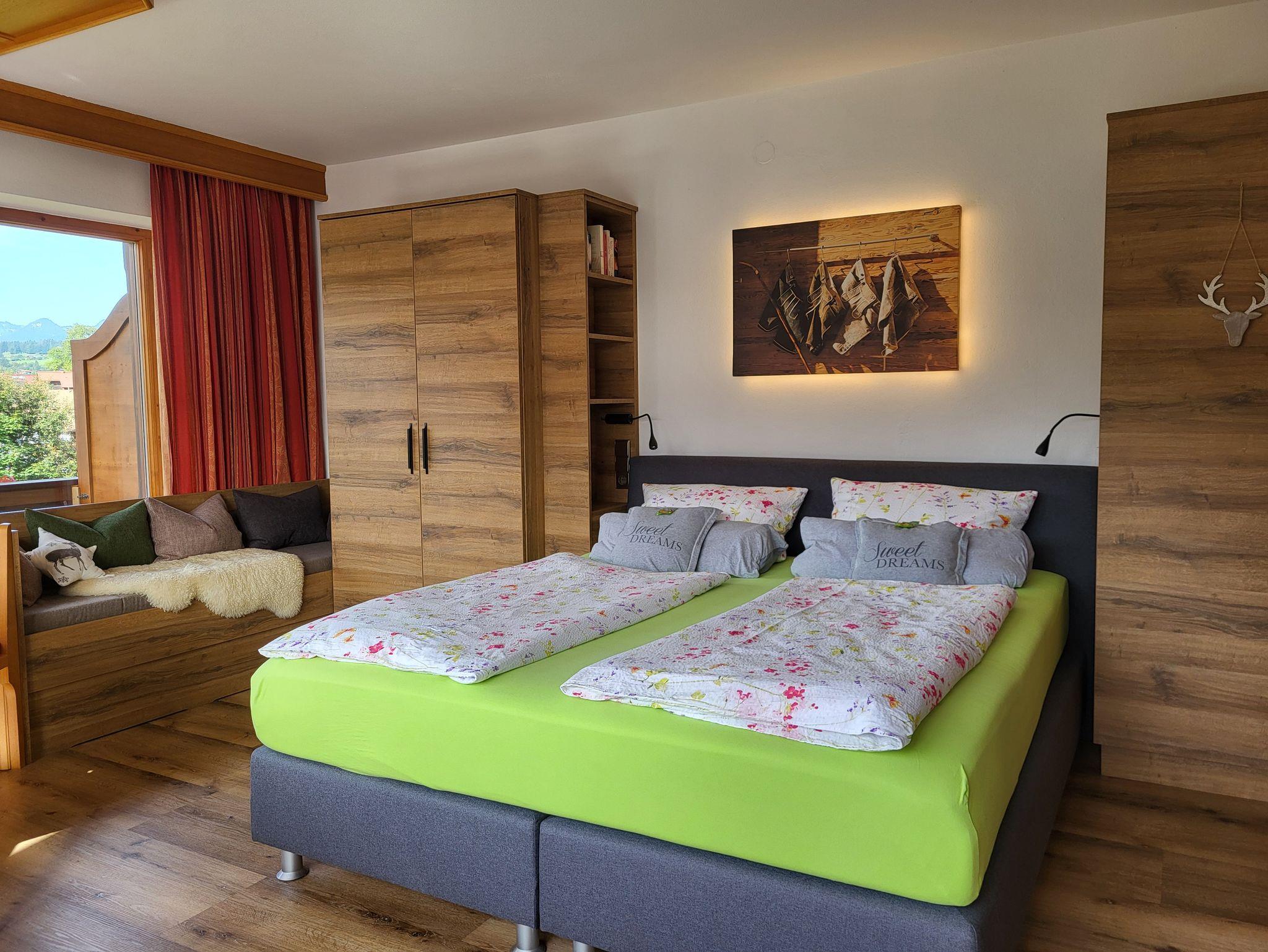 Sehr helles Studio Apartment mit 40 m2 in der 1. Etage, kombinierter Wohn-/Schlafraum mit Sitz- bzw. Essecke aus Naturholz und kleiner Küchenzeile, Boxspringbett, kleines Sofa am Panoramafenster und großem Balkon mit Morgen- und Abendsonne und Bergblick und neuem Vinyldekorboden in Eichenoptik.